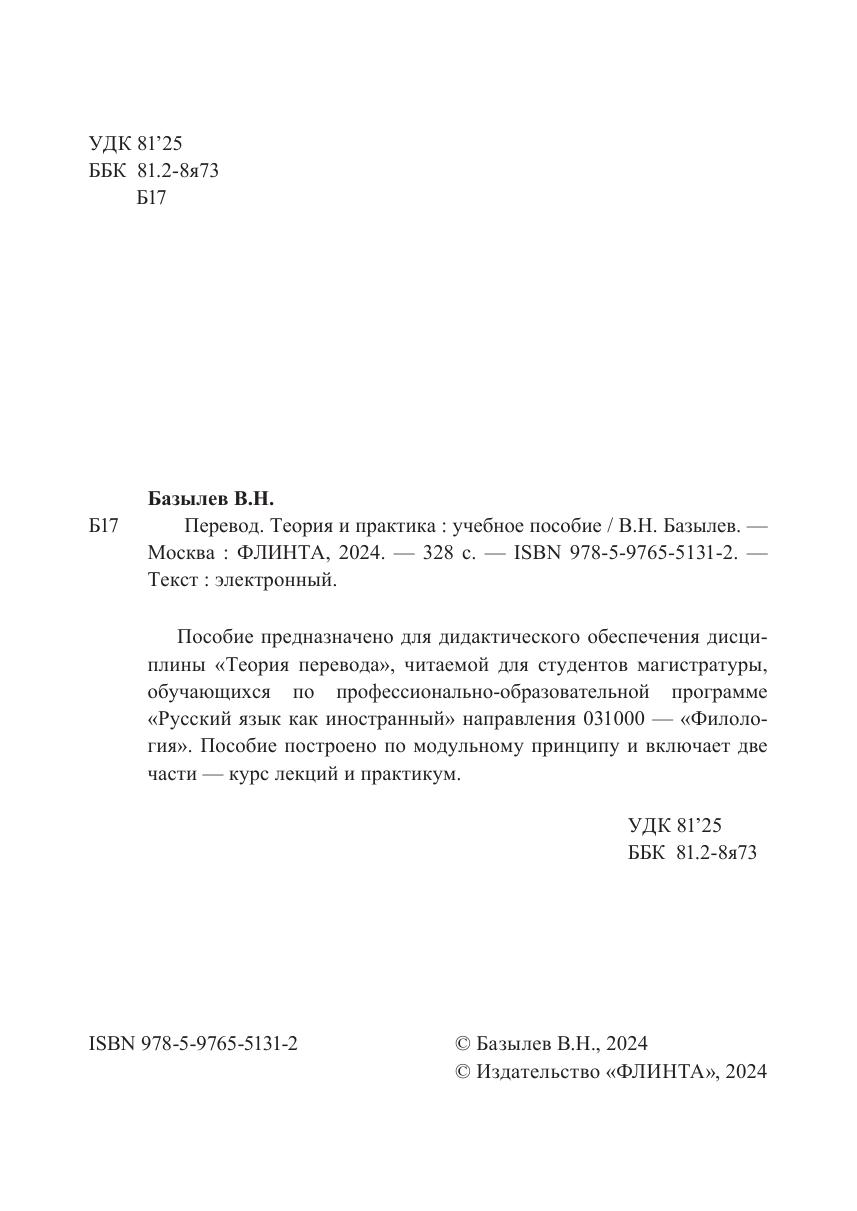 Пособие предназначено для дидактического обеспечения дисциплины «Теория перевода», читаемой для студентов магистратуры, обучающихся по профессионально-образовательной программе «Русский язык как иностранный» направления 031000 — «Филология». Пособие построено по модульному принципу и включает две части — курс лекций и практикум.