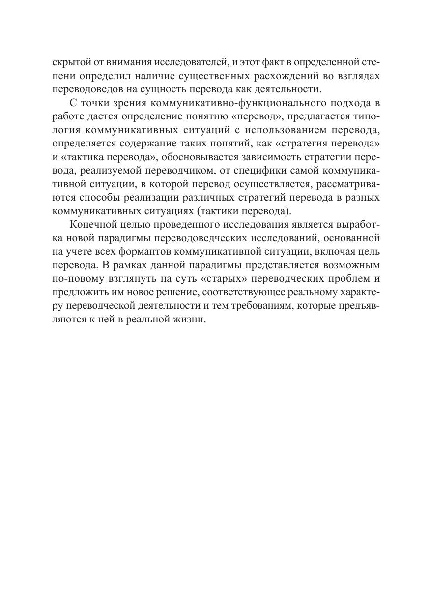 Предлагаемая читателю монография представляет собой опыт изучения закономерностей перевода с точки зрения коммуникативно-функционального подхода. В работе предлагается классификация коммуникативных ситуаций с использованием перевода, выделяются различные стратегии перевода, а также переводческие тактики, обеспечивающие реализацию соответствующих стратегий в рамках различных коммуникативных ситуаций. Излагаются основные положения коммуникативно-функционального подхода к переводу.