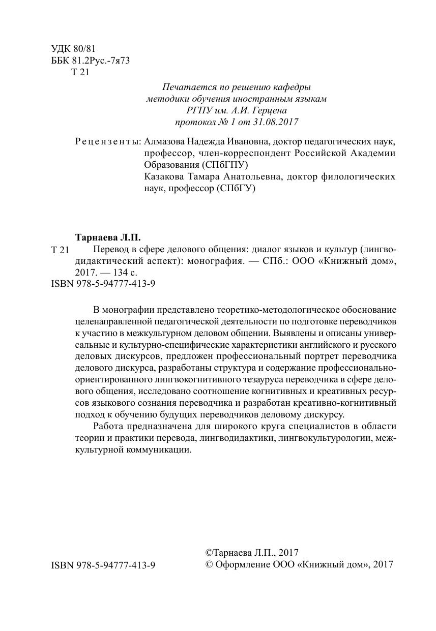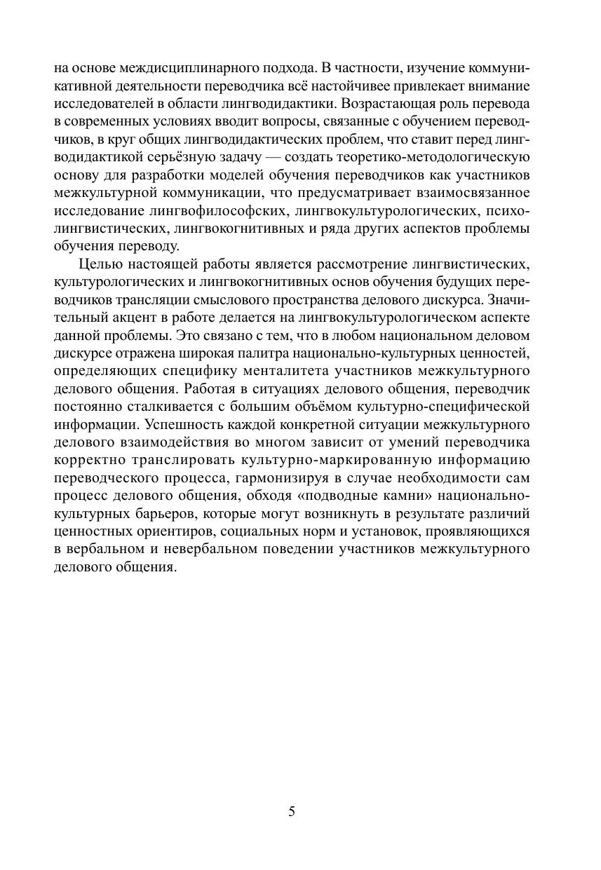В монографии представлено теоретико-методологическое обоснование целенаправленной педагогической деятельности по подготовке переводчиков к участию в межкультурном деловом общении. Выявлены и описаны универсальные и культурно-специфические характеристики английского и русского деловых дискурсов, предложен профессиональный портрет переводчика делового дискурса, разработаны структура и содержание профессиональноориентированного лингвокогнитивного тезауруса переводчика в сфере делового общения, исследовано соотношение когнитивных и креативных ресурсов языкового сознания переводчика и разработан креативно-когнитивный подход к обучению будущих переводчиков деловому дискурсу. Работа предназначена для широкого круга специалистов в области теории и практики перевода, лингводидактики, лингвокультурологии, межкультурной коммуникации.
