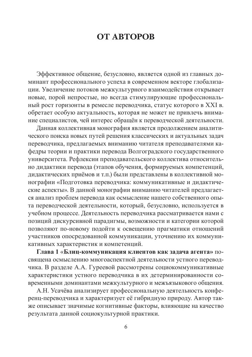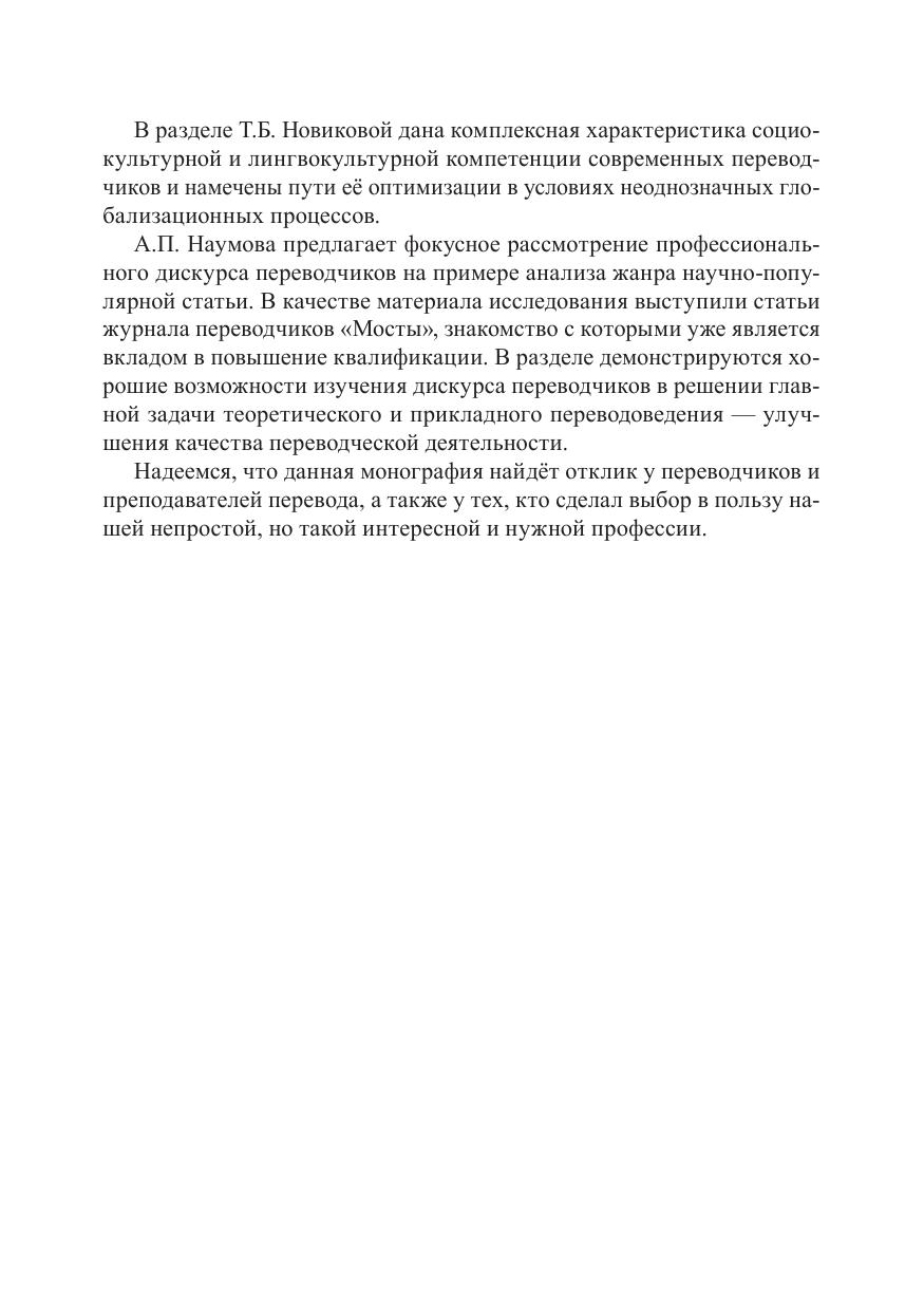 В монографии рассматриваются проблемы перевода, которые определя ются деятельностью переводчика в современном коммуникативном пространстве. Авторы обращаются к аспектам работы переводчика в разных дискурсах — медицинском, нефтяном, юридическом, уделяют особое внимание про фильным компетенциям и социокоммуникативным характеристикам устного переводчика. В работе предлагается анализ значимых для оптимизации процесса перевода интернет-ресурсов и информационных технологий, определяются роль и функции разных форм профессиональных рефлексий в совершенствовании компетенций переводчиков.