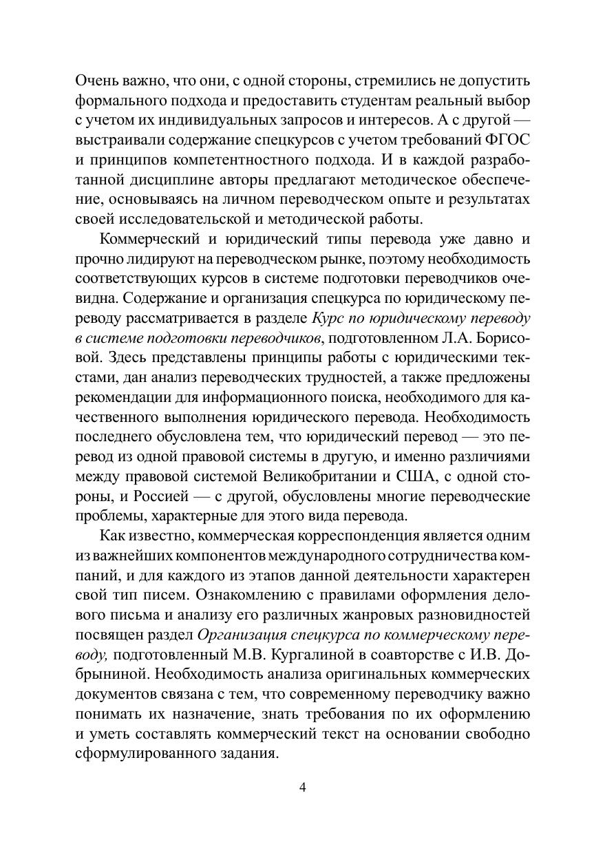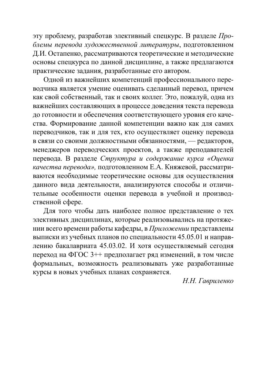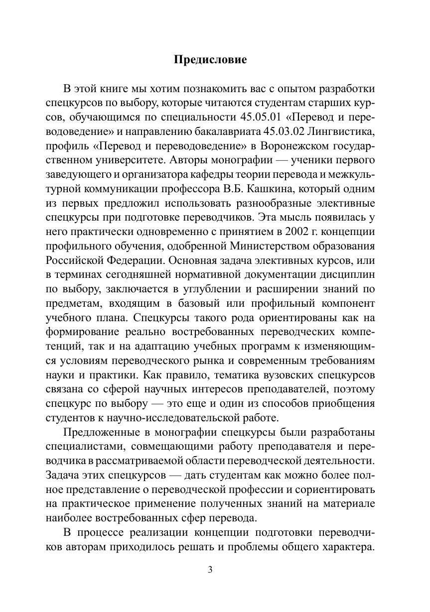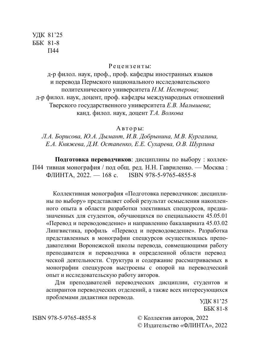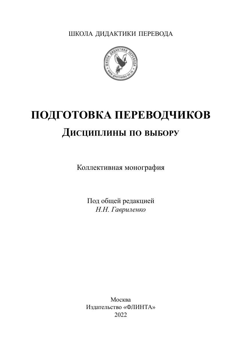 Коллективная монография «Подготовка переводчиков: дисциплины по выбору» представляет собой результат осмысления накопленного опыта в области разработки элективных спецкурсов, предназначенных для студентов, обучающихся по специальности 45.05.01 «Перевод и переводоведение» и направлению бакалавриата 45.03.02 Лингвистика, профиль «Перевод и переводоведение». Разработка представленных в монографии спецкурсов осуществлялась преподавателями Воронежской школы перевода, совмещающими работу преподавателя и переводчика в определенной области переводческой деятельности. Структура и содержание рассматриваемых в монографии спецкурсов выстроены с опорой на переводческий опыт и исследовательскую работу авторов.