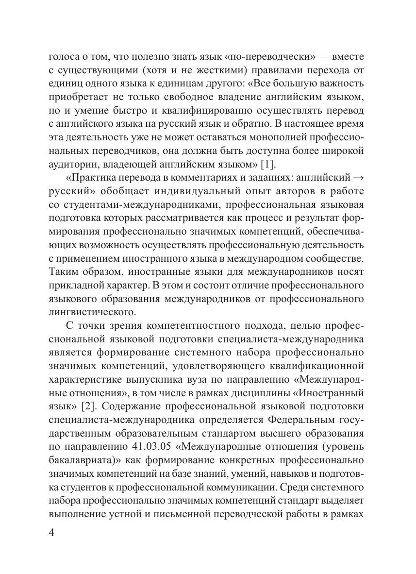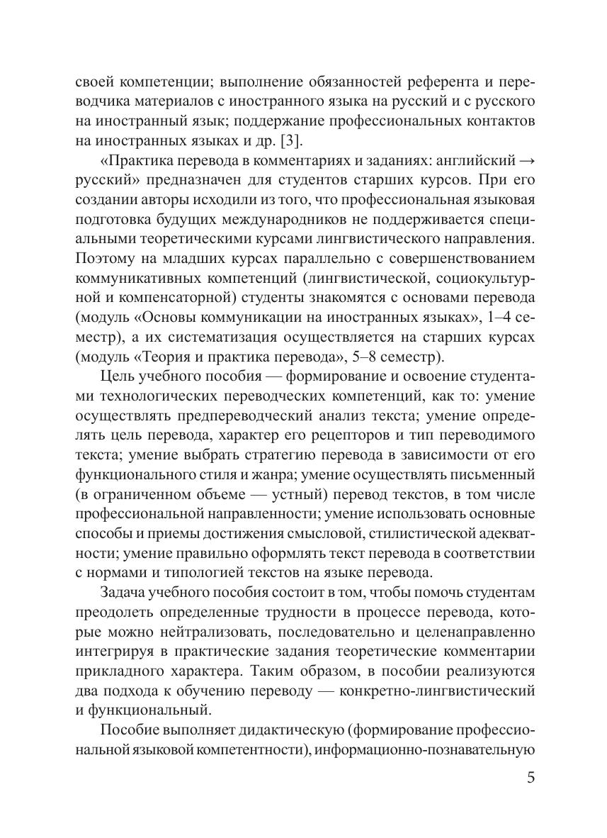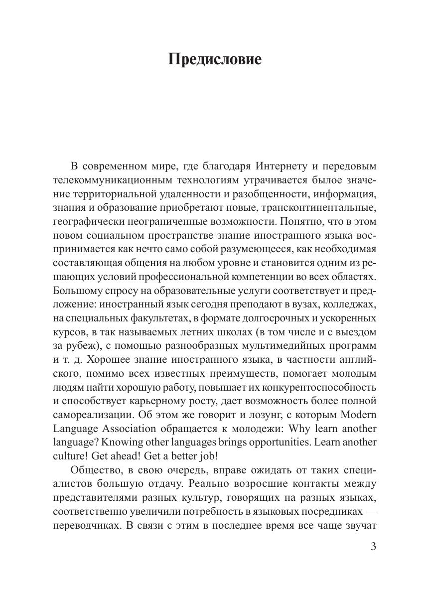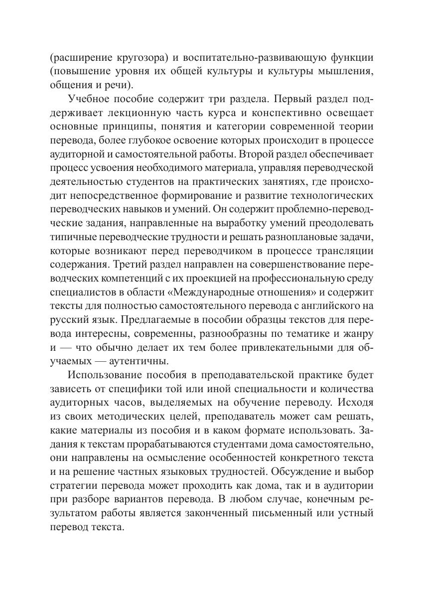 Учебное пособие направлено на формирование профессиональной компетентности будущих переводчиков в области письменного и в ограниченном объеме устного перевода (с английского языка на русский). Представлена оригинальная авторская методика обучения переводу. В учебных целях привлечены как узкоспециальные тексты, так и тексты общенаучного и официального характера, а также профессионально ориентированные тексты по международным отношениям. Учебное пособие может использоваться для аудиторных занятий (семинары по курсам теории и практики перевода), а также для самостоятельной работы студентов, начинающих переводчиков и всех, изучающих английский язык в практических целях.