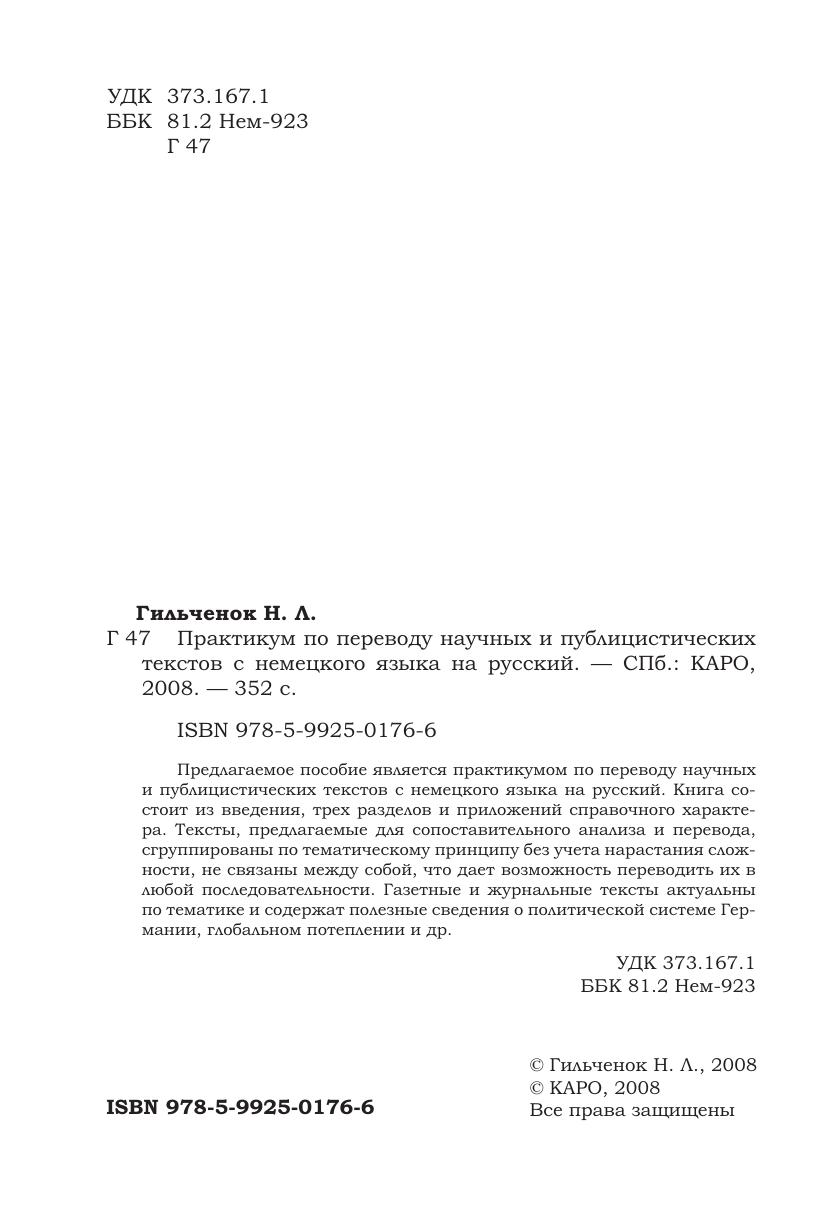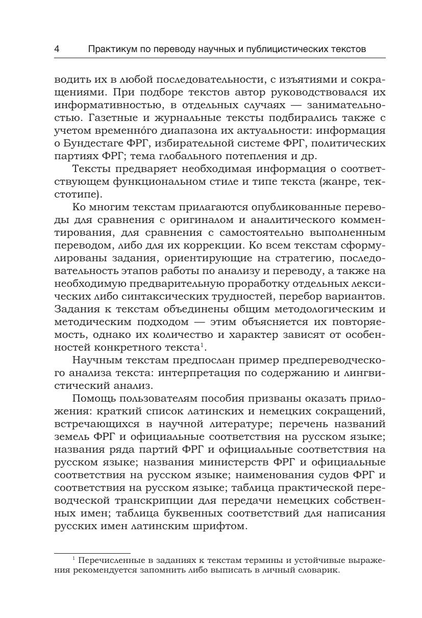 Предлагаемое пособие является практикумом по переводу научных и публицистических текстов с немецкого языка на русский. Книга состоит из введения, трех разделов и приложений справочного характера. Тексты, предлагаемые для сопоставительного анализа и перевода, сгруппированы по тематическому принципу без учета нарастания сложности, не связаны между собой, что дает возможность переводить их в любой последовательности. Газетные и журнальные тексты актуальны по тематике и содержат полезные сведения о политической системе Германии, глобальном потеплении и др.