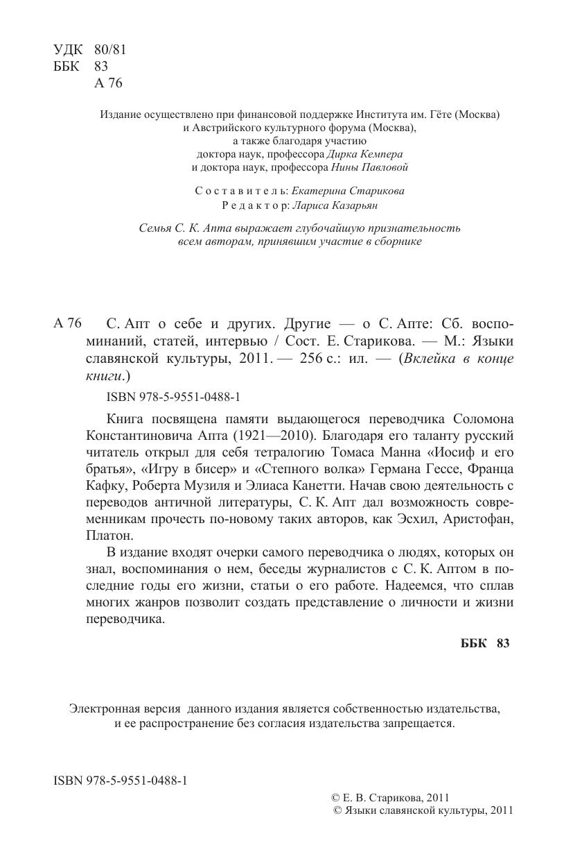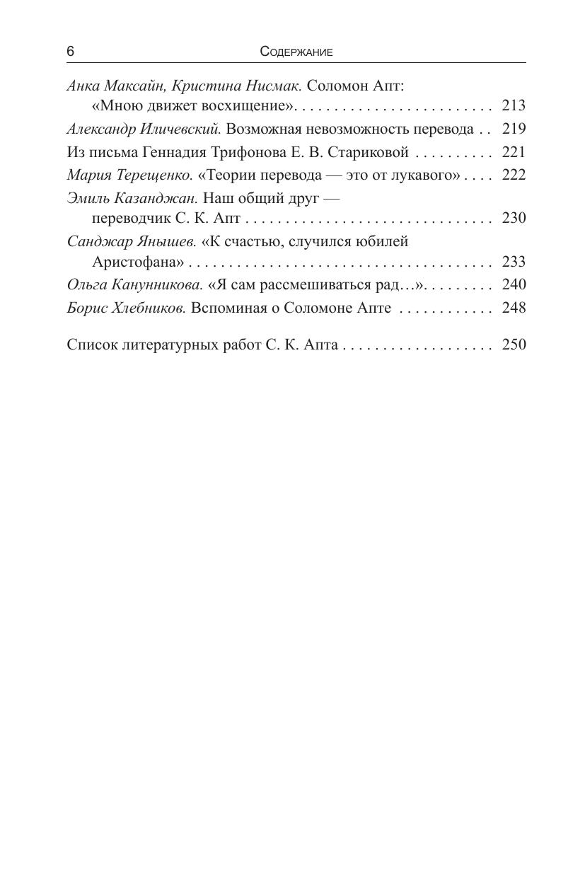 Книга посвящена памяти выдающегося переводчика Соломона Константиновича Апта. Благодаря его таланту русский читатель открыл для себя тетралогию Томаса Манна «Иосиф и его братья», «Игру в бисер» и «Степного волка» Германа Гессе, Франца Кафку, Роберта Музиля и Элиаса Канетти. Начав свою деятельность с переводов античной литературы, С.К. Апт дал возможность современникам прочесть по-новому таких авторов, как Эсхил, Аристофан, Платон. В издание входят очерки самого переводчика о людях, которых он знал, воспоминания о нем, беседы журналистов с С.К. Аптом в последние годы его жизни, статьи о его работе. Надеемся, что сплав многих жанров позволит создать представление о личности и жизни переводчика.