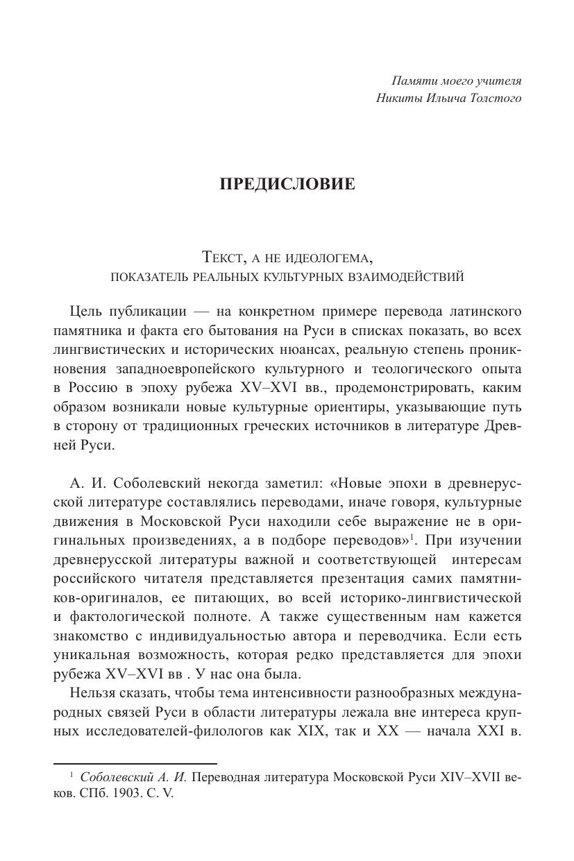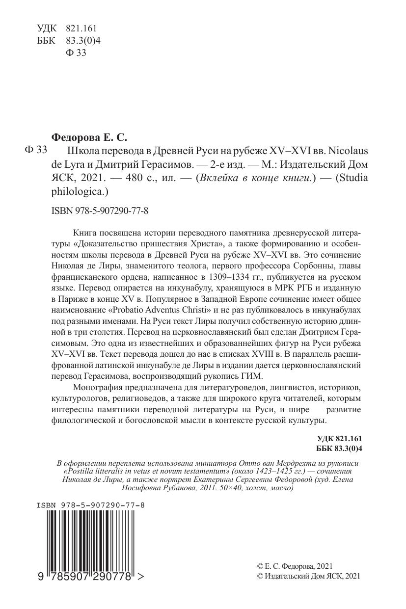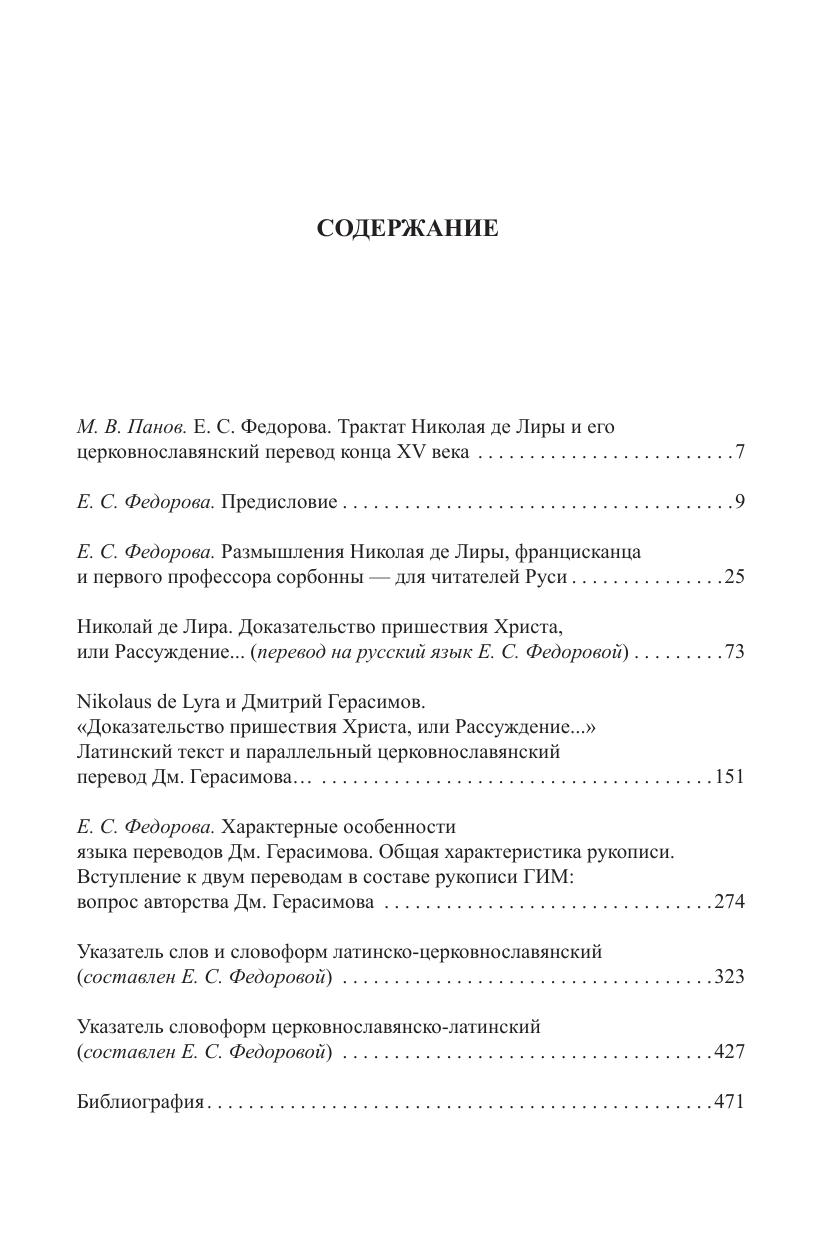 Книга посвящена истории переводного памятника древнерусской литературы «Доказательство пришествия Христа», а также формированию и особенностям школы перевода в Древней Руси на рубеже XV–XVI вв. Это сочинение Николая де Лиры, знаменитого теолога, первого профессора Сорбонны, главы францисканского ордена, написанное в 1309–1334 гг., публикуется на русском языке. Перевод опирается на инкунабулу, хранящуюся в МРК РГБ и изданную в Париже в конце XV в. Популярное в Западной Европе сочинение имеет общее наименование «Probatio Adventus Christi» и не раз публиковалось в инкунабулах под разными именами. На Руси текст Лиры получил собственную историю длинной в три столетия. Перевод на церковнославянский был сделан Дмитрием Герасимовым. Это одна из известнейших и образованнейших фигур на Руси рубежа XV–XVI вв. Текст перевода дошел до нас в списках XVIII в. В параллель расшифрованной латинской инкунабуле де Лиры в издании дается церковнославянский перевод Герасимова, воспроизводящий рукопись ГИМ. Монография предназначена для литературоведов, лингвистов, историков, культурологов, религиоведов, а также для широкого круга читателей, которым интересны памятники переводной литературы на Руси, и шире — развитие филологической и богословской мысли в контексте русской культуры.