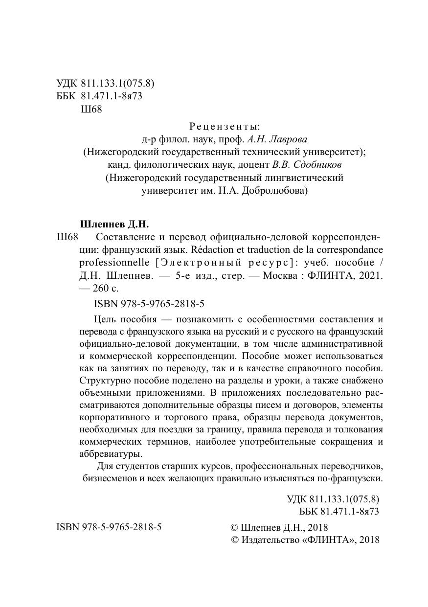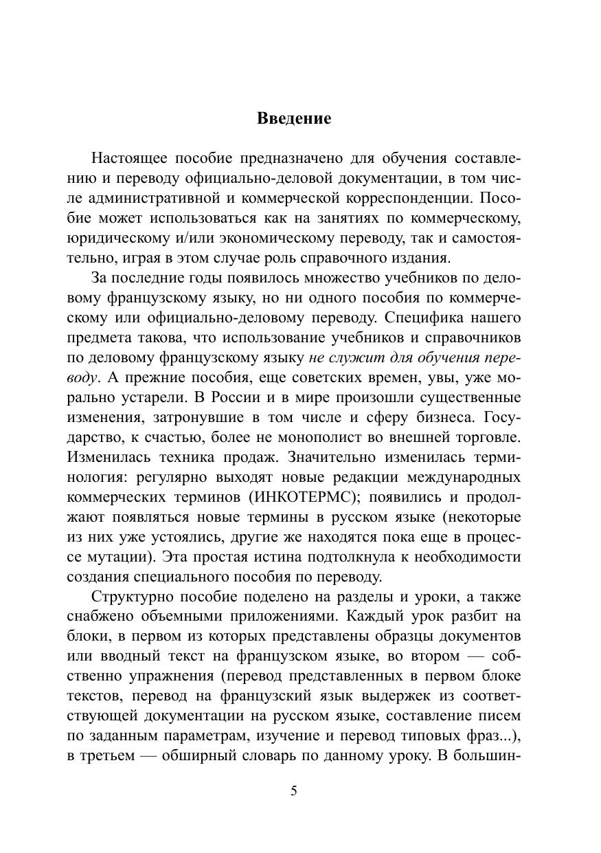 Цель пособия — познакомить с особенностями составления и перевода с французского языка на русский и с русского на французский официально-деловой документации, в том числе административной и коммерческой корреспонденции. Пособие может использоваться как на занятиях по переводу, так и в качестве справочного пособия.