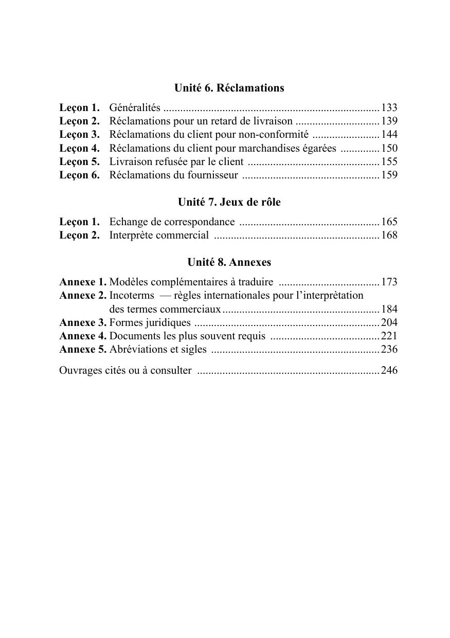 Структурно пособие поделено на разделы и уроки, а также снабжено объемными приложениями. В приложениях последовательно рассматриваются дополнительные образцы писем и договоров, элементы корпоративного и торгового права, образцы перевода документов, необходимых для поездки за границу, правила перевода и толкования коммерческих терминов, наиболее употребительные сокращения и аббревиатуры.