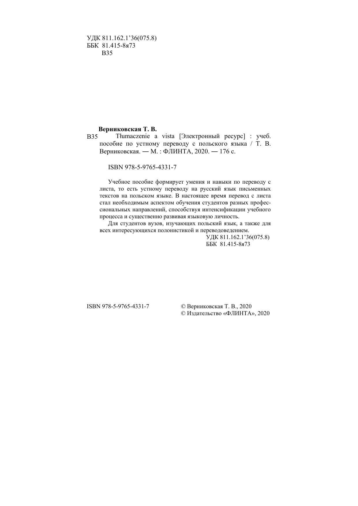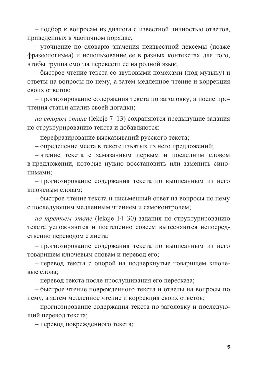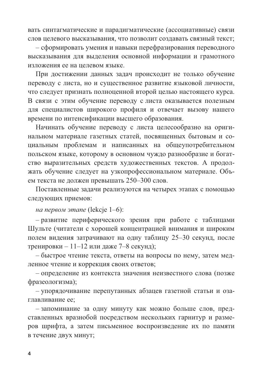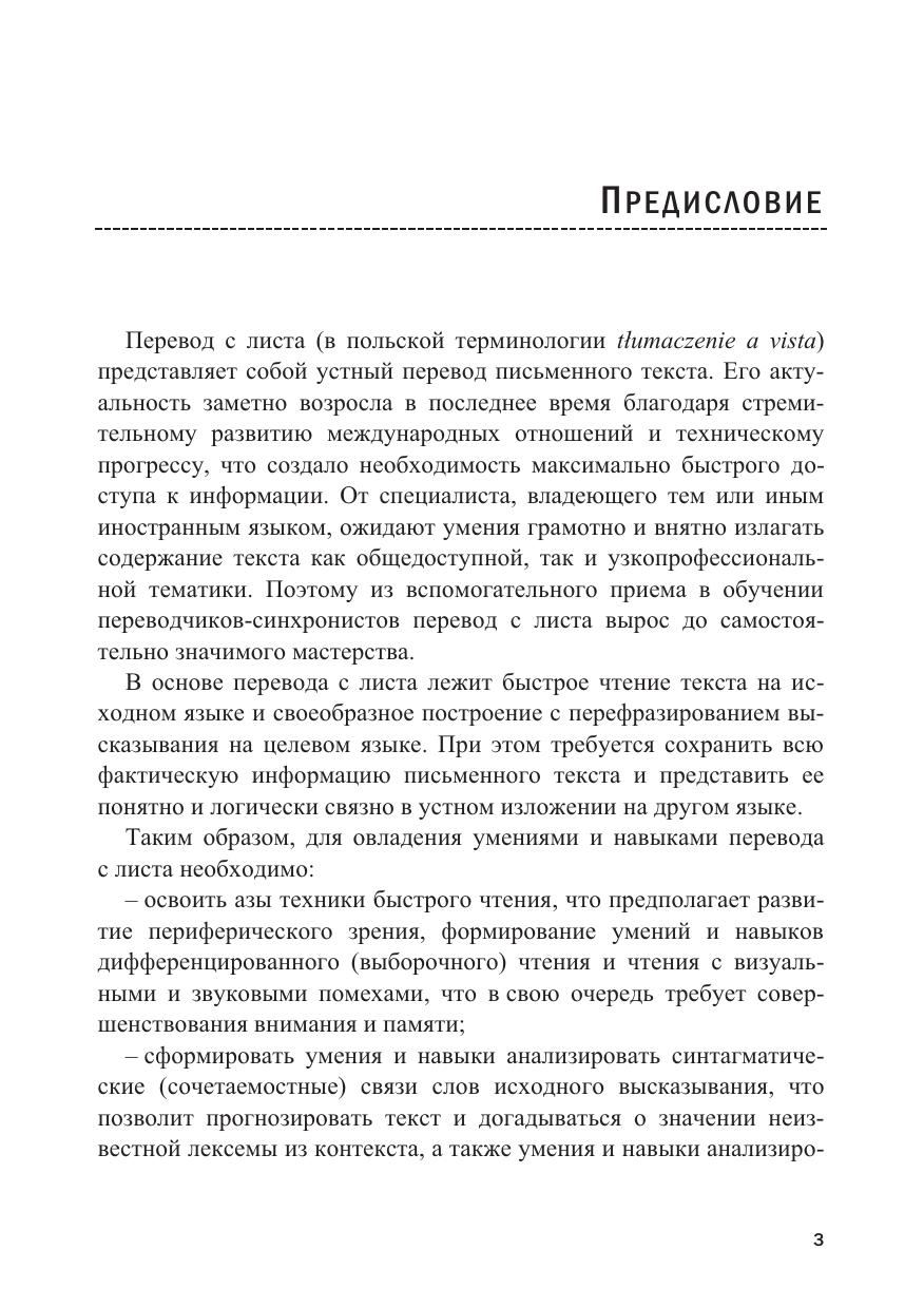 Учебное пособие формирует умения и навыки по переводу с листа, то есть устному переводу на русский язык письменных текстов на польском языке. В настоящее время перевод с листа стал необходимым аспектом обучения студентов разных профессиональных направлений, способствуя интенсификации учебного процесса и существенно развивая языковую личность.