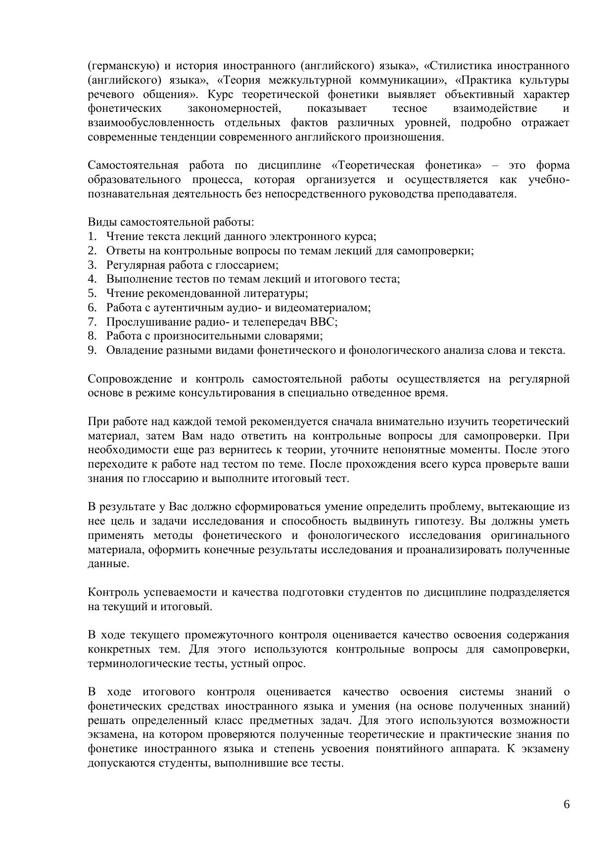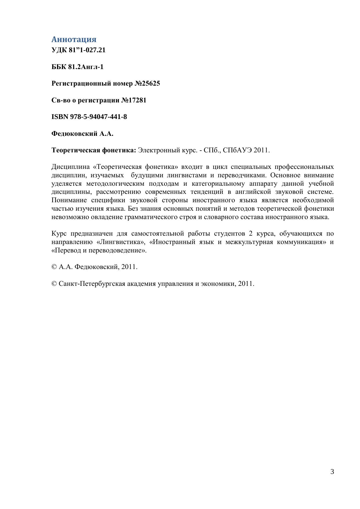 Дисциплина «Теоретическая фонетика» входит в цикл специальных профессиональных дисциплин, изучаемых будущими лингвистами и переводчиками. Основное внимание уделяется методологическим подходам и категориальному аппарату данной учебной дисциплины, рассмотрению современных тенденций в английской звуковой системе. Понимание специфики звуковой стороны иностранного языка является необходимой частью изучения языка. Без знания основных понятий и методов теоретической фонетики невозможно овладение грамматического строя и словарного состава иностранного языка. Курс предназначен для самостоятельной работы студентов 2 курса, обучающихся по направлению «Лингвистика», «Иностранный язык и межкультурная коммуникация» и «Перевод и переводоведение».