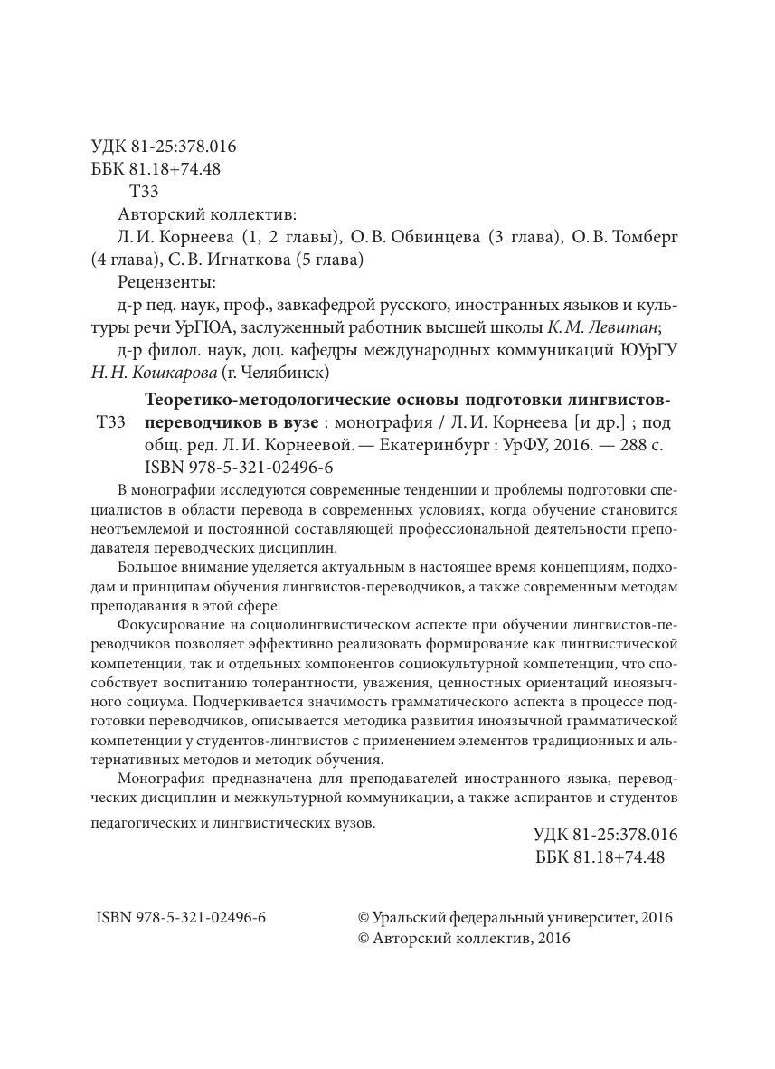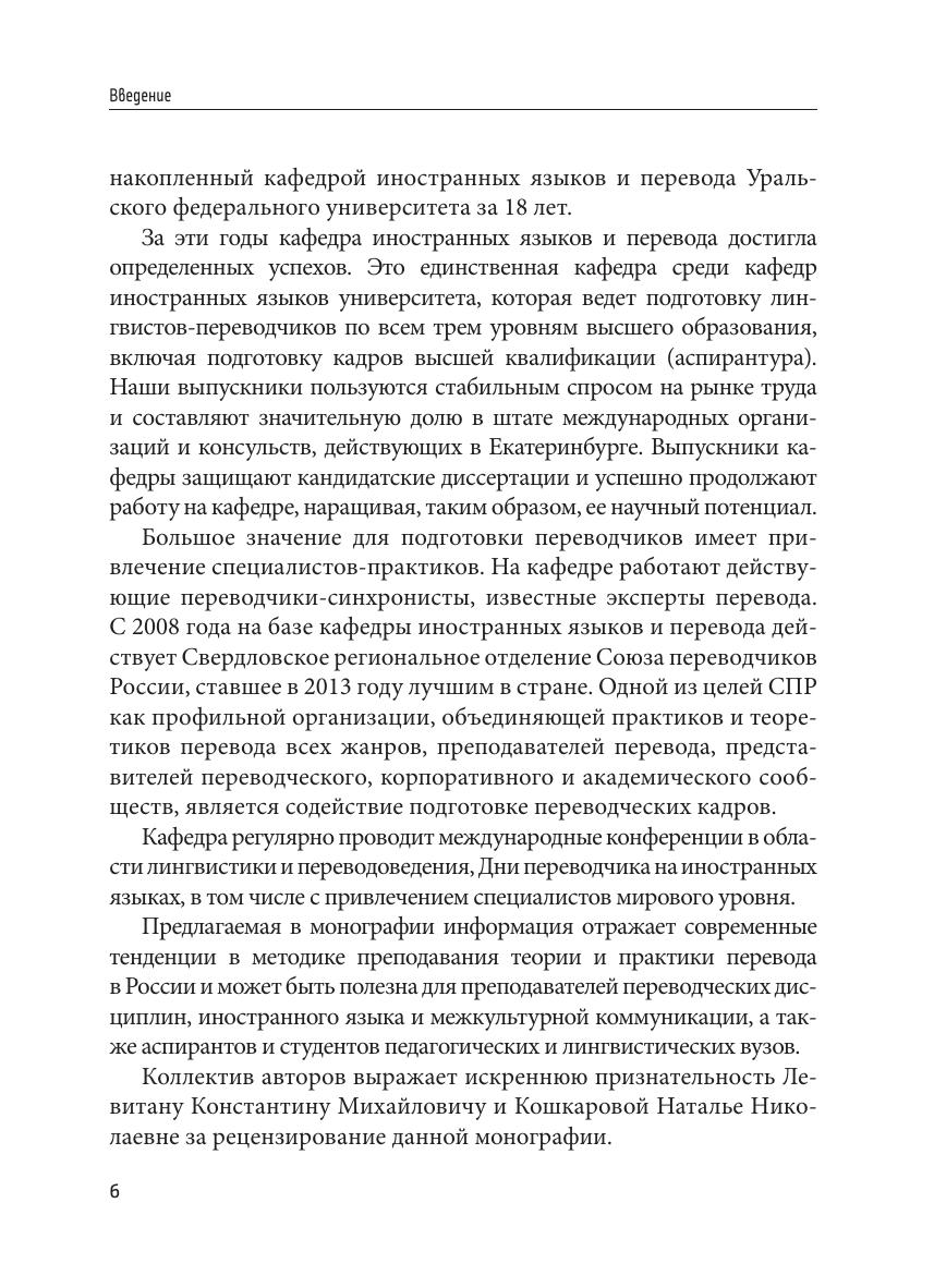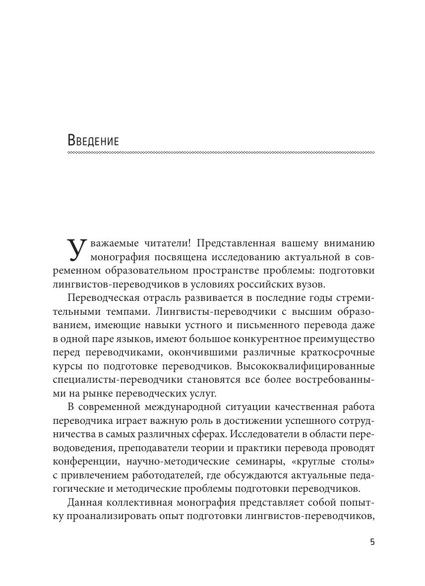 В монографии исследуются современные тенденции и проблемы подготовки специалистов в области перевода в современных условиях, когда обучение становится неотъемлемой и постоянной составляющей профессиональной деятельности преподавателя переводческих дисциплин. Большое внимание уделяется актуальным в настоящее время концепциям, подходам и принципам обучения лингвистов‑переводчиков, а также современным методам преподавания в этой сфере. Фокусирование на социолингвистическом аспекте при обучении лингвистов‑переводчиков позволяет эффективно реализовать формирование как лингвистической компетенции, так и отдельных компонентов социокультурной компетенции, что способствует воспитанию толерантности, уважения, ценностных ориентаций иноязычного социума. Подчеркивается значимость грамматического аспекта в процессе подготовки переводчиков, описывается методика развития иноязычной грамматической компетенции у студентов-лингвистов с применением элементов традиционных и альтернативных методов и методик обучения. Монография предназначена для преподавателей иностранного языка, переводческих дисциплин и межкультурной коммуникации, а также аспирантов и студентов педагогических и лингвистических вузов.