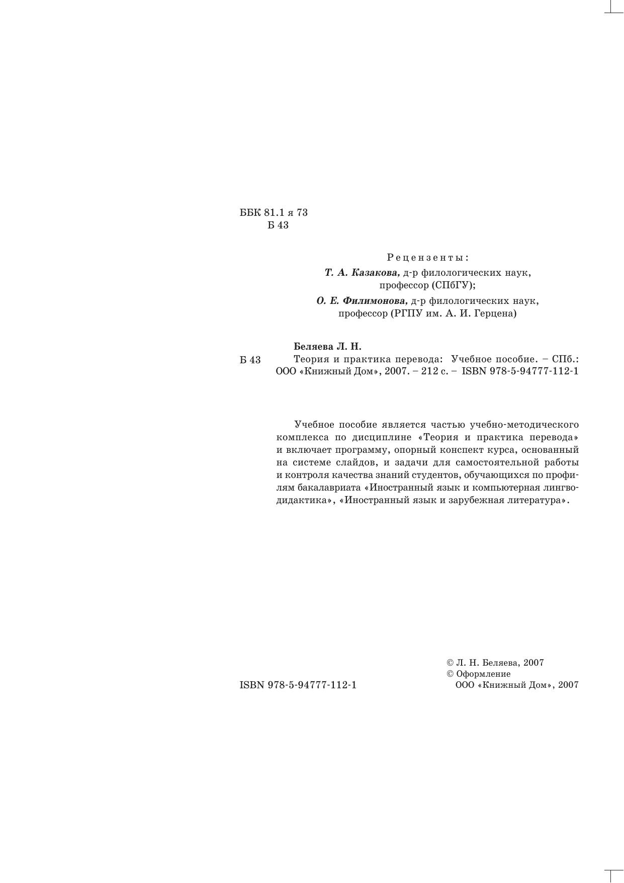 Учебное пособие является частью учебно-методического комплекса по дисциплине «Теория и практика перевода» и включает программу, опорный конспект курса, основанный на системе слайдов, и задачи для самостоятельной работы и контроля качества знаний студентов, обучающихся по профилям бакалавриата «Иностранный язык и компьютерная лингводидактика», «Иностранный язык и зарубежная литература».