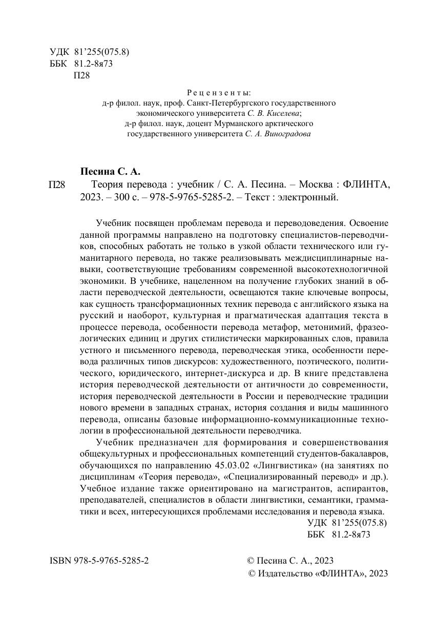 Учебник посвящен проблемам перевода и переводоведения. Освоение данной программы направлено на подготовку специалистов-переводчиков, способных работать не только в узкой области технического или гуманитарного перевода, но также реализовывать междисциплинарные навыки, соответствующие требованиям современной высокотехнологичной экономики. В учебнике, нацеленном на получение глубоких знаний в области переводческой деятельности, освещаются такие ключевые вопросы, как сущность трансформационных техник перевода с английского языка на русский и наоборот, культурная и прагматическая адаптация текста в процессе перевода, особенности перевода метафор, метонимий, фразеологических единиц и других стилистически маркированных слов, правила устного и письменного перевода, переводческая этика, особенности перевода различных типов дискурсов: художественного, поэтического, политического, юридического, интернет-дискурса и др. В книге представлена история переводческой деятельности от античности до современности, история переводческой деятельности в России и переводческие традиции нового времени в западных странах, история создания и виды машинного перевода, описаны базовые информационно-коммуникационные технологии в профессиональной деятельности переводчика.
