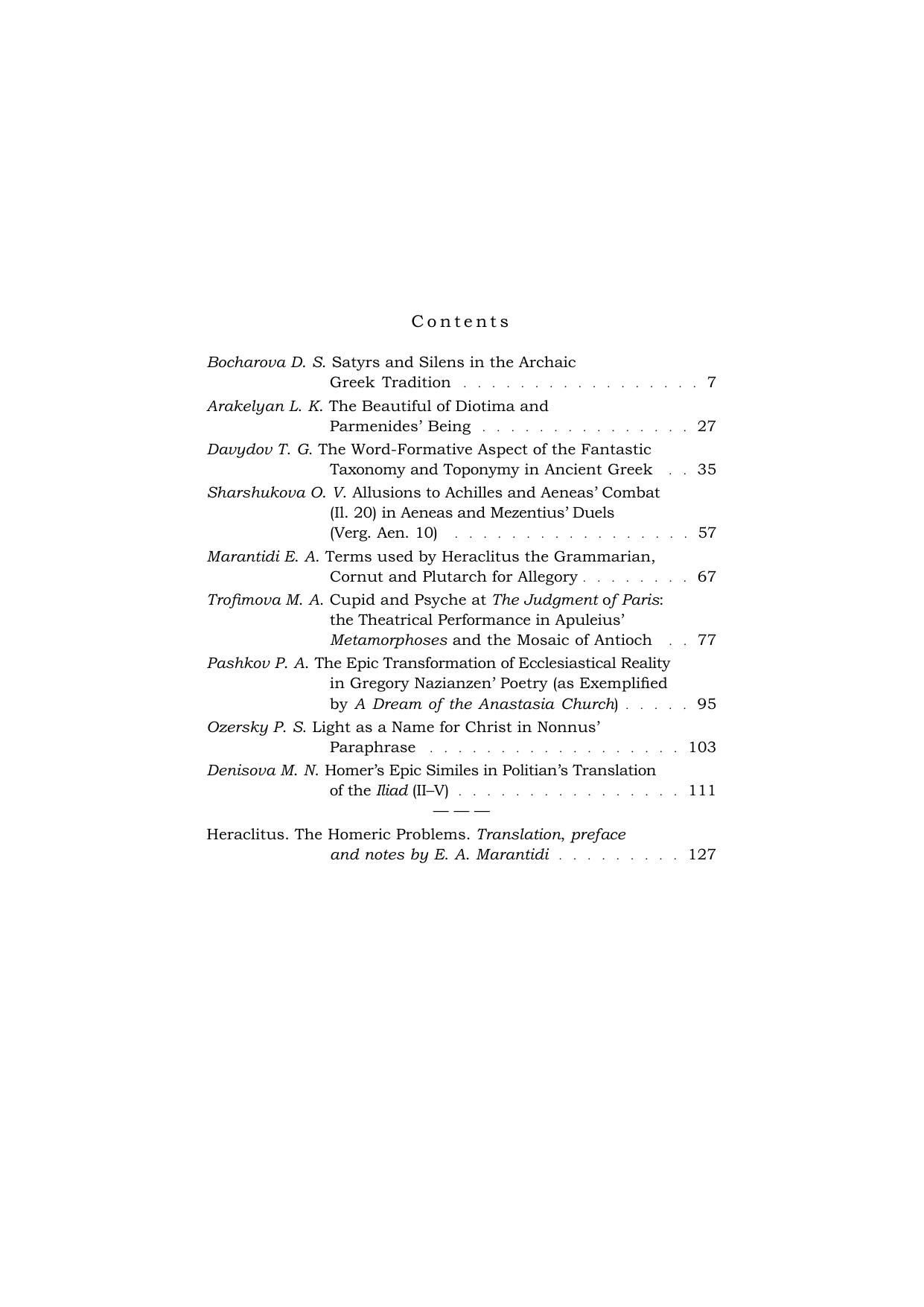 В сборник вошли работы студентов-бакалавров и магистрантов ИВКА РГГУ, МГУ и НИУ-ВШЭ. Основу работ составляют доклады, сделанные участниками студенческих конференций по классической филологии, проводившихся в октябре 2016 и 2017 гг. кафедрой классической филологии ИВКА. Тематический спектр представленных работ очень широк — от мифологии до терминологии, и не менее широк охват материала — от источников эпохи архаики и ранней классики до трудов итальянских гуманистов. Особый интерес представляет опубликованный в сборнике перевод «Гомеровских вопросов» Гераклита.