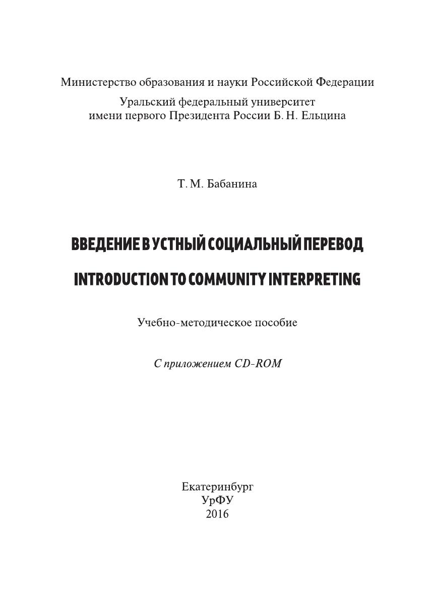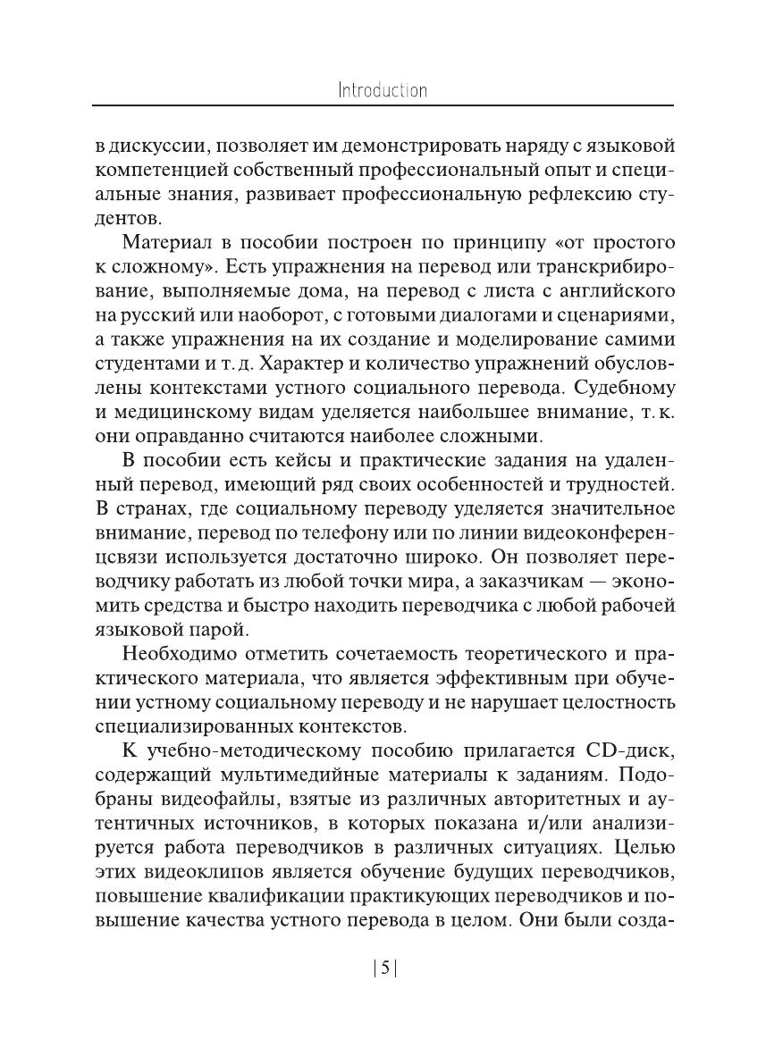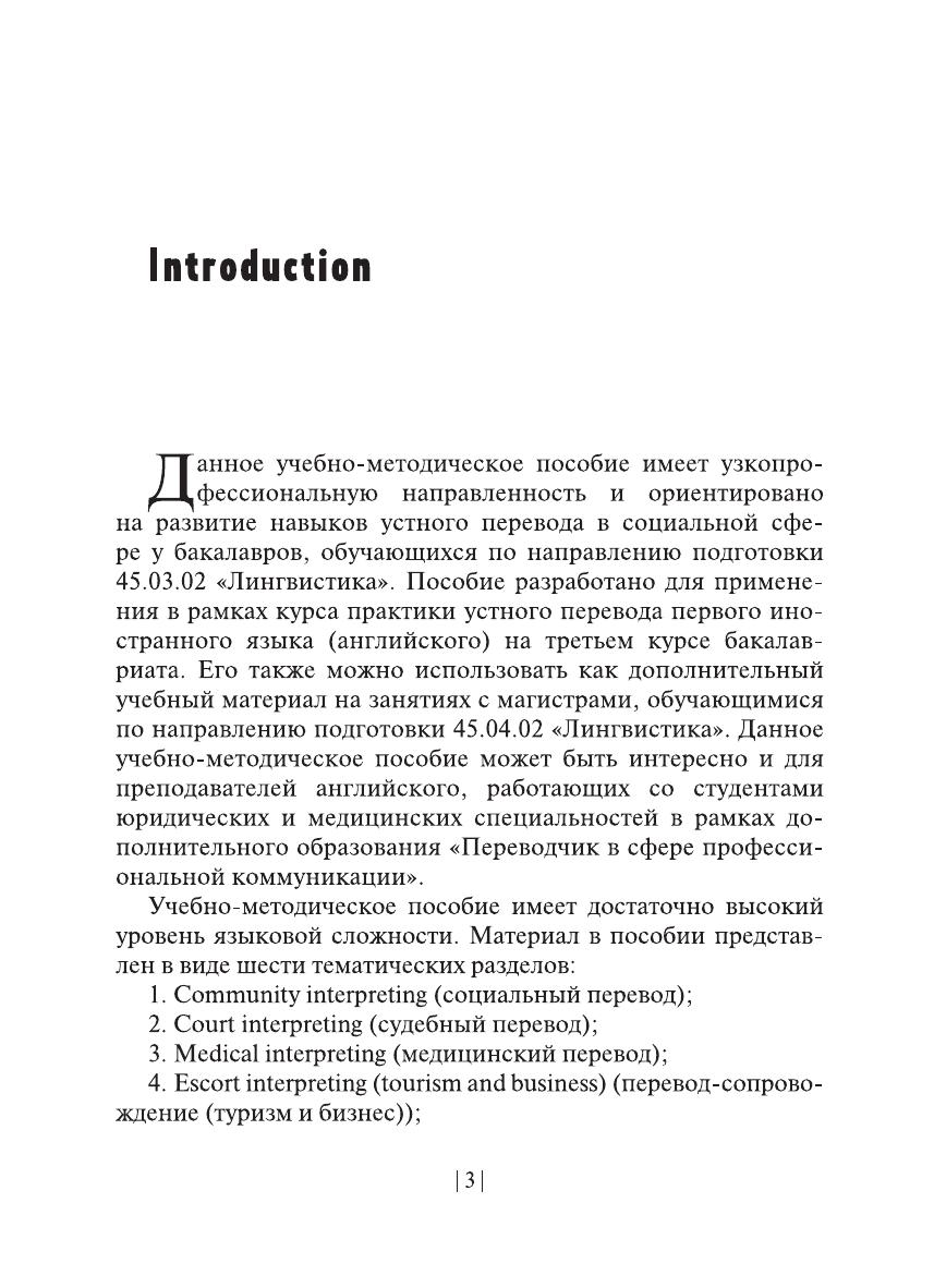 Учебно-методическое пособие «Введение в устный социальный перевод» предназначено для студентов 3 курса, обучающихся по направлению подготовки «Лингвистика». Основная цель пособия состоит в развитии навыков устного перевода в социальной сфере. Данное пособие может использоваться как дополнительный учебный материал на занятиях с магистрами, обучающимися по направлению «Лингвистика», а также при обучении студентов юридических и медицинских специальностей в рамках дополнительного образования «Переводчик в сфере профессиональной коммуникации». Пособие способствует расширению словарного запаса в основных контекстах устного социального перевода, помогает научиться анализировать различные ситуации перевода и выбирать наиболее подходящие переводческие стратегии и курс действий, профессионально аргументируя свой выбор. В пособии присутствуют упражнения интерактивного характера, развивающие профессиональную рефлексию студентов.