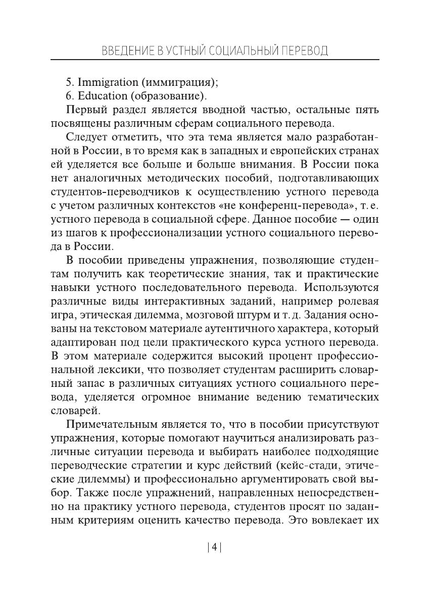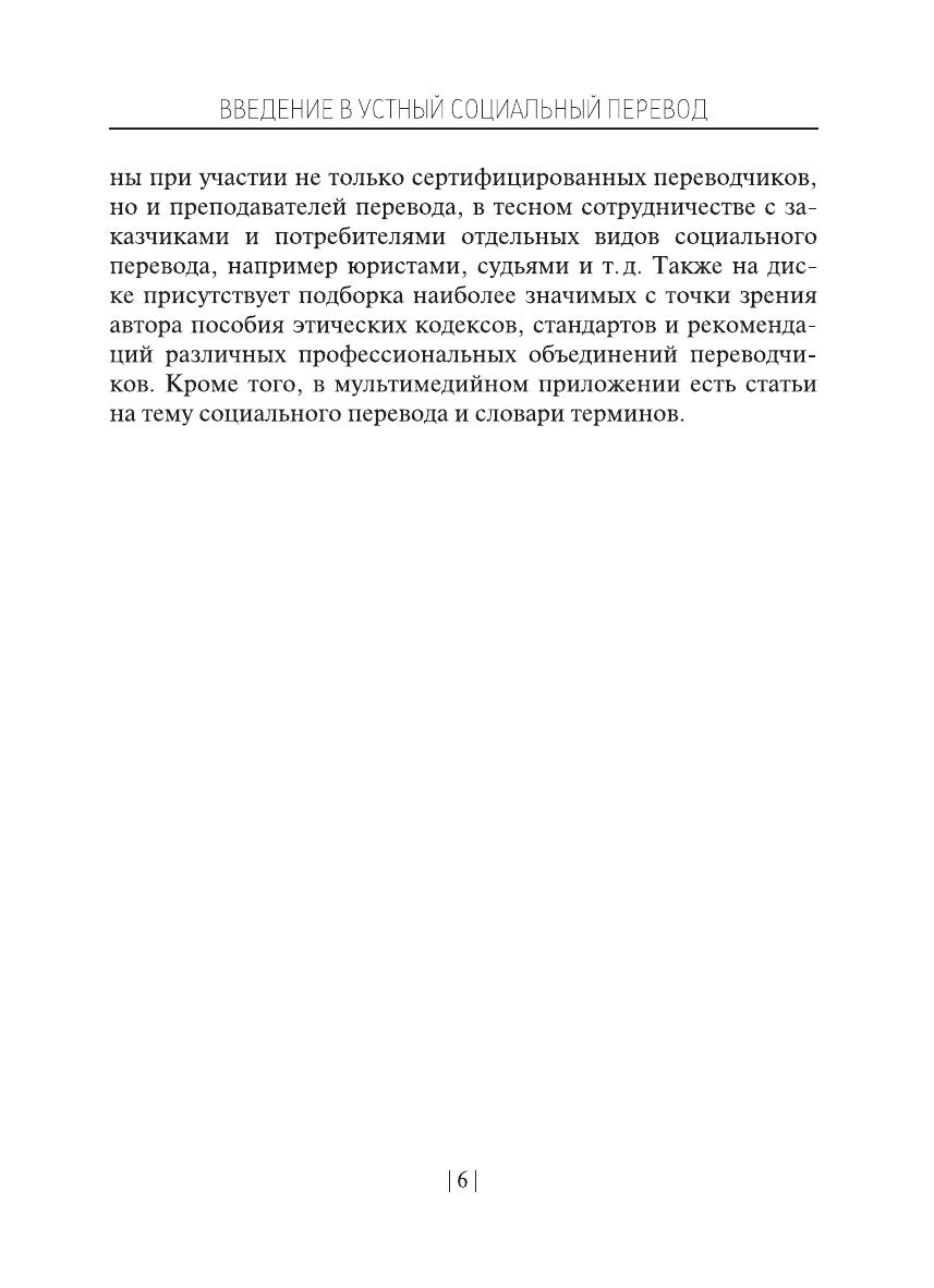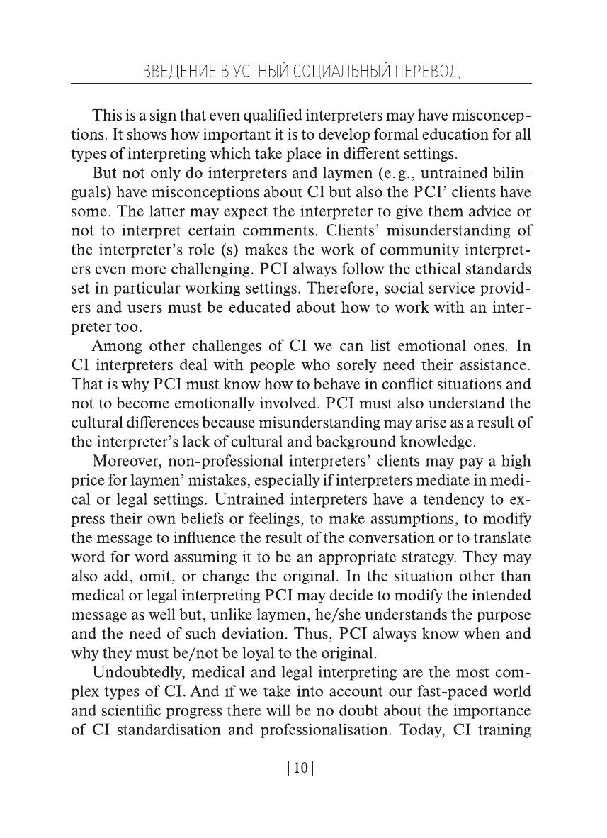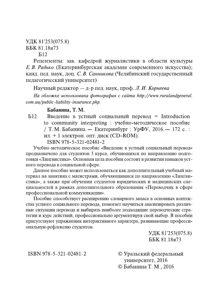 Учебно-методическое пособие «Введение в устный социальный перевод» предназначено для студентов 3 курса, обучающихся по направлению подготовки «Лингвистика». Основная цель пособия состоит в развитии навыков устного перевода в социальной сфере. Данное пособие может использоваться как дополнительный учебный материал на занятиях с магистрами, обучающимися по направлению «Лингвистика», а также при обучении студентов юридических и медицинских специальностей в рамках дополнительного образования «Переводчик в сфере профессиональной коммуникации». Пособие способствует расширению словарного запаса в основных контекстах устного социального перевода, помогает научиться анализировать различные ситуации перевода и выбирать наиболее подходящие переводческие стратегии и курс действий, профессионально аргументируя свой выбор. В пособии присутствуют упражнения интерактивного характера, развивающие профессиональную рефлексию студентов.