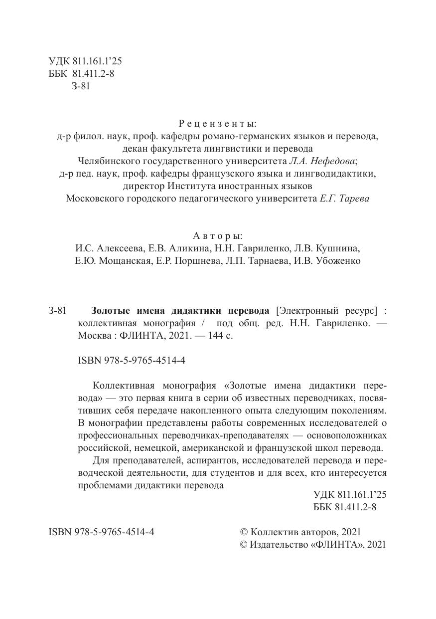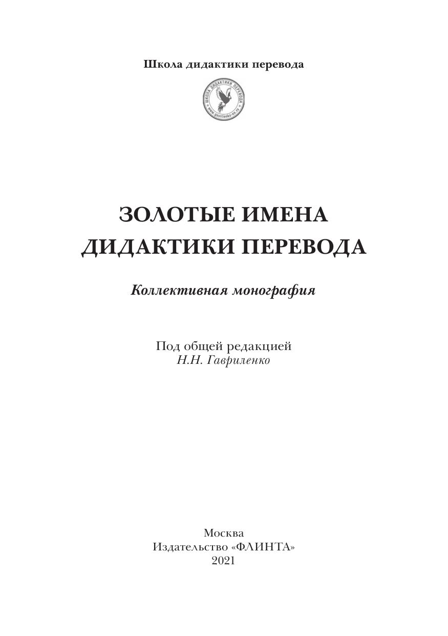 Коллективная монография «Золотые имена дидактики перевода» — это первая книга в серии об известных переводчиках, посвятивших себя передаче накопленного опыта следующим поколениям. В монографии представлены работы современных исследователей о профессиональных переводчиках-преподавателях — основоположниках российской, немецкой, американской и французской школ перевода.