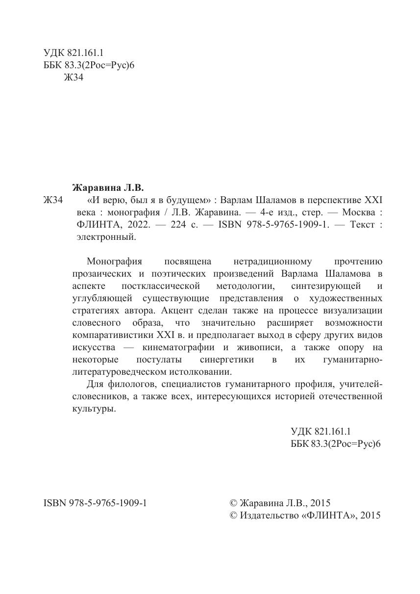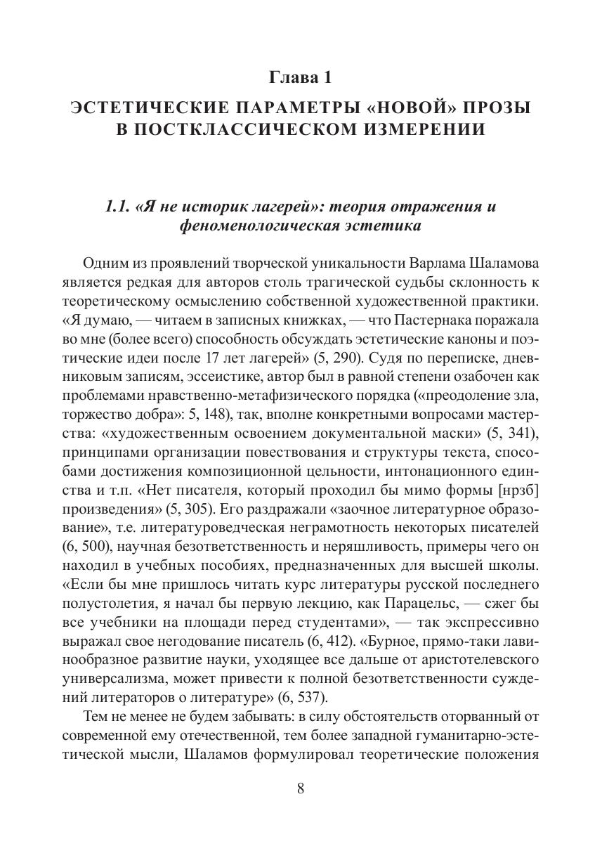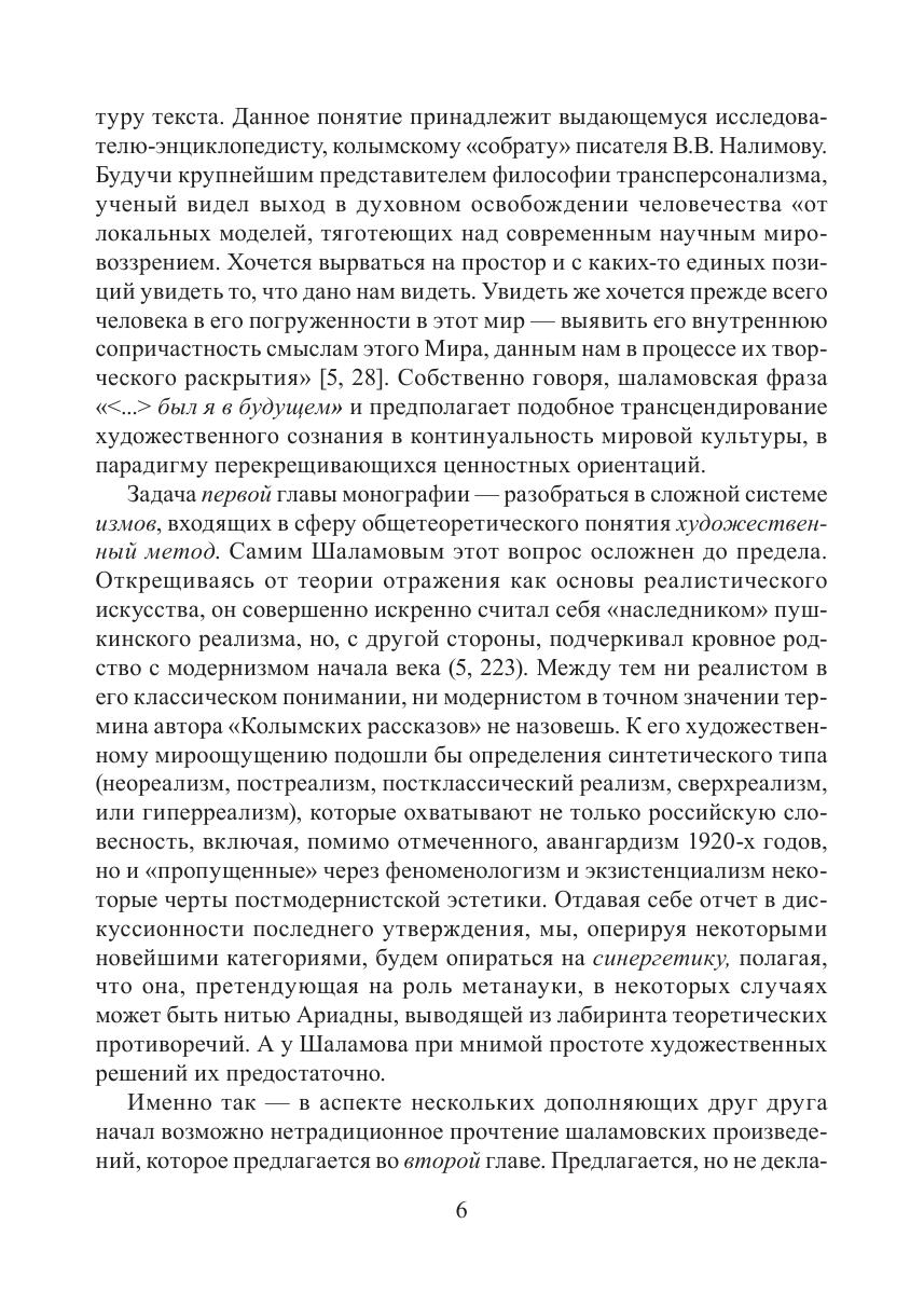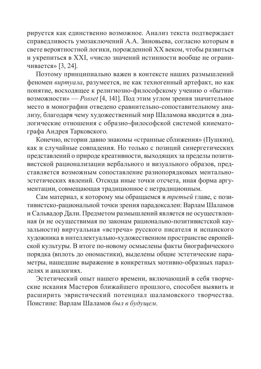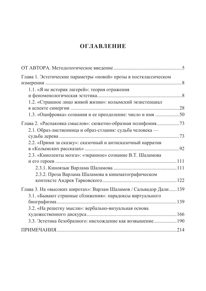Монография посвящена нетрадиционному прочтению прозаических и поэтических произведений Варлама Шаламова в аспекте постклассической методологии, синтезирующей и углубляющей существующие представления о художественных стратегиях автора. Акцент сделан также на процессе визуализации словесного образа, что значительно расширяет возможности компаративистики XXI в. и предполагает выход в сферу других видов искусства — кинематографии и живописи, а также опору на некоторые постулаты синергетики в их гуманитарно-литературоведческом истолковании.