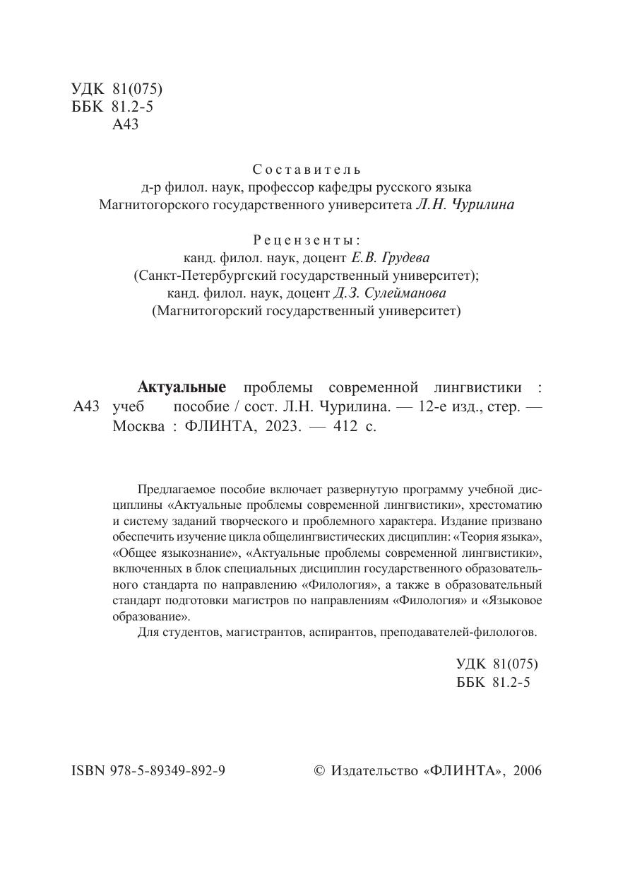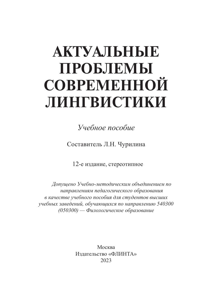 Предлагаемое пособие включает развернутую программу учебной дисциплины «Актуальные проблемы современной лингвистики», хрестоматию и систему заданий творческого и проблемного характера. Издание призвано обеспечить изучение цикла общелингвистических дисциплин: «Теория языка», «Общее языкознание», «Актуальные проблемы современной лингвистики», включенных в блок специальных дисциплин государственного образовательного стандарта по направлению «Филология», а также в образовательный стандарт подготовки магистров по направлениям «Филология» и «Языковое образование».