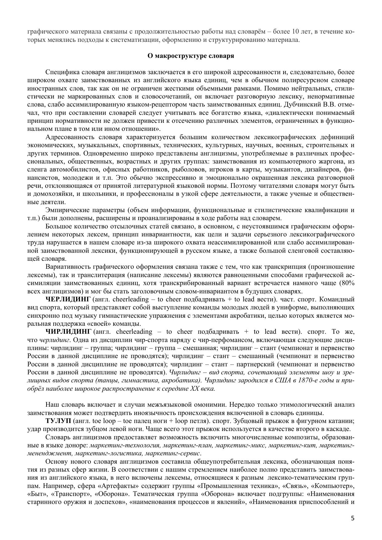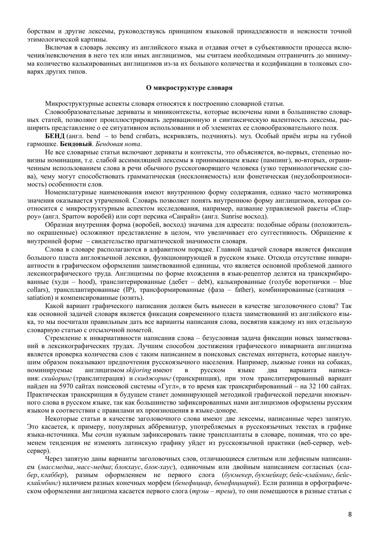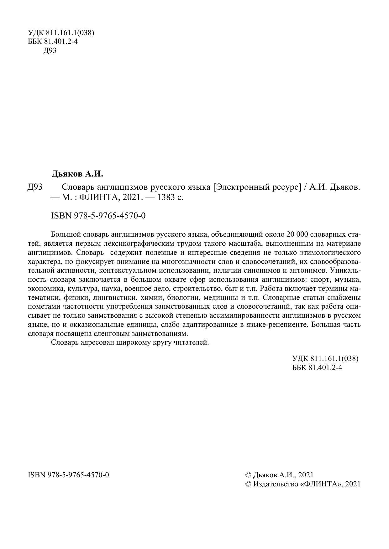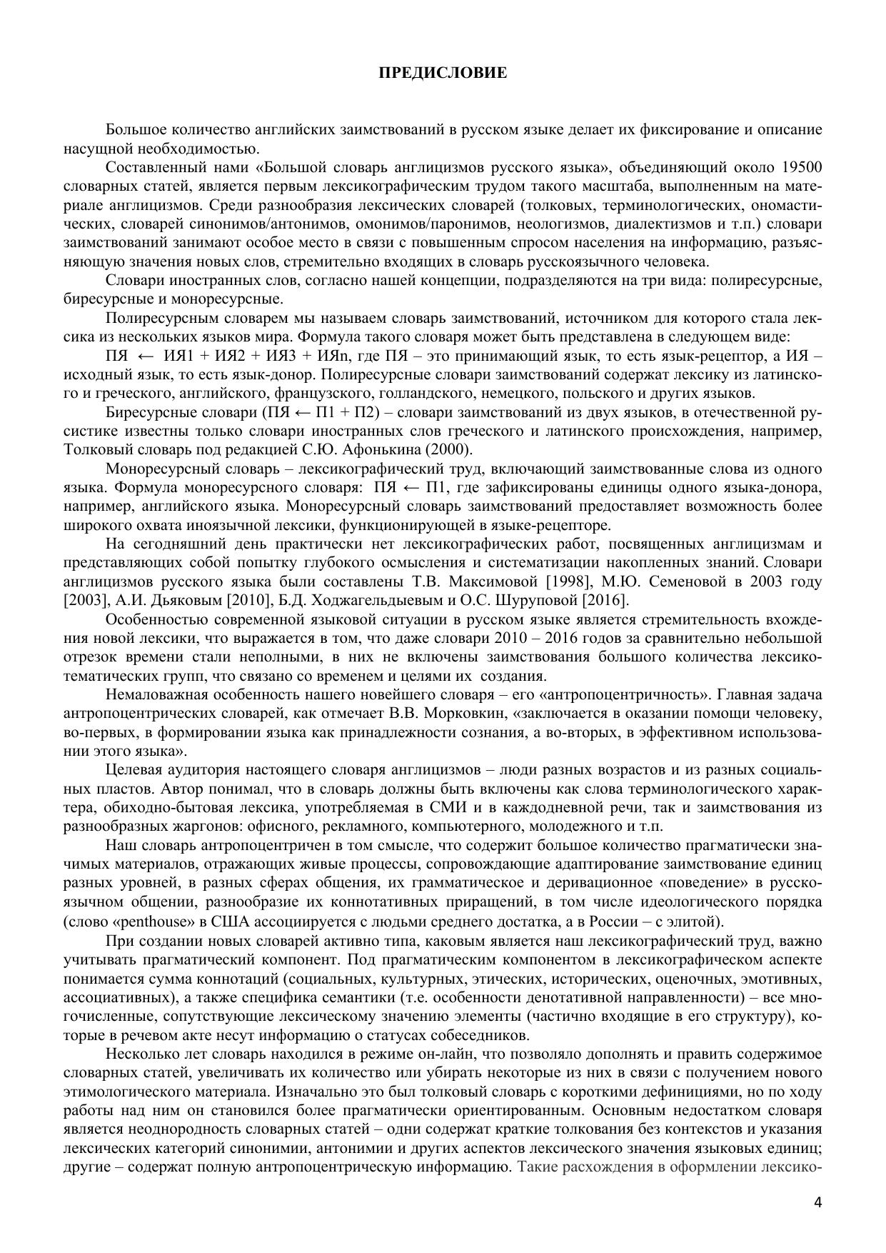 Большой словарь англицизмов русского языка, объединяющий около 20 000 словарных статей, является первым лексикографическим трудом такого масштаба, выполненным на материале англицизмов. Словарь содержит полезные и интересные сведения не только этимологического характера, но фокусирует внимание на многозначности слов и словосочетаний, их словообразовательной активности, контекстуальном использовании, наличии синонимов и антонимов. Уникальность словаря заключается в большом охвате сфер использования англицизмов: спорт, музыка, экономика, культура, наука, военное дело, строительство, быт и т.п. Работа включает термины математики, физики, лингвистики, химии, биологии, медицины и т.п. Словарные статьи снабжены пометами частотности употребления заимствованных слов и словосочетаний, так как работа описывает не только заимствования с высокой степенью ассимилированности англицизмов в русском языке, но и окказиональные единицы, слабо адаптированные в языке-рецепиенте. Большая часть словаря посвящена сленговым заимствованиям. Словарь адресован широкому кругу читателей.