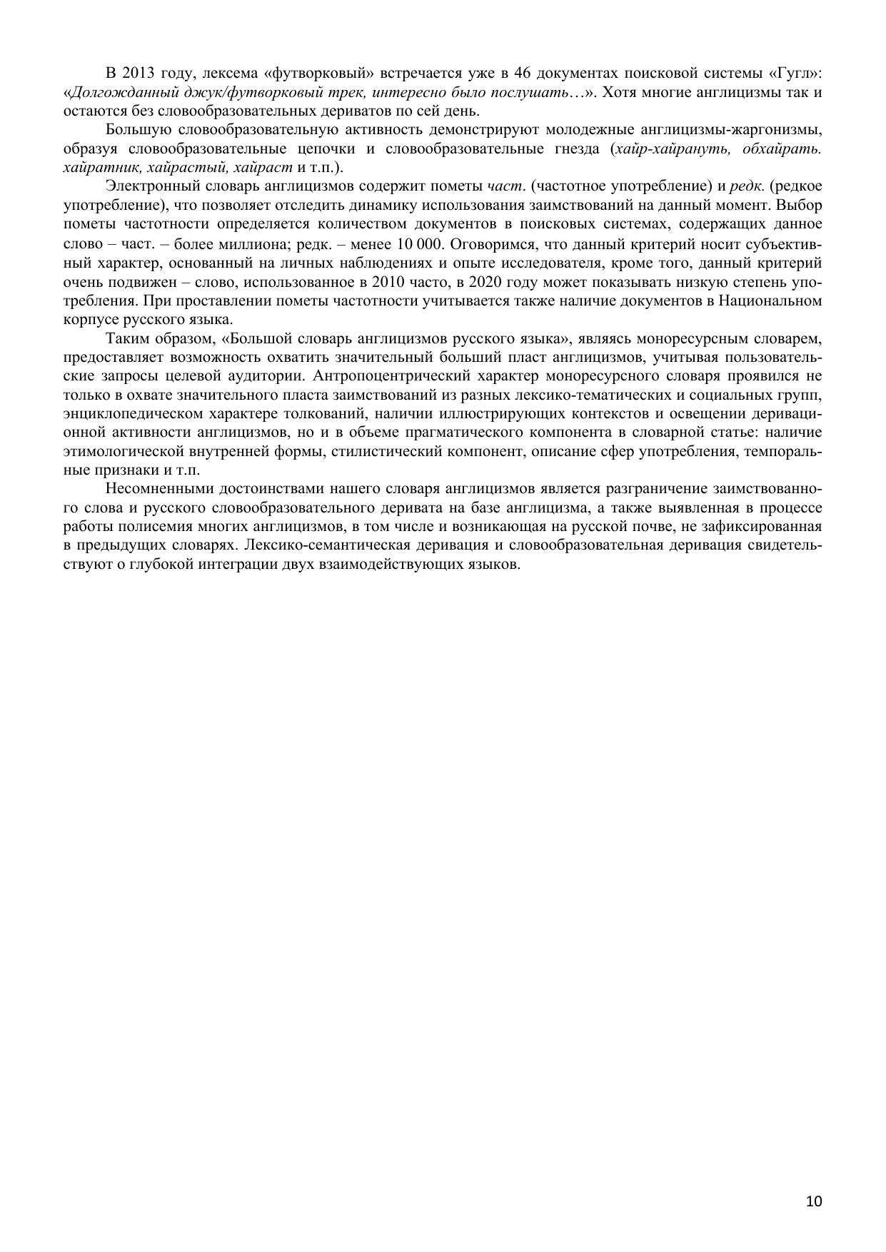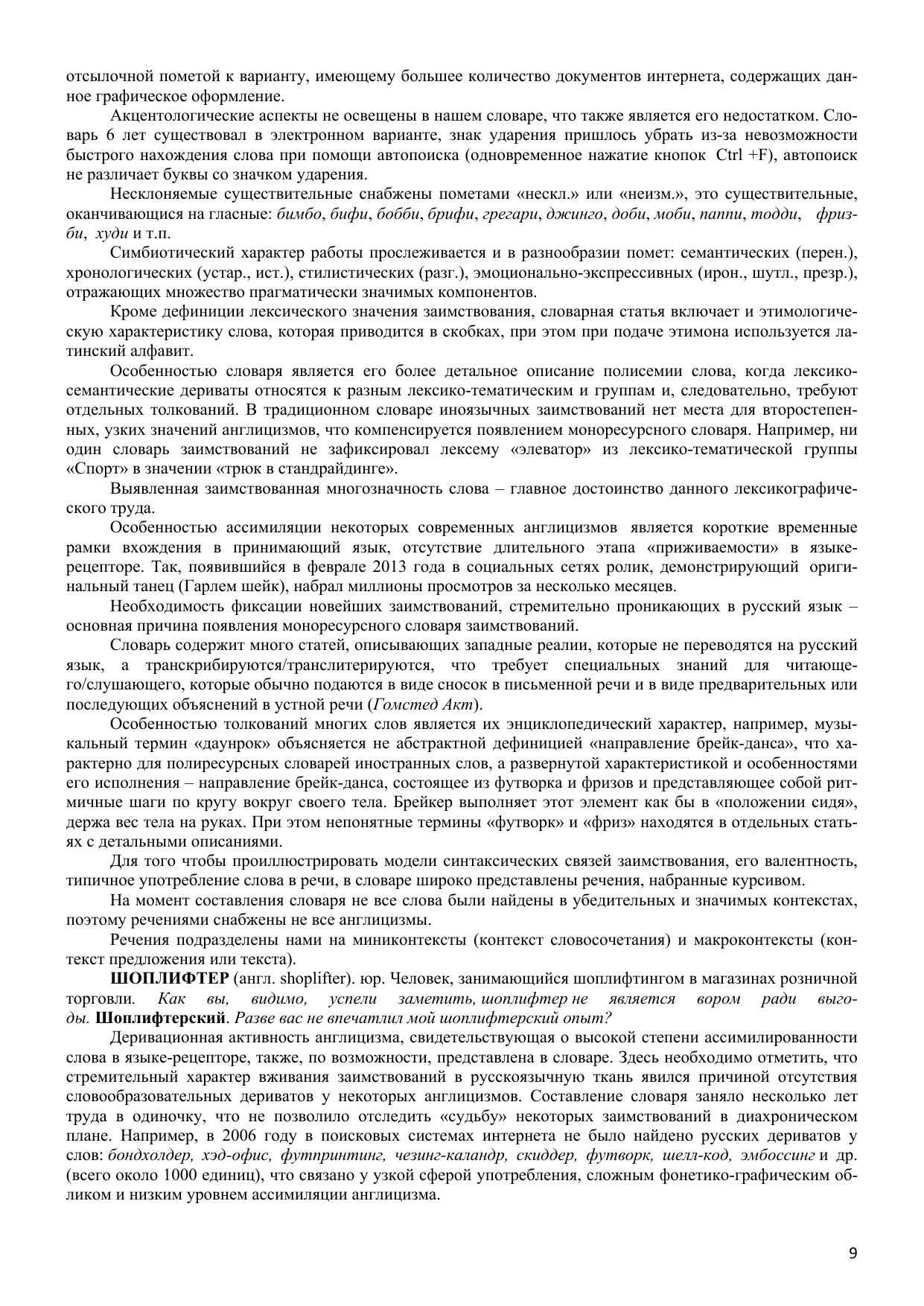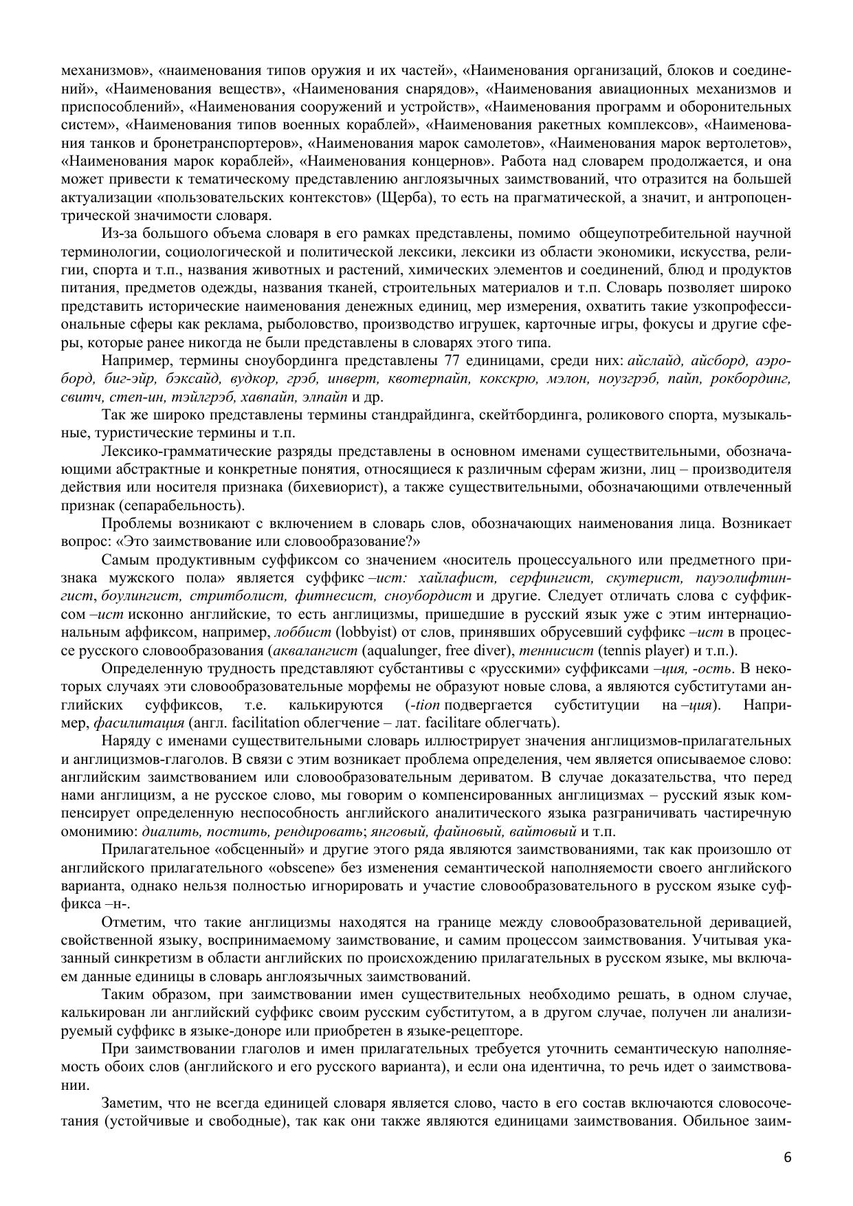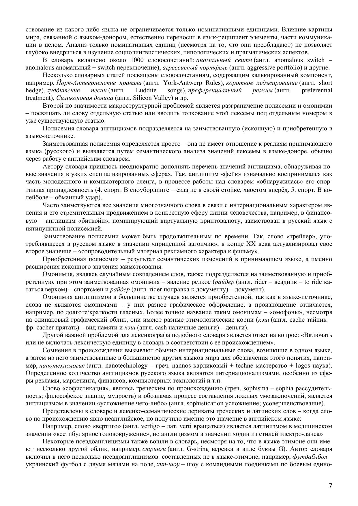 Большой словарь англицизмов русского языка, объединяющий около 20 000 словарных статей, является первым лексикографическим трудом такого масштаба, выполненным на материале англицизмов. Словарь содержит полезные и интересные сведения не только этимологического характера, но фокусирует внимание на многозначности слов и словосочетаний, их словообразовательной активности, контекстуальном использовании, наличии синонимов и антонимов. Уникальность словаря заключается в большом охвате сфер использования англицизмов: спорт, музыка, экономика, культура, наука, военное дело, строительство, быт и т.п. Работа включает термины математики, физики, лингвистики, химии, биологии, медицины и т.п. Словарные статьи снабжены пометами частотности употребления заимствованных слов и словосочетаний, так как работа описывает не только заимствования с высокой степенью ассимилированности англицизмов в русском языке, но и окказиональные единицы, слабо адаптированные в языке-рецепиенте. Большая часть словаря посвящена сленговым заимствованиям. Словарь адресован широкому кругу читателей.