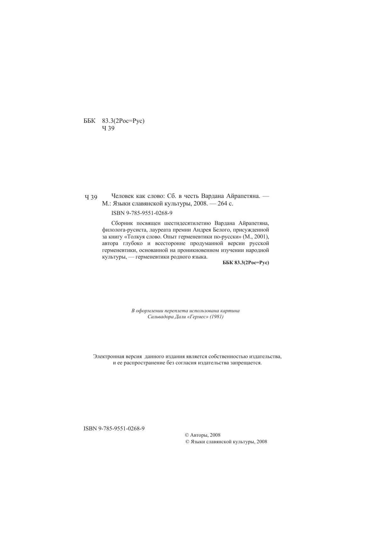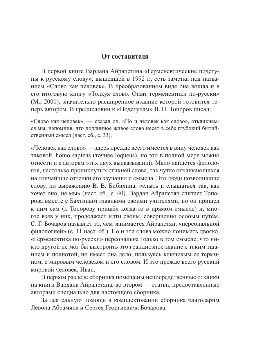 Сборник посвящен шестидесятилетию Вардана Айрапетяна, филолога-русиста, лауреата премии Андрея Белого, присужденной за книгу "Толкуя слово. Опыт герменевтики по-русски" (М., 2001), автора глубоко и всесторонне продуманной версии русской герменевтики, основанной на проникновенном изучении народной культуры, - герменевтики родного языка.