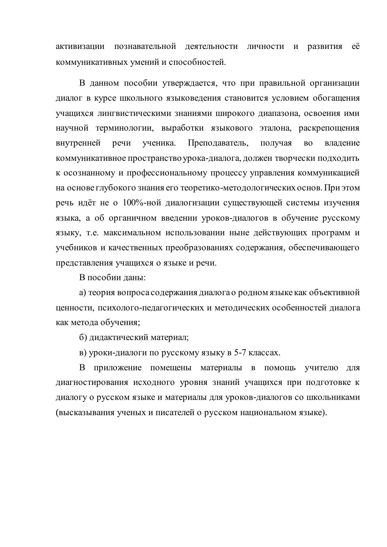 При правильной организации диалог в курсе школьного языковедения становится условием обогащения учащихся лингвистическими знаниями широкого диапазона, освоения ими научной терминологии, выработки языкового эталона, раскрепощения внутренней речи ученика. Диалог даёт людям возможность мыслить, общаться, передавать знания, информацию от одного поколения к другому, служит развитию и преемственности научной и художественной мысли, является основой духовной жизни народа.