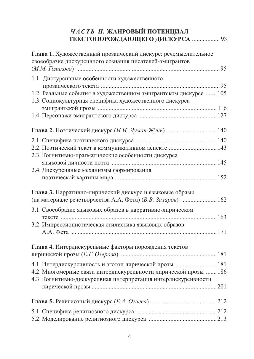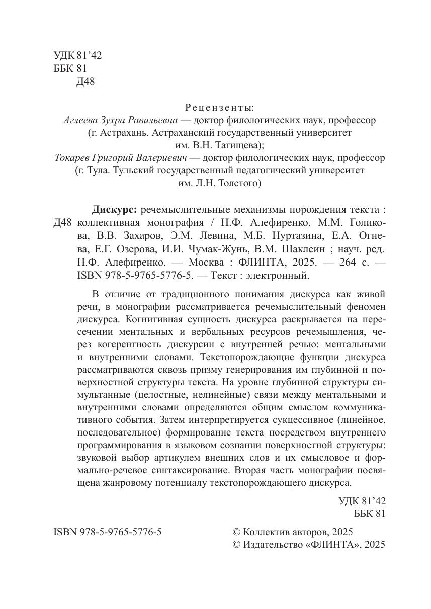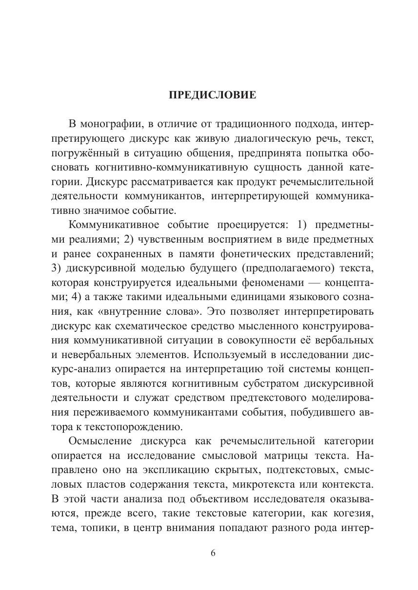 В отличие от традиционного понимания дискурса как живой речи, в монографии рассматривается речемыслительный феномен дискурса. Когнитивная сущность дискурса раскрывается на пересечении ментальных и вербальных ресурсов речемышления, через когерентность дискурсии с внутренней речью: ментальными и внутренними словами. Текстопорождающие функции дискурса рассматриваются сквозь призму генерирования им глубинной и поверхностной структуры текста. На уровне глубинной структуры симультанные (целостные, нелинейные) связи между ментальными и внутренними словами определяются общим смыслом коммуникативного события. Затем интерпретируется сукцессивное (линейное, последовательное) формирование текста посредством внутреннего программирования в языковом сознании поверхностной структуры: звуковой выбор артикулем внешних слов и их смысловое и формально-речевое синтаксирование. Вторая часть монографии посвящена жанровому потенциалу текстопорождающего дискурса.