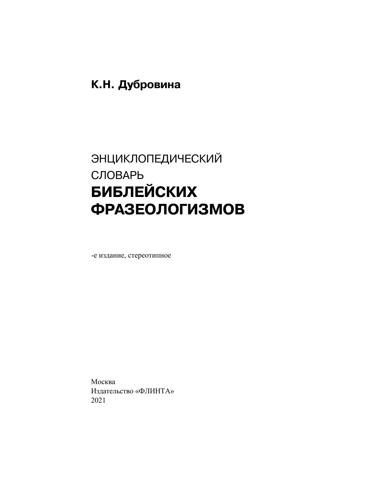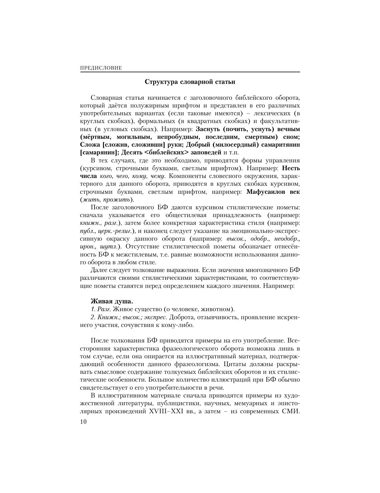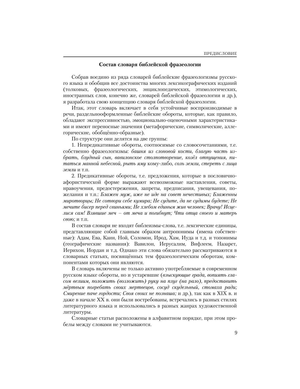 Настоящий энциклопедический словарь представляет собой одно из наиболее полных собраний фразеологических оборотов русского языка, по своему происхождению восходящих к Библии. В него вошли как собственно фразеологизмы, так и пословицы, поговорки, афоризмы, крылатые изречения, перифразы и другие фразеологизированные выражения. Данный словарь является лингвистическим справочником энциклопедического типа, в котором даны толкования распространенных значений библейских фразеологизмов, примеры на их употребление в художественных, научных, публицистических, мемуарных, эпистолярных произведениях XVIII–XXI вв. и в современных СМИ, а также приводятся историко-этимологические и лингвокультурологические комментарии с соответствующими цитатами из Библии и ссылками на библейские тексты.