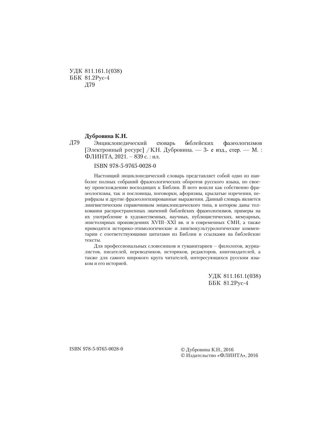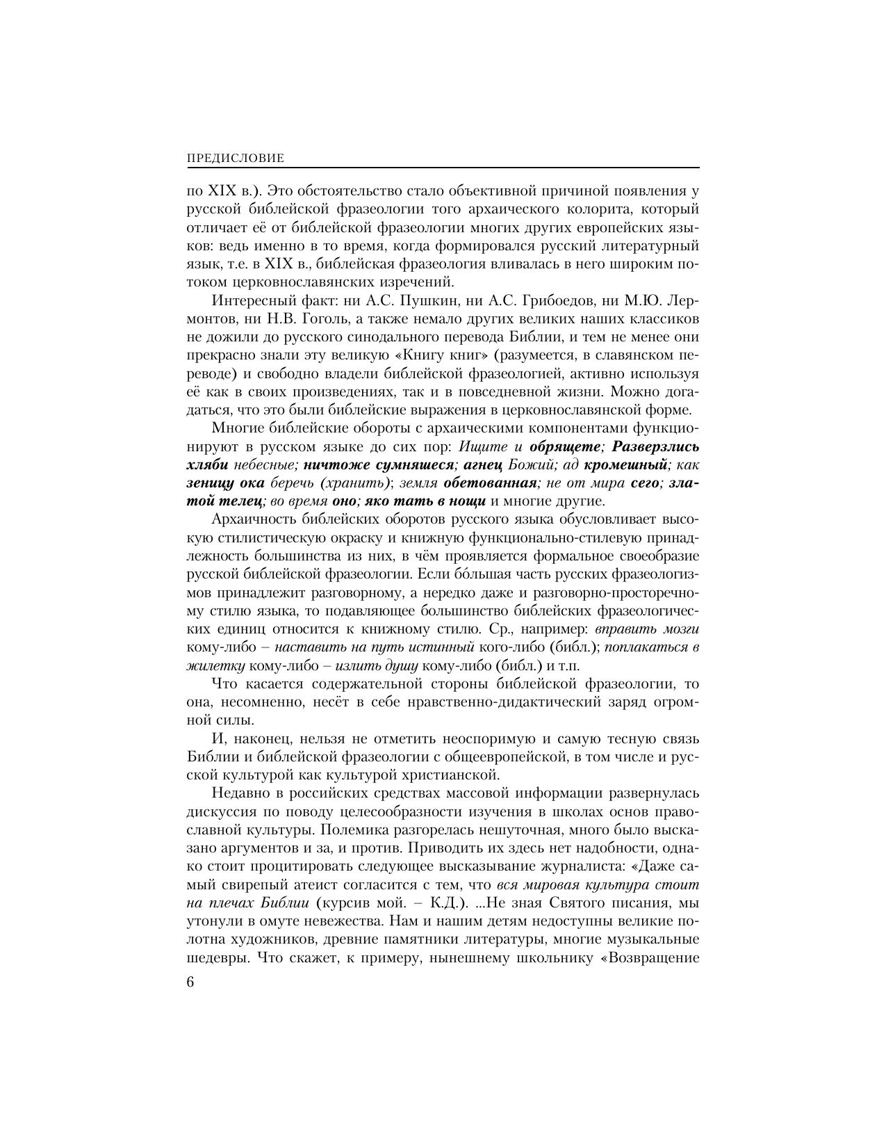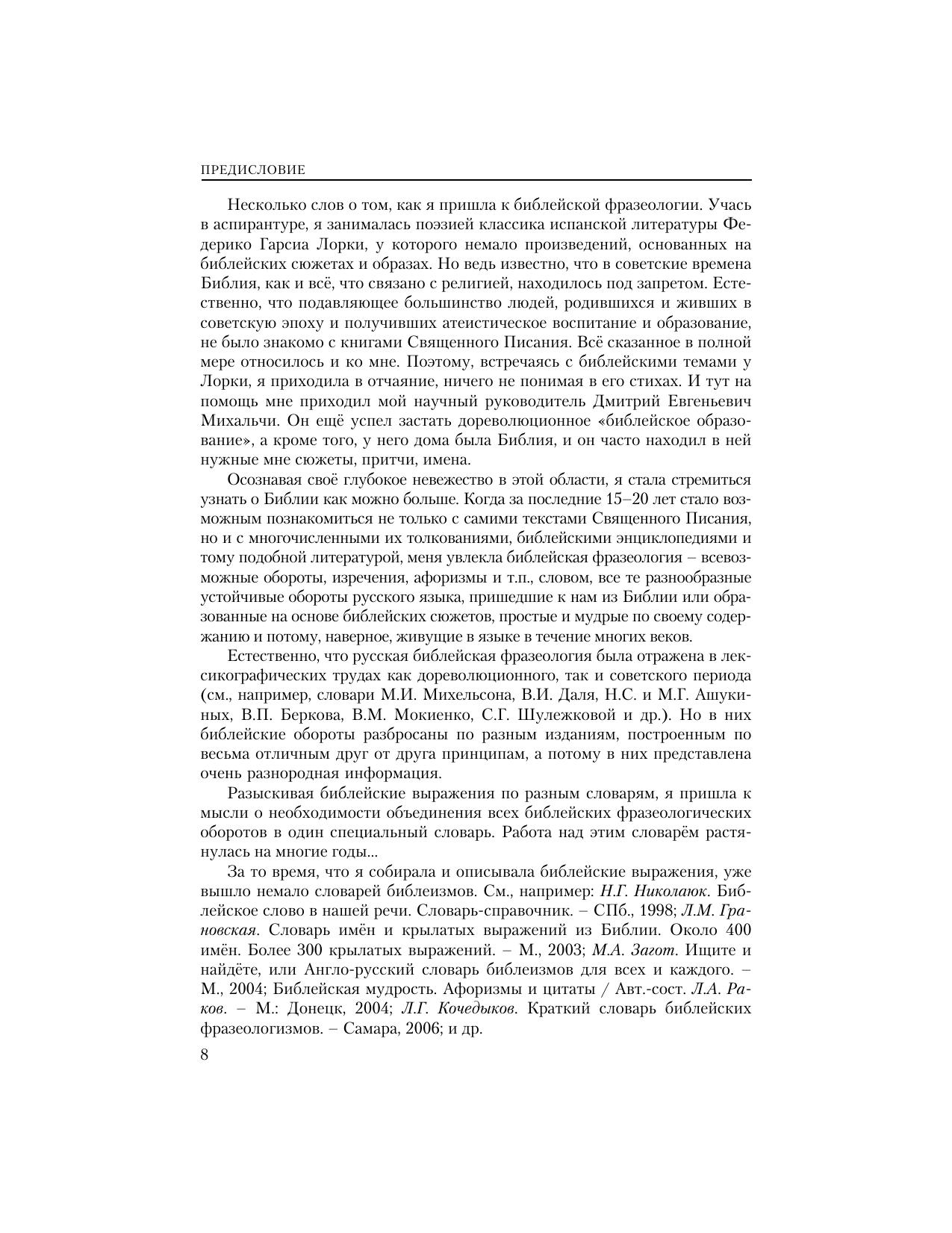 Настоящий энциклопедический словарь представляет собой одно из наиболее полных собраний фразеологических оборотов русского языка, по своему происхождению восходящих к Библии. В него вошли как собственно фразеологизмы, так и пословицы, поговорки, афоризмы, крылатые изречения, перифразы и другие фразеологизированные выражения. Данный словарь является лингвистическим справочником энциклопедического типа, в котором даны толкования распространенных значений библейских фразеологизмов, примеры на их употребление в художественных, научных, публицистических, мемуарных, эпистолярных произведениях XVIII–XXI вв. и в современных СМИ, а также приводятся историко-этимологические и лингвокультурологические комментарии с соответствующими цитатами из Библии и ссылками на библейские тексты.
