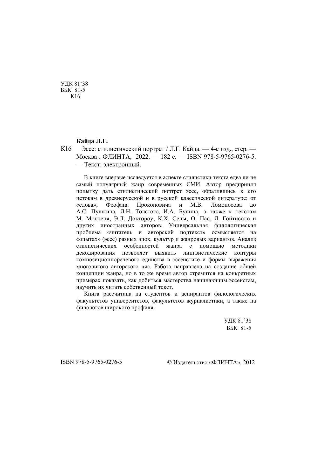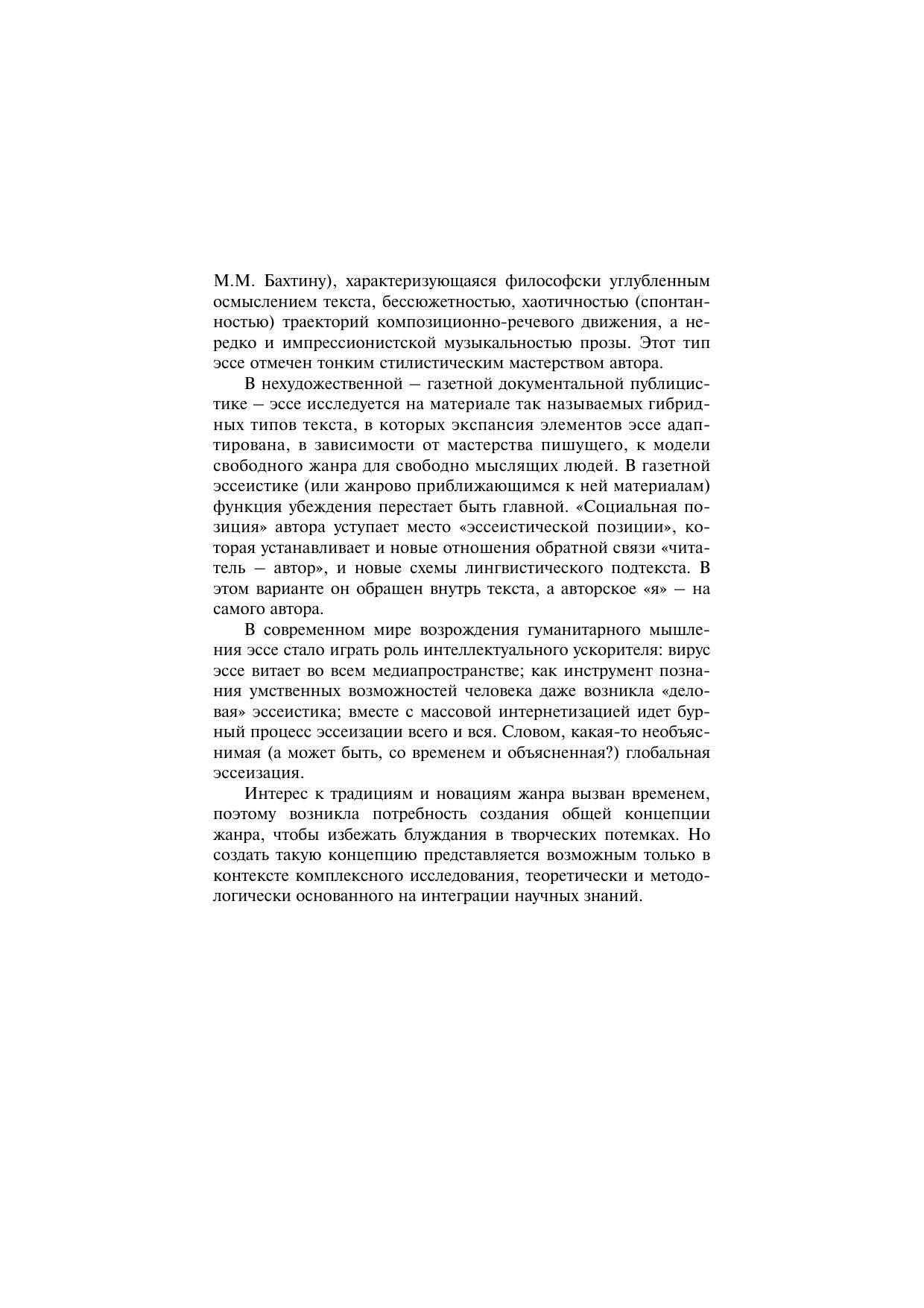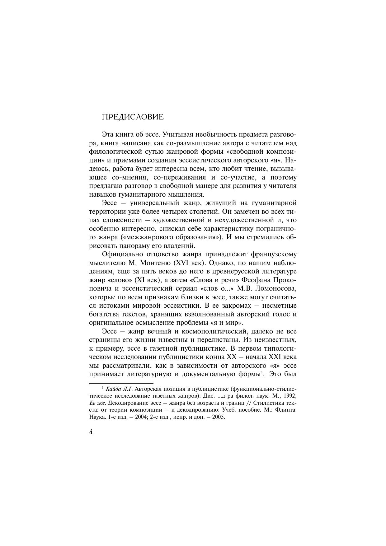 В книге впервые исследуется в аспекте стилистики текста едва ли не самый популярный жанр современных СМИ. Автор предпринял попытку дать стилистический портрет эссе, обратившись к его истокам в древнерусской и в русской классической литературе: от «слова», Феофана Прокоповича и М.В. Ломоносова до А.С. Пушкина, Л.Н. Толстого, И.А. Бунина, а также к текстам М. Монтеня, Э.Л. Доктороу, К.Х. Селы, О. Пас, Л. Гойтисоло и других иностранных авторов. Универсальная филологическая проблема «читатель и авторский подтекст» осмысляется на «опытах» (эссе) разных эпох, культур и жанровых вариантов. Анализ стилистических особенностей жанра с помощью методики декодирования позволяет выявить лингвистические контуры композиционноречевого единства в эссеистике и формы выражения многоликого авторского «я». Работа направлена на создание общей концепции жанра, но в то же время автор стремится на конкретных примерах показать, как добиться мастерства начинающим эссеистам, научить их читать собственный текст.