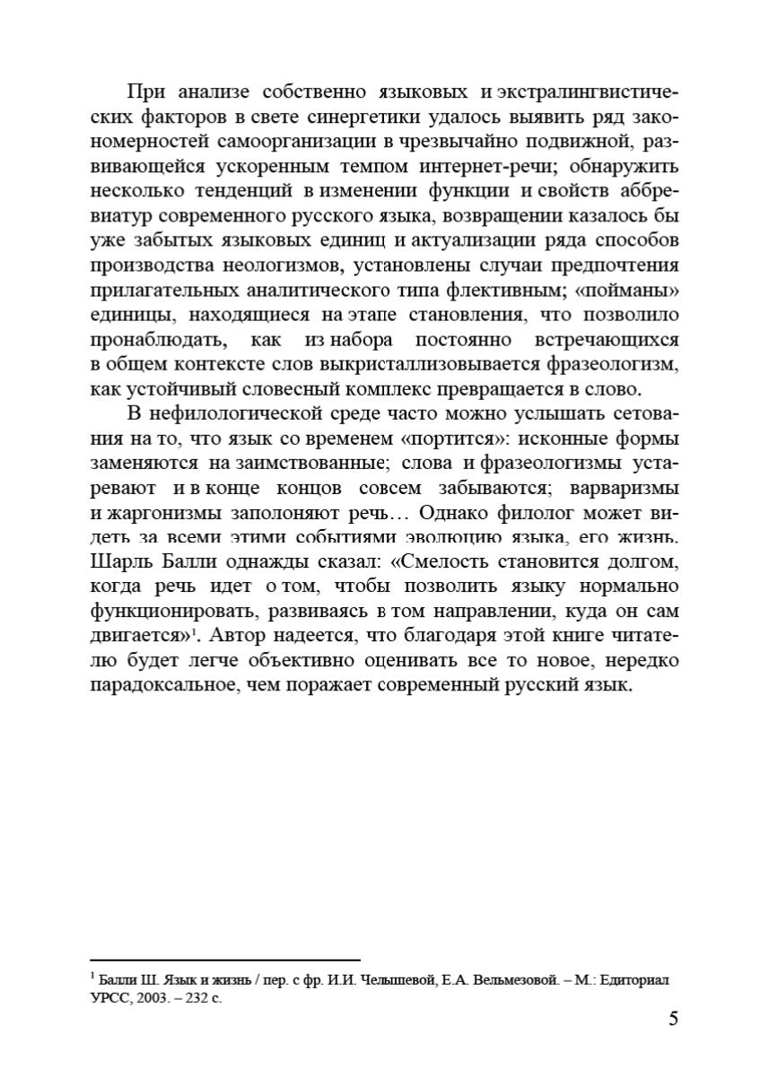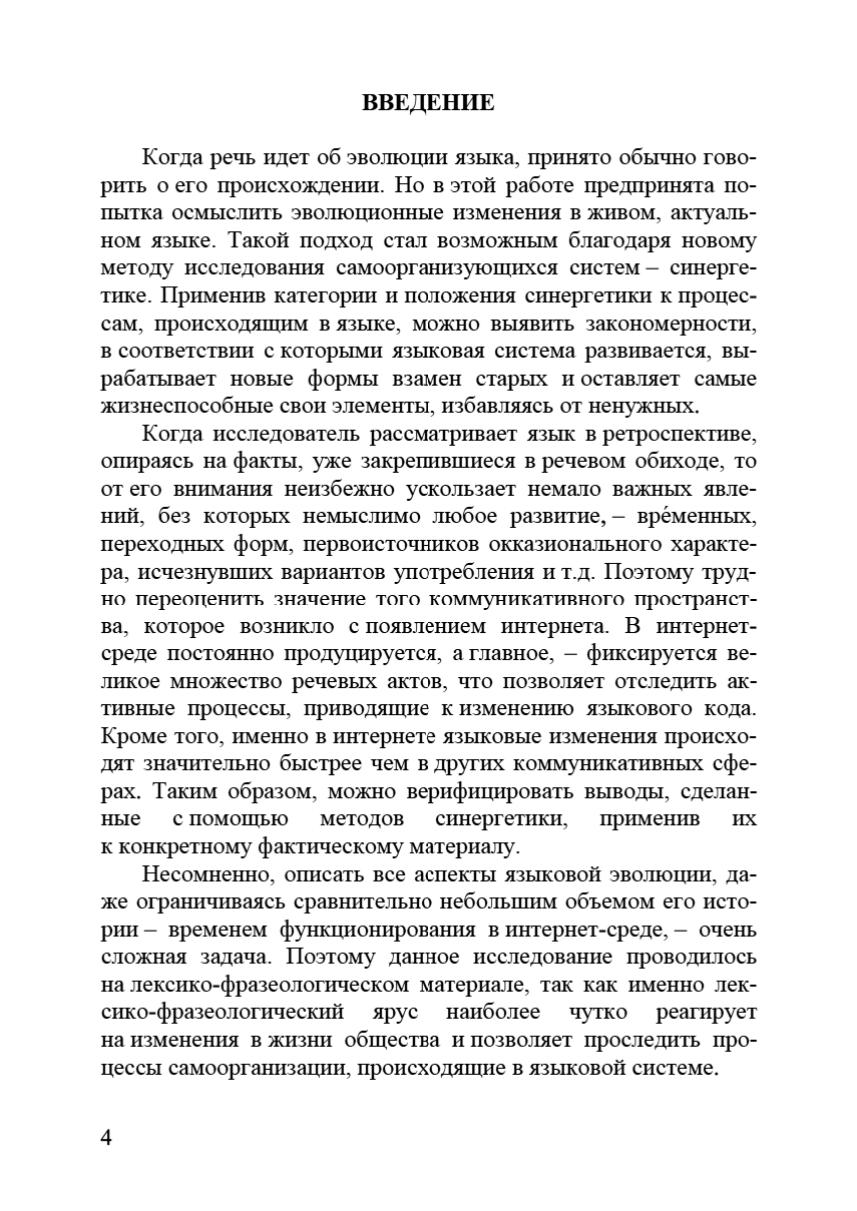 В книге на материале текстов интернет-коммуникации рассматриваются процессы самоорганизации в языковой системе, с синергетических позиций анализируются собственно языковые и экстралингвистические механизмы ее развития. Применив полученные выводы к наиболее динамичной области —лексико-фразеологическому уровню языка, автор выявляет закономерности образования лексических и фразеологических неологизмов в сфере интернет-коммуникации.