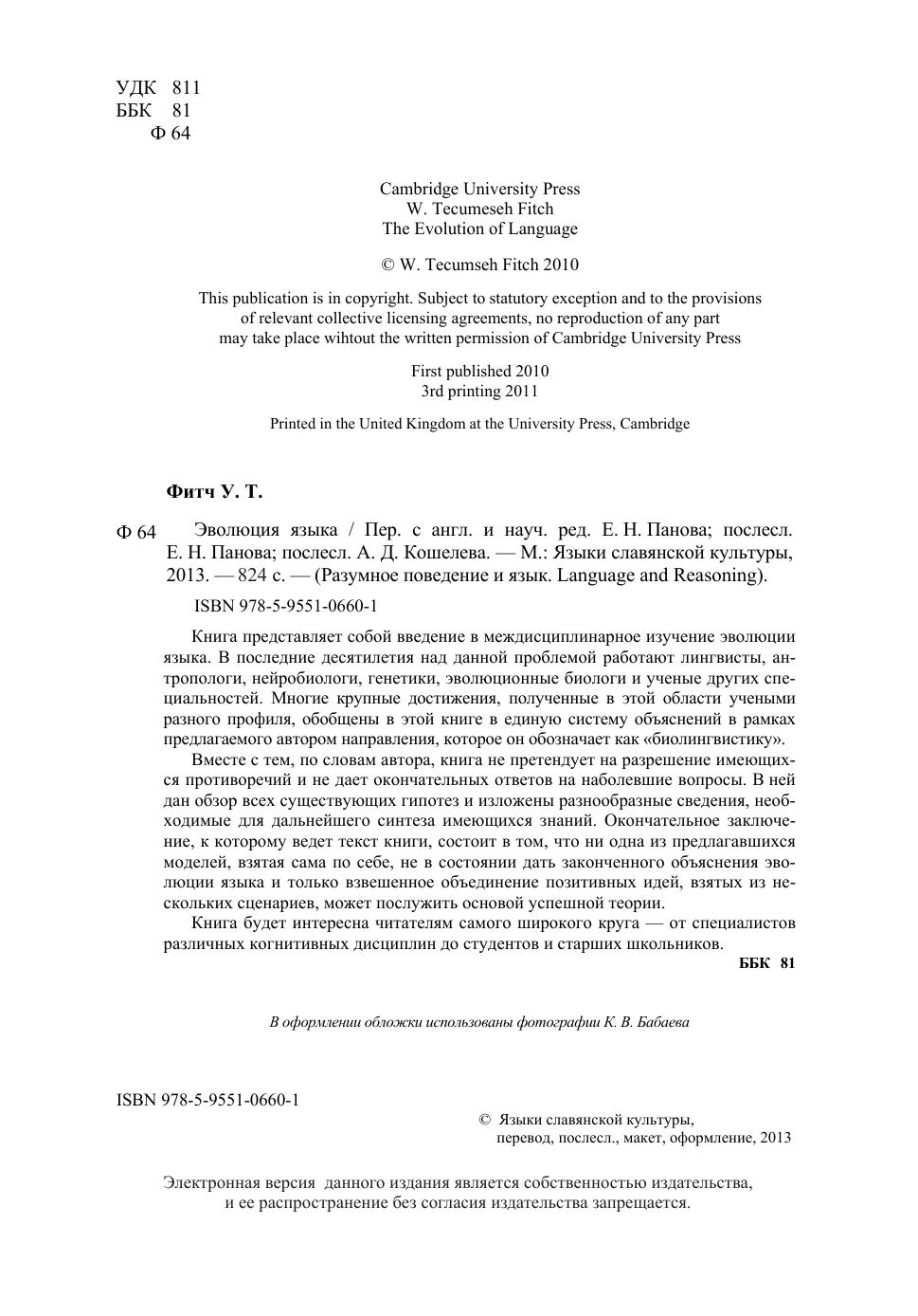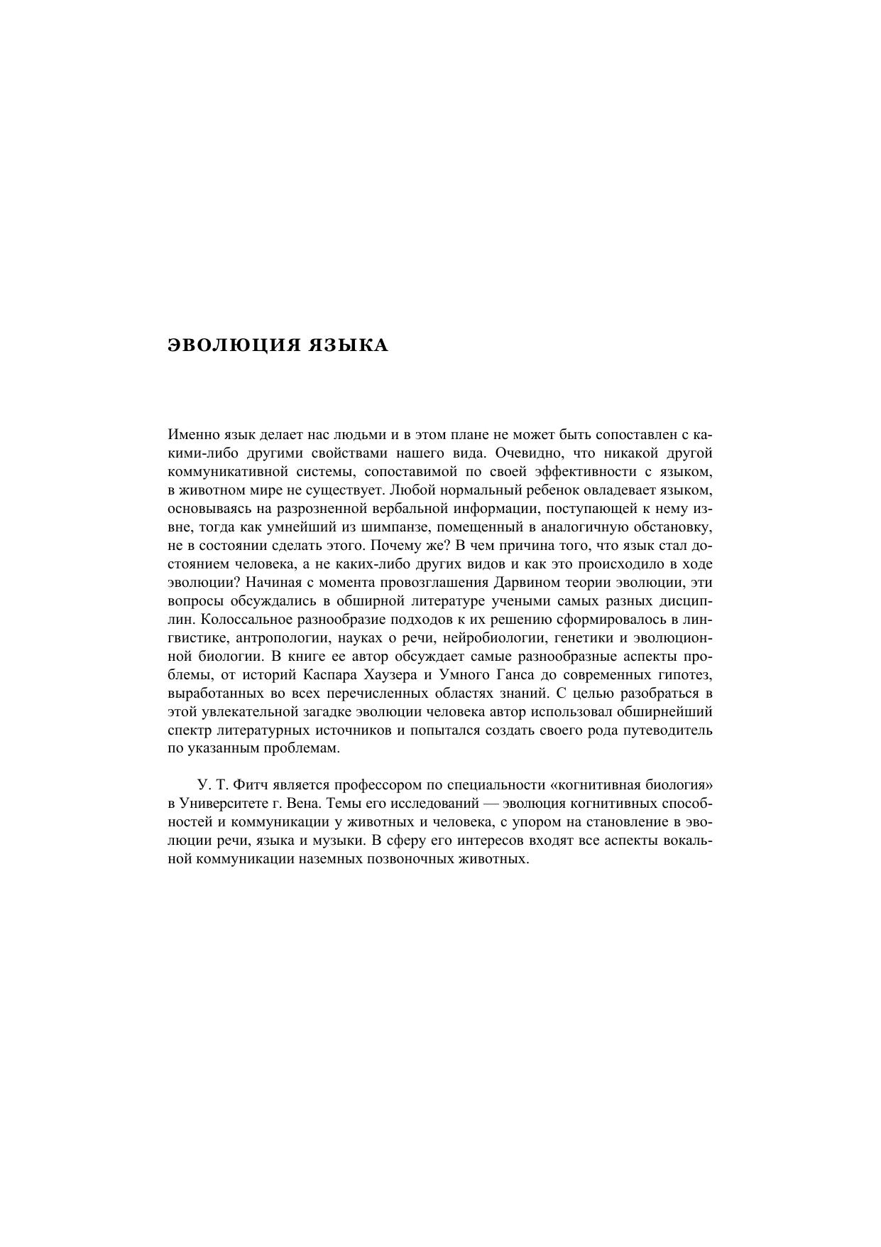 Книга представляет собой введение в междисциплинарное изучение эволюции языка. В последние десятилетия над данной проблемой работают лингвисты, антропологи, нейробиологи, генетики, эволюционные биологи и ученые других специальностей. Многие крупные достижения, полученные в этой области учеными разного профиля, обобщены в этой книге в единую систему объяснений в рамках предлагаемого автором направления, которое он обозначает как «биолингвистку». Вместе с тем, по словам автора, книга не претендует на разрешение имеющихся противоречий и не дает окончательных ответов на наболевшие вопросы. В ней дан обзор всех существующих гипотез и изложены разнообразные сведения, необходимые для дальнейшего синтеза имеющихся знаний Окончательное заключение, к которому ведет текст книги, состоит в том, что ни одна из предлагавшихся моделей, взятая сама по себе, не в состоянии дать законченного объяснения эволюции языка и только взвешенное объединение позитивных идей, взятых из нескольких сценариев, может послужить основой успешной теории. Книга будет интересна читателям самого широкого круга — от специалистов различных когнитивных дисциплин до студентов и старших школьников.
