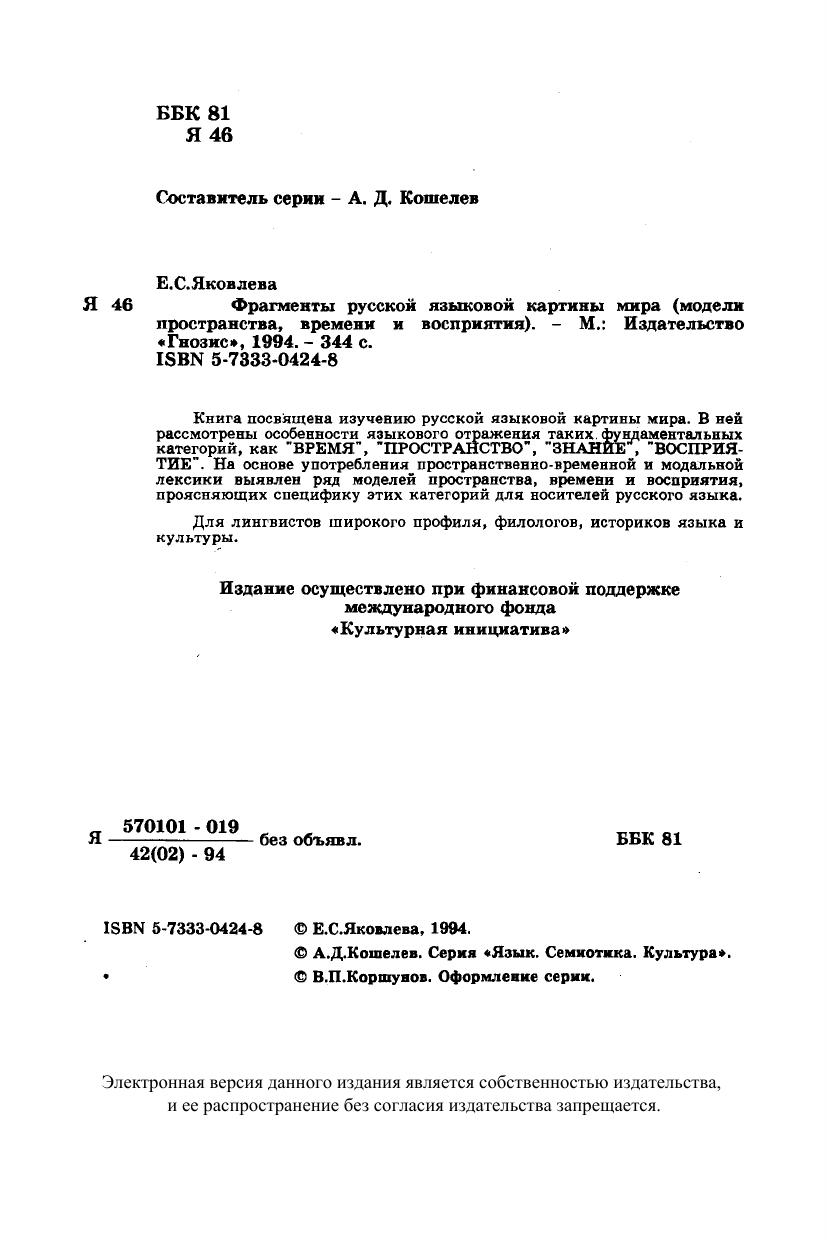 Книга посвящена изучению русской языковой картины мира. В ней рассмотрены особенности языкового отражения таких фундаментальных категорий, как «ВРЕМЯ», «ПРОСТРАНСТВО», «ЗНАНИЕ», «ВОСПРИЯТИЕ». На основе употребления пространственно-временной и модальной лексики выявлен ряд моделей пространства, времени и восприятия, проясняющих специфику этих категорий для носителей русского языка. Для лингвистов широкого профиля, филологов, историков языка и культуры.