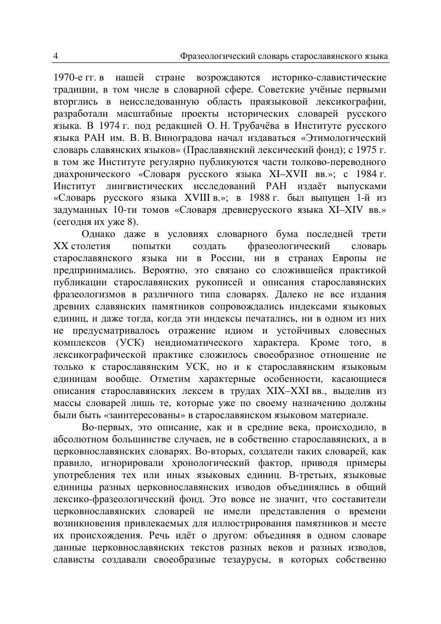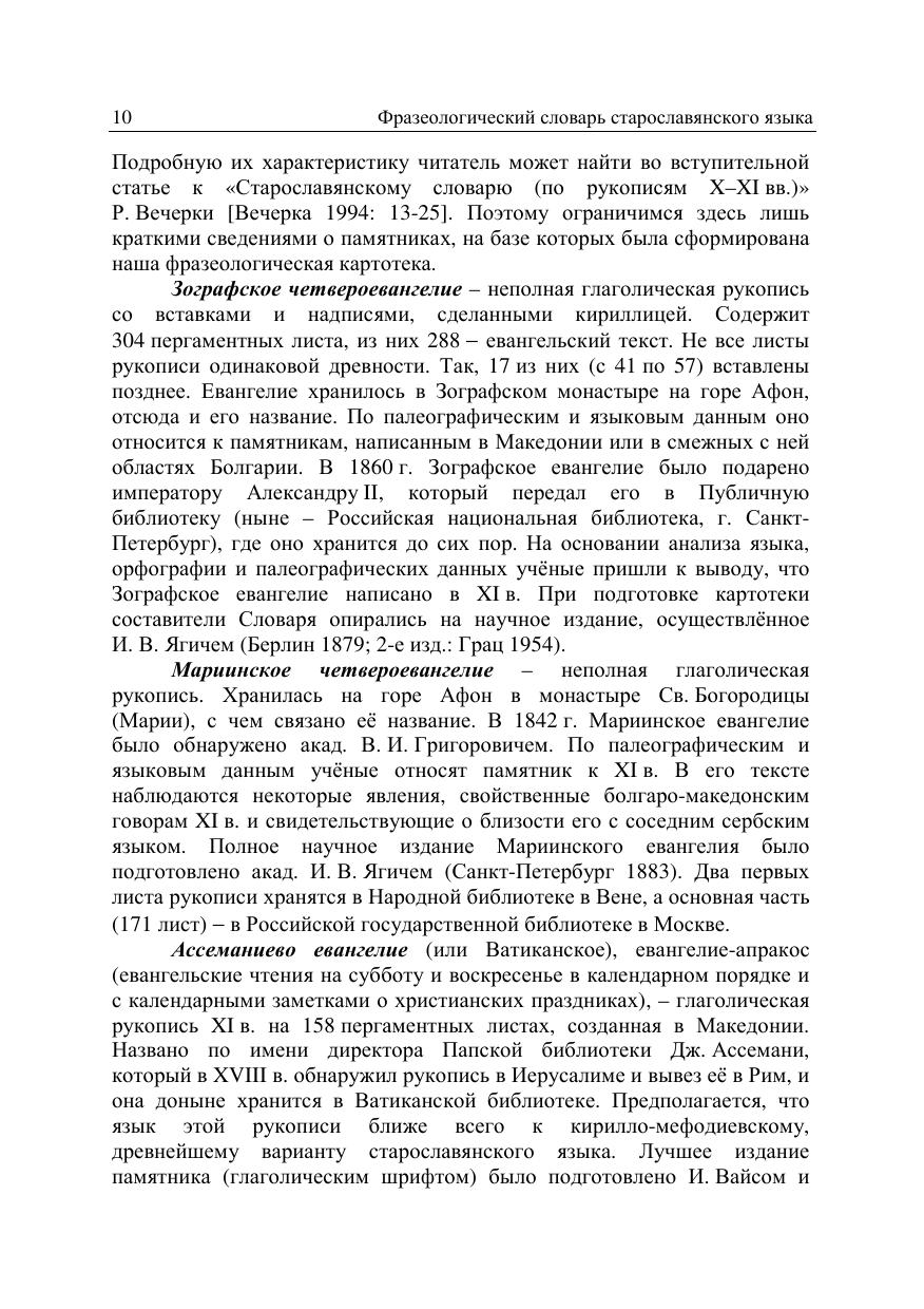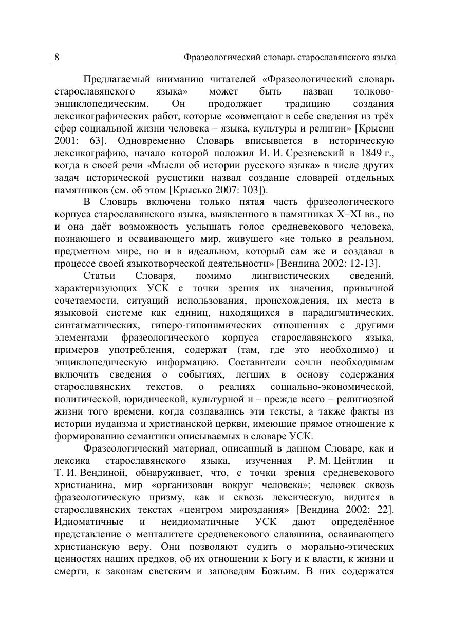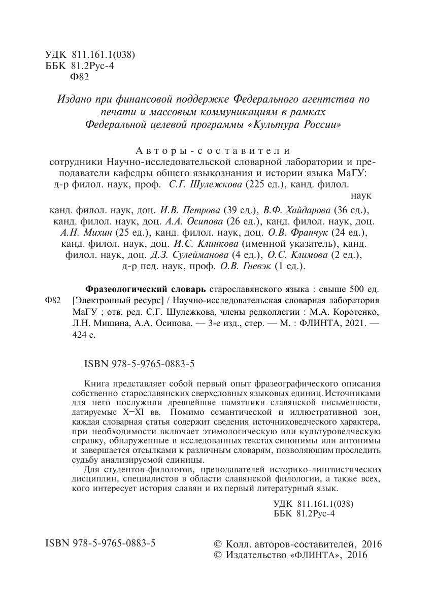 Книга представляет собой первый опыт фразеологического описания собственно старославянских сверхсловных языковых единиц. Источниками для него послужили древнейшие памятники славянской письменности, датируемые X-XI вв. Помимо семантической и иллюстративной зон, каждая словарная статья содержит сведения источниковедческого характера, при необходимости включает этимологическую или культуроведческую справку, обнаруженные в исследованных текстах синонимы или антонимы и завершается отсылками к различным словарям, позволяющим проследить судьбу анализируемой единицы.