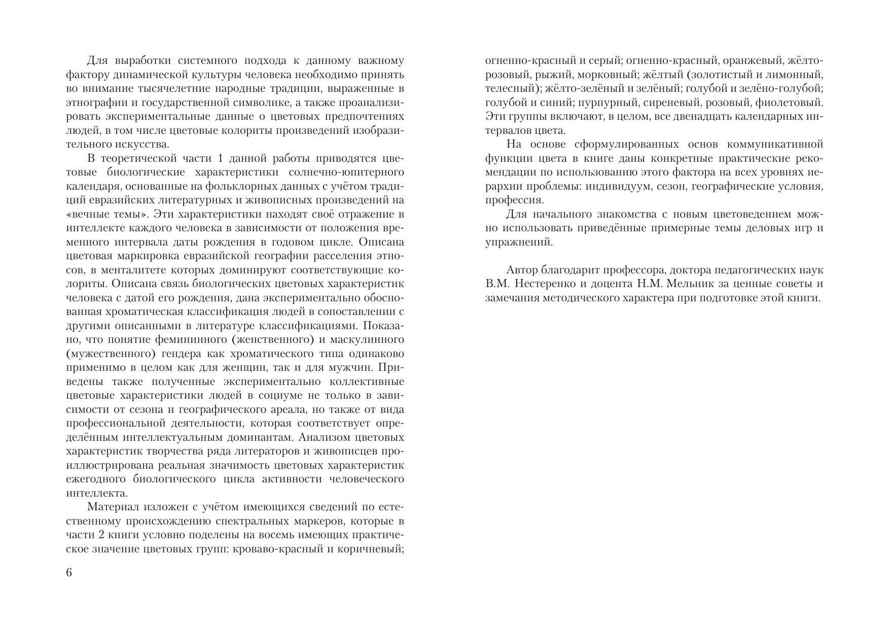 Формулируется новая теория культуры взаимодействия человека с социумом и с космосом, основанная на естественно-научной концепции света и цвета как электромагнитном волновом процессе. Даны теоретические обоснования и некоторые практические рекомендации по использованию цвета в рекламе, создании делового имиджа, подборе кадров, в деловом этикете, оформлении официальных и неофициальных мероприятий (переговоры, презентации). Представленные сведения можно использовать при изучении цветоведения, средств коммуникации, психологии, культурологии, экологии, концепций современного естествознания и в целом для расширения познаний о теории и практике древних и современных элементов цветовой культуры человека. Для широкого круга читателей.