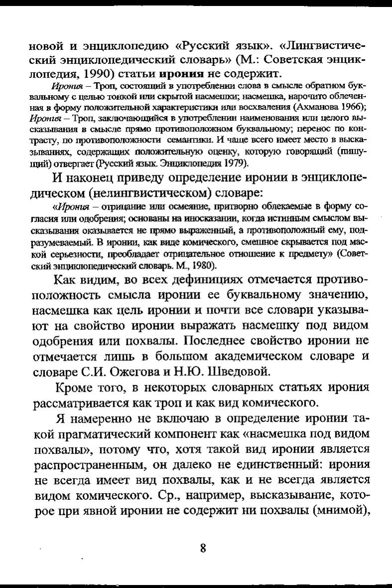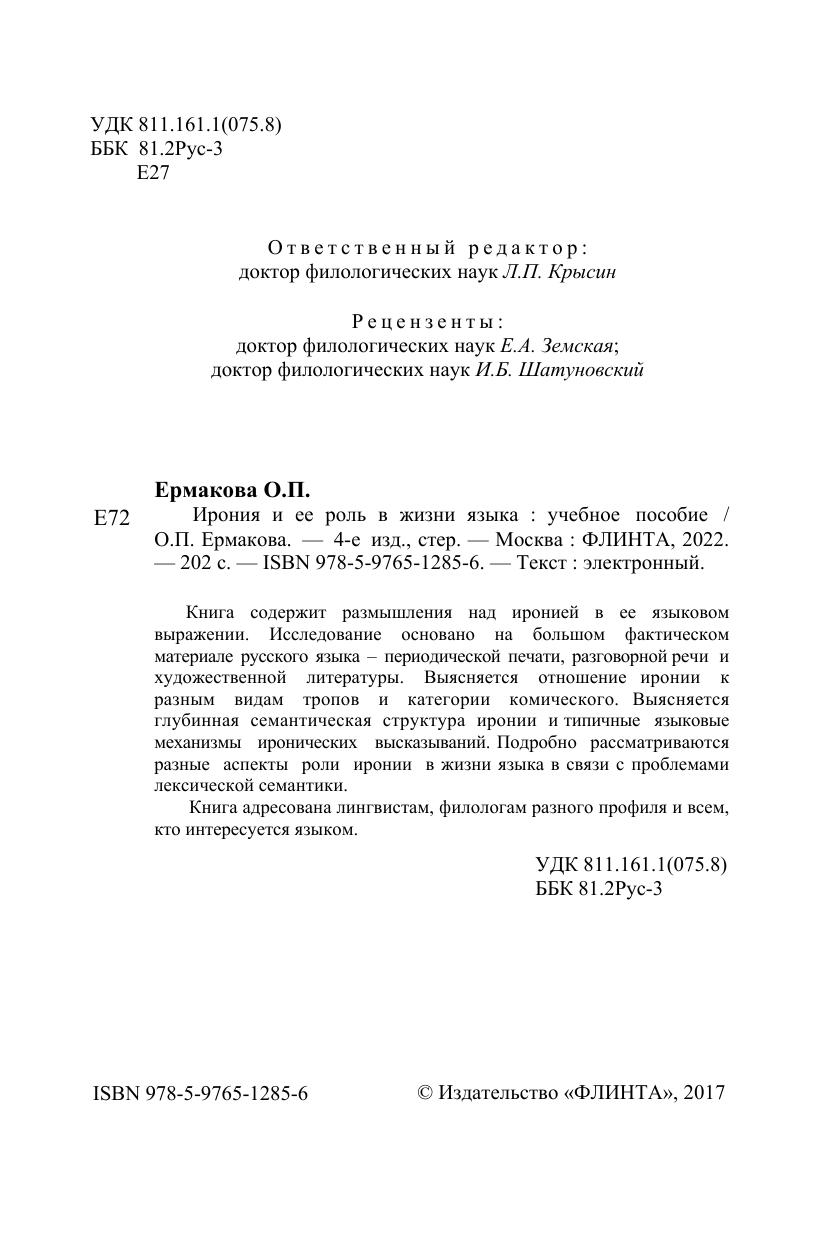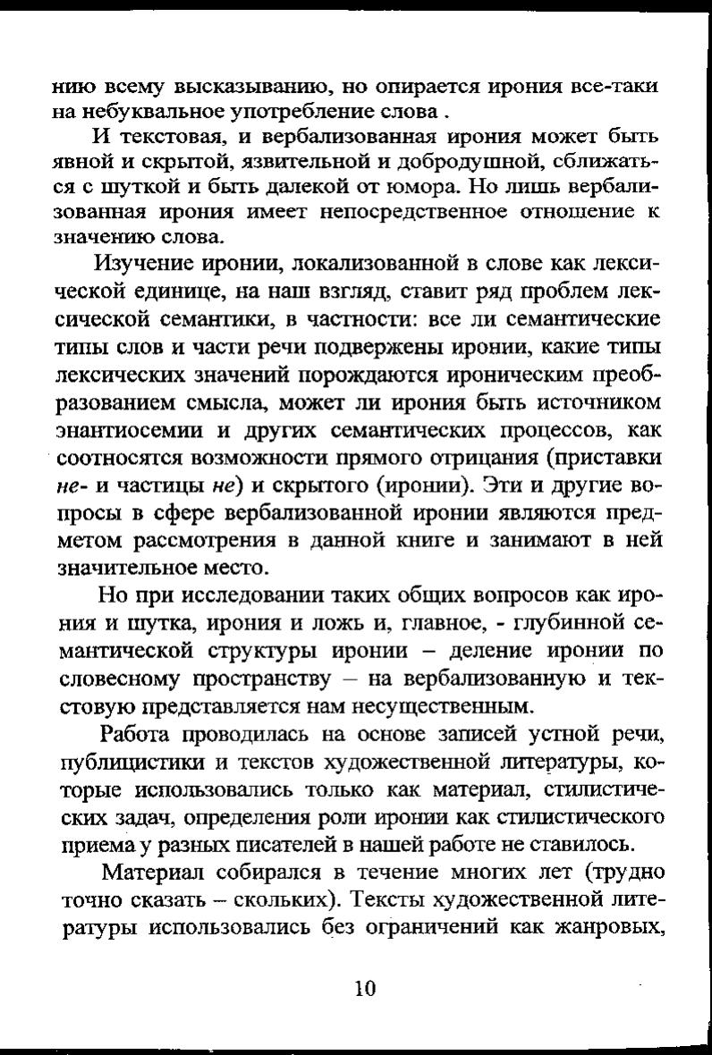 Книга содержит размышления над иронией в ее языковом выражении. Исследование основано на большом фактическом материале русского языка – периодической печати, разговорной речи и художественной литературы. Выясняется отношение иронии к разным видам тропов и категории комического. Выясняется глубинная семантическая структура иронии и типичные языковые механизмы иронических высказываний. Подробно рассматриваются разные аспекты роли иронии в жизни языка в связи с проблемами лексической семантики.