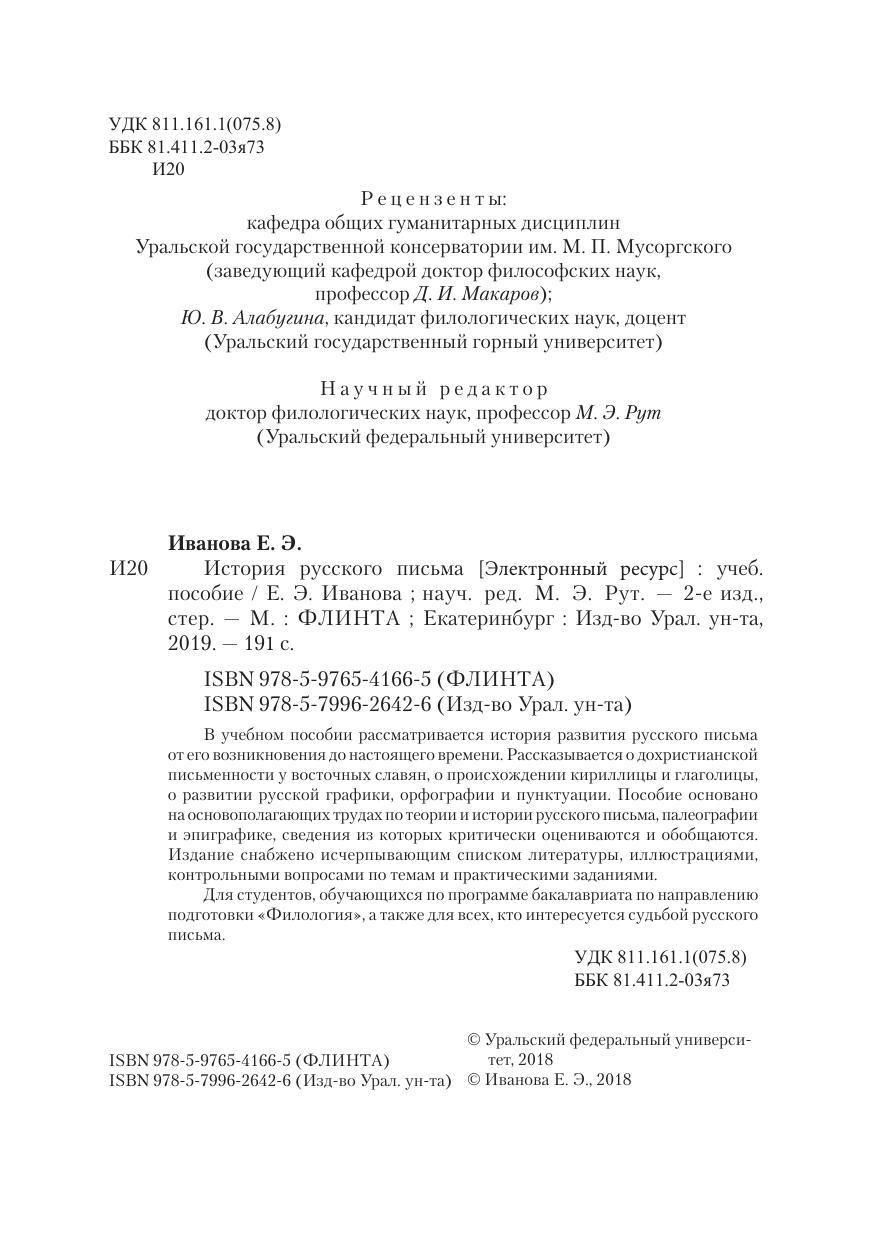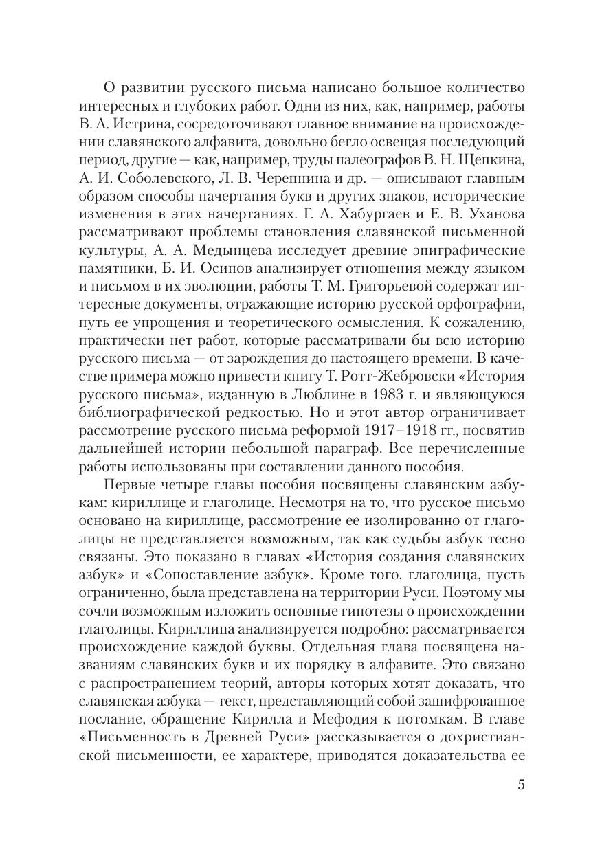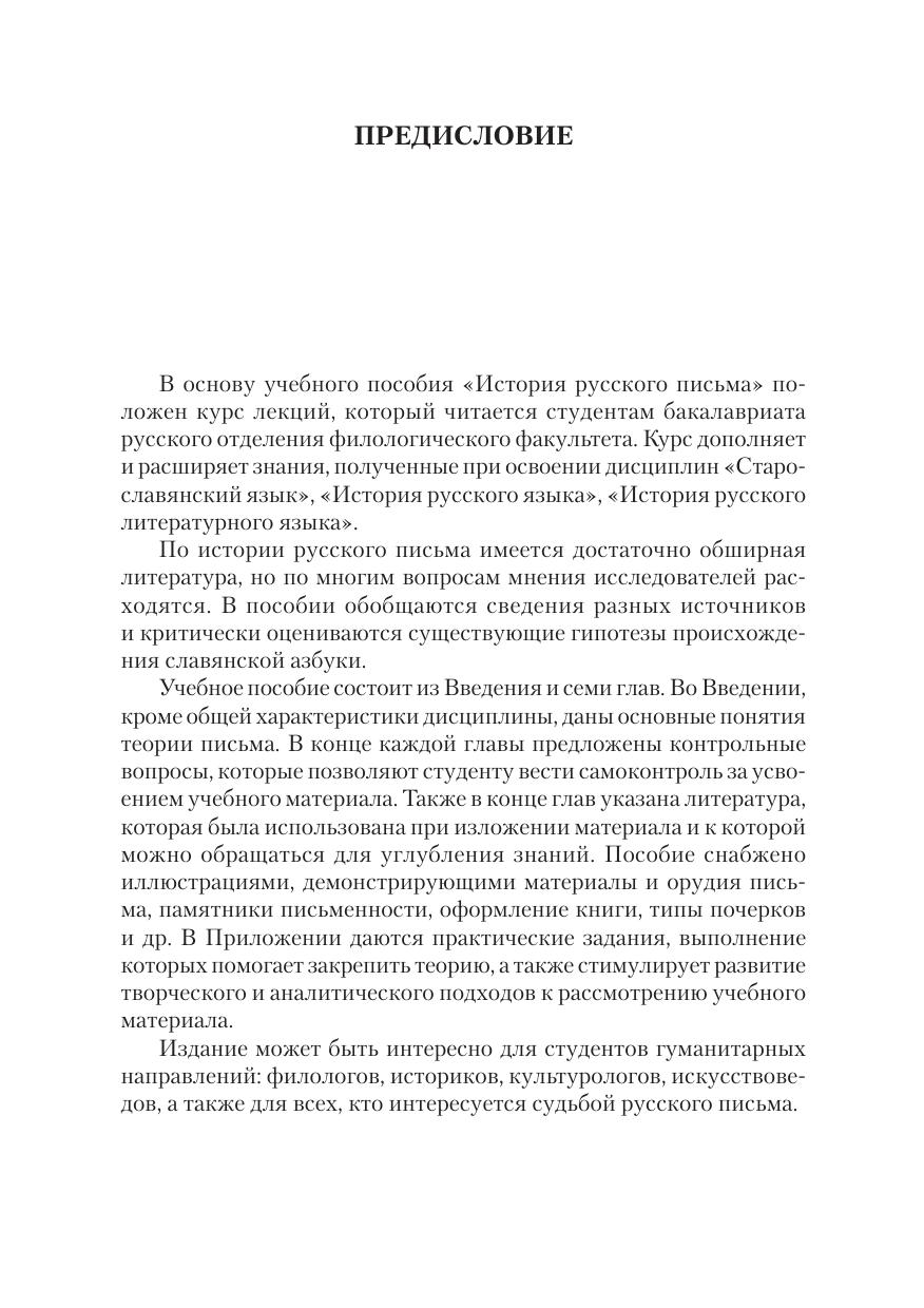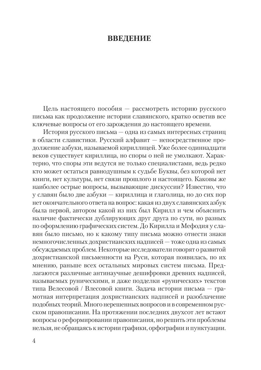 письменности у восточных славян, о происхождении кириллицы и глаголицы, о развитии русской графики, орфографии и пунктуации. Пособие основано на основополагающих трудах по теории и истории русского письма, палеографии и эпиграфике, сведения из которых критически оцениваются и обобщаются. Издание снабжено исчерпывающим списком литературы, иллюстрациями, контрольными вопросами по темам и практическими заданиями.