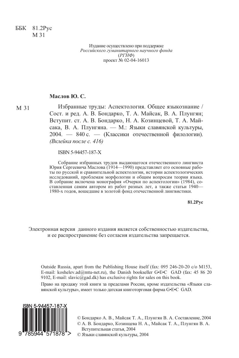 Собрание избранных трудов выдающегося отечественного лингвиста Юрия Сергеевича Маслова представляет его основные работы по русской и сравнительной аспектологии, истории аспектологических исследований, проблемам морфологии и общим вопросам теории языка. В собрание включена монография "Очерки по аспектологии" (1984), составленная самим автором из работ разных лет, а также статьи 1940-1980-х годов, вошедшие в золотой фонд отечественной лингвистики. Для научных работников, широкого круга специалистов.