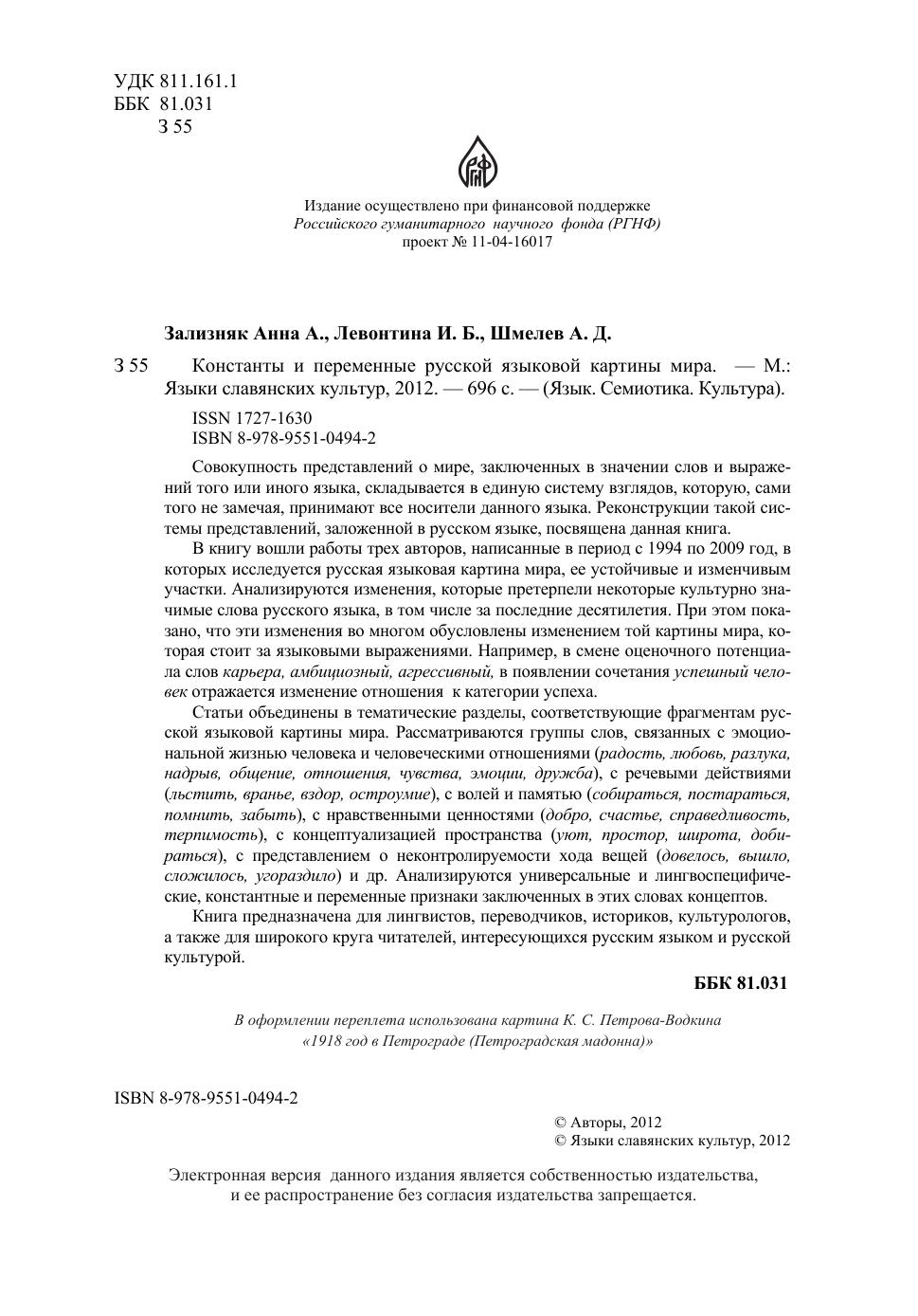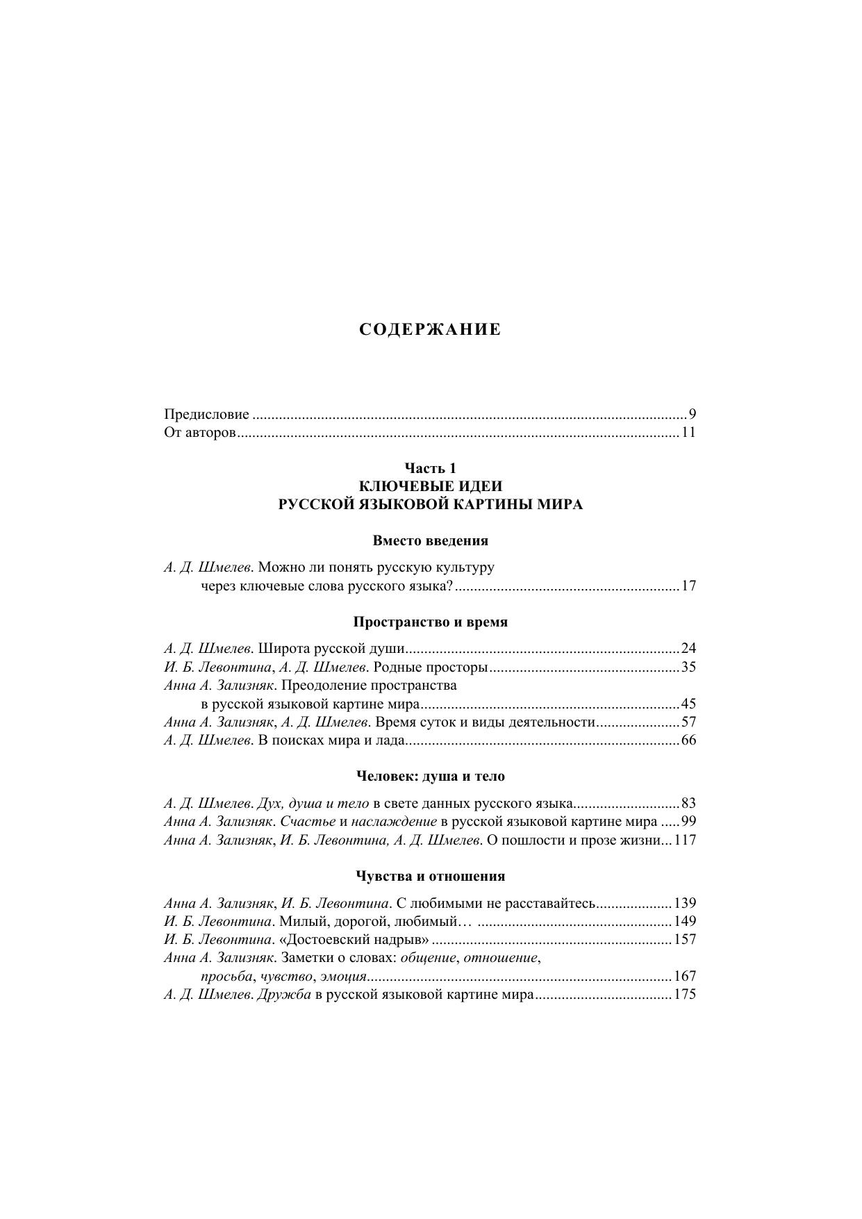 Совокупность представлений о мире, заключенных в значении слов и выражений того или иного языка, складывается в единую систему взглядов, которую, сами того не замечая, принимают все носители данного языка. Реконструкции такой системы представлений, заложенной в русском языке, посвящена данная книга. В книгу вошли работы трех авторов, написанные в период с 1994 по 2009 год, в которых исследуется русская языковая картина мира, ее устойчивые и изменчивые участки. Анализируются изменения, которые претерпели некоторые культурно значимые слова русского языка, в том числе за последние десятилетия. При этом показано, что эти изменения во многом обусловлены изменением той картины мира, которая стоит за языковыми выражениями. Например, в смене оценочного потенциала слов карьера, амбициозный, агрессивный, в появлении сочетания успешный человек отражается изменение отношения к категории успеха. Статьи объединены в тематические разделы, соответствующие фрагментам русской языковой картины...