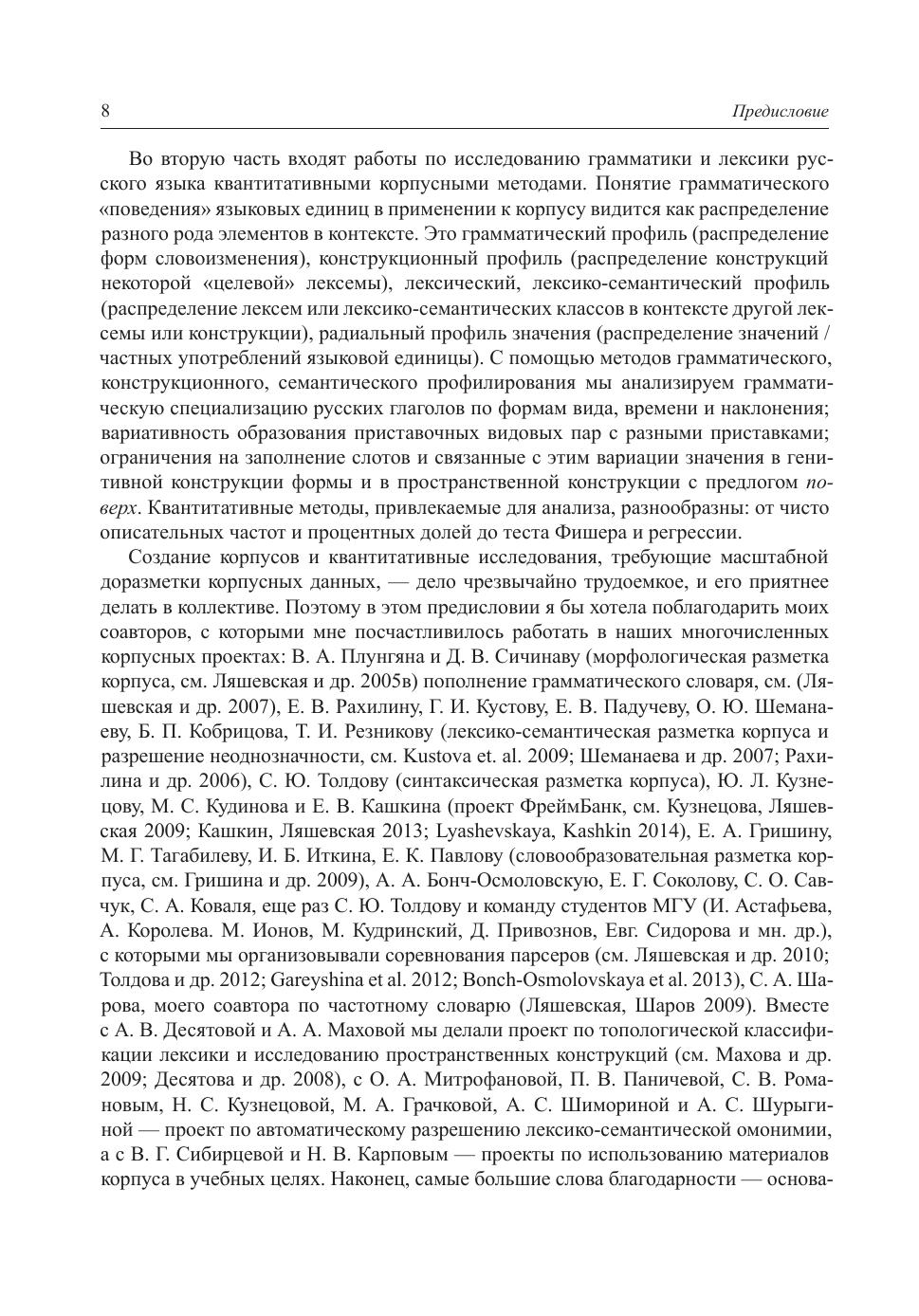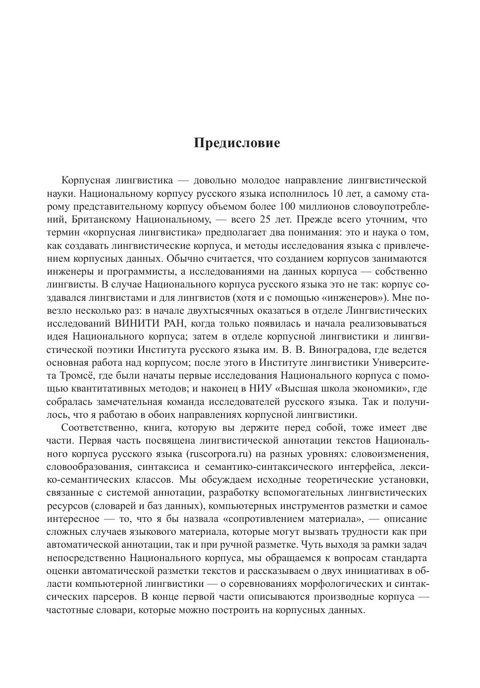 Русская корпусная лингвистика представлена в книге двумя направлениями. Первая часть содержит описание подходов и методов аннотации Национального корпуса русского языка (http://ruscorpora.ru), включая разметку лексико-грамматической, лексико-семантической, семантико-синтаксической и словообразовательной информации. Кроме того, описываются процедуры оценки инструментов автоматической разметки текстов (морфологических и синтаксических парсеров) и идеология создания двух частотных корпусных словарей, общего и лексико-грамматического. Во второй части представлены результаты исследований грамматики и лексики русского языка с применением квантитативных корпусных методов: изучение грамматических, конструкционных и семантических профилей языковых единиц, в том числе глаголов и глагольных приставок, имен существительных и пространственных конструкций.
