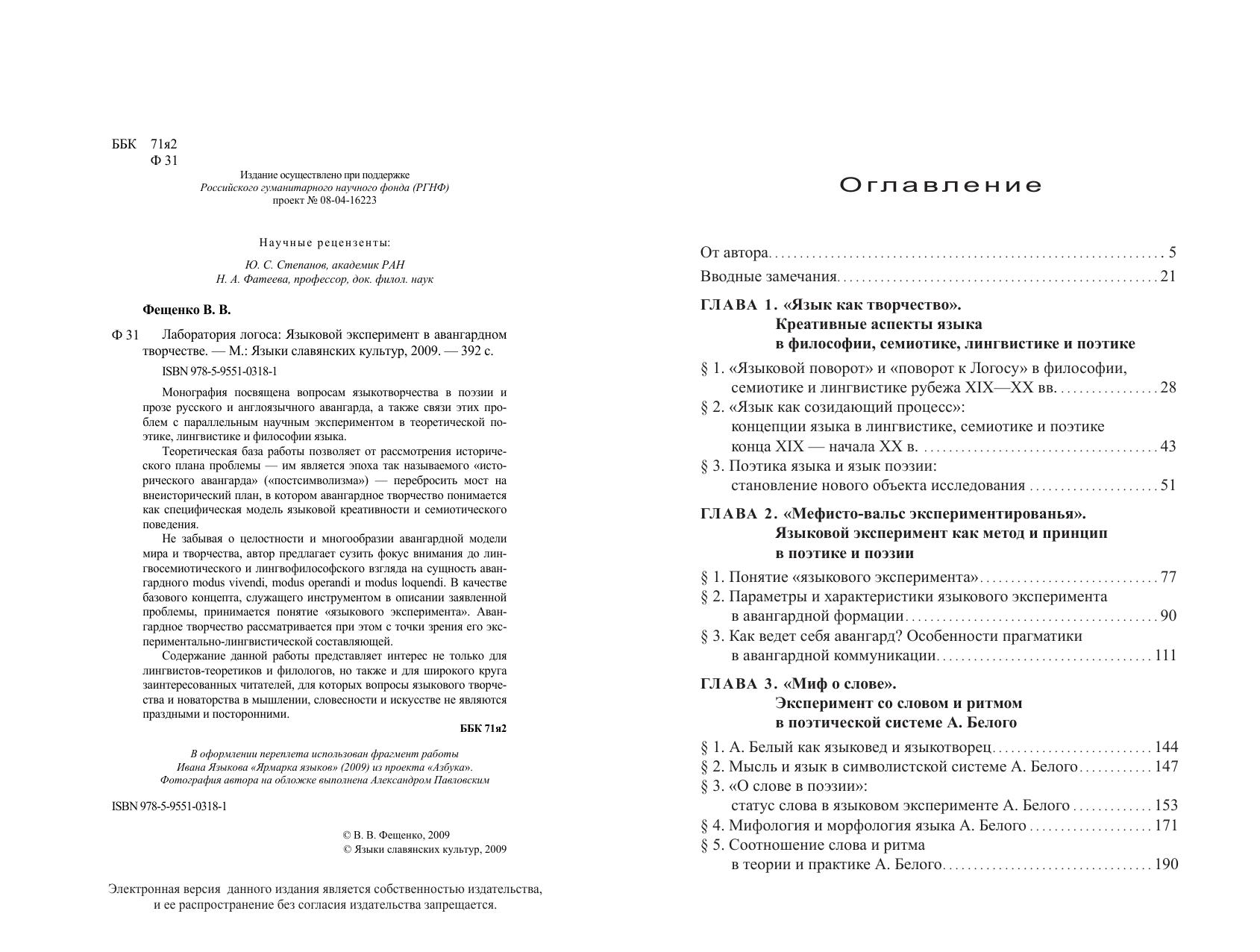 Монография посвящена вопросам языкотворчества в поэзии и прозе русского и англоязычного авангарда, а также связи с этих проблем с параллельным научным экспериментом в теоретической поэтике, лингвистике и философии языка. Не забывая о целостности и многообразии авангардной модели мира и творчества, автор предлагает сузить фокус внимания до лингвосемиотического и лингвофилософского взгляда на сущность авангардного modus vivendi, modus operandi и modus loquendi. В качестве базового концепта, служащего инструментом в описании заявленной проблемы, принимается понятие "языкового эксперимента". Авангардное творчество рассматривается при этом с точки зрения его экспериментально-лингвистической составляющей. Содержание данной работы представляет интерес не только для лингвистов-теоретиков и филологов, но также и для широкого круга заинтересованных читателей, для которых вопросы языкового творчества и новаторства в мышлении, словесности и искусстве не являются праздным и посторонними.
