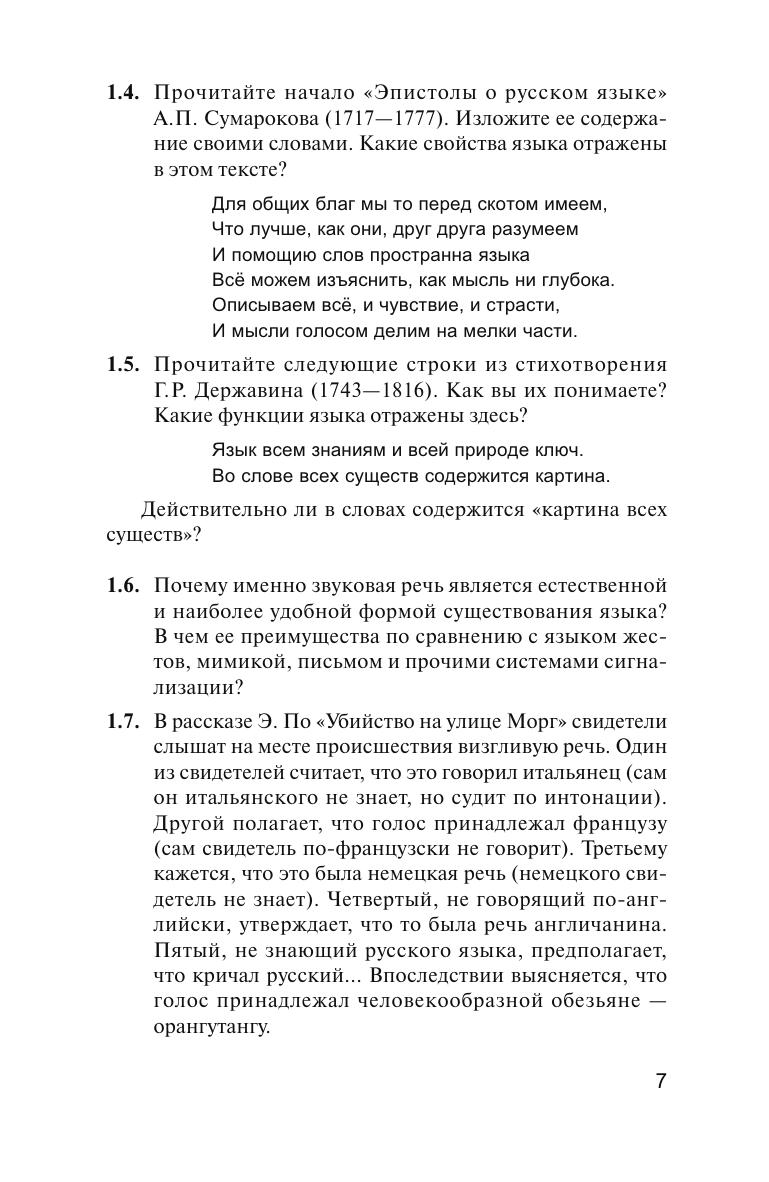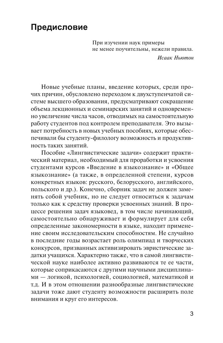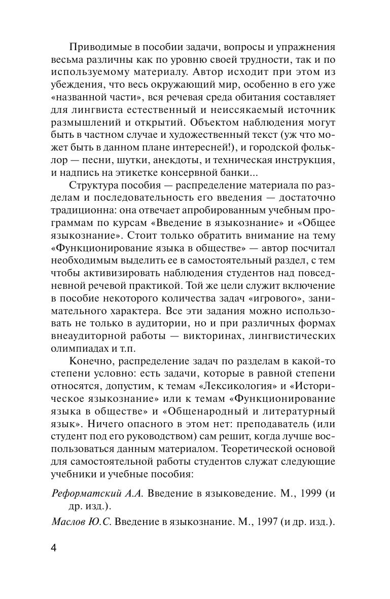 Пособие включает в себя более 1200 оригинальных лингвистических задач, основанных на материале прежде всего русского, а также западноевропейских (английского, немецкого, французского, испанского) и зарубежных славянских языков. Особое внимание уделяется «речевой среде обитания» человека: разговорной речи, фольклору, художественной литературе и т.п. Многие задачи носят занимательный характер. Представленные задачи сгруппированы по следующим семи разделам: «Природа языка. Язык как система знаков», «Функционирование языка в обществе», «Фонетика и фонология», «Лексикология», «Грамматика», «Типологическая и генеалогическая классификация языков», «Письмо, орфография, пунктуация».