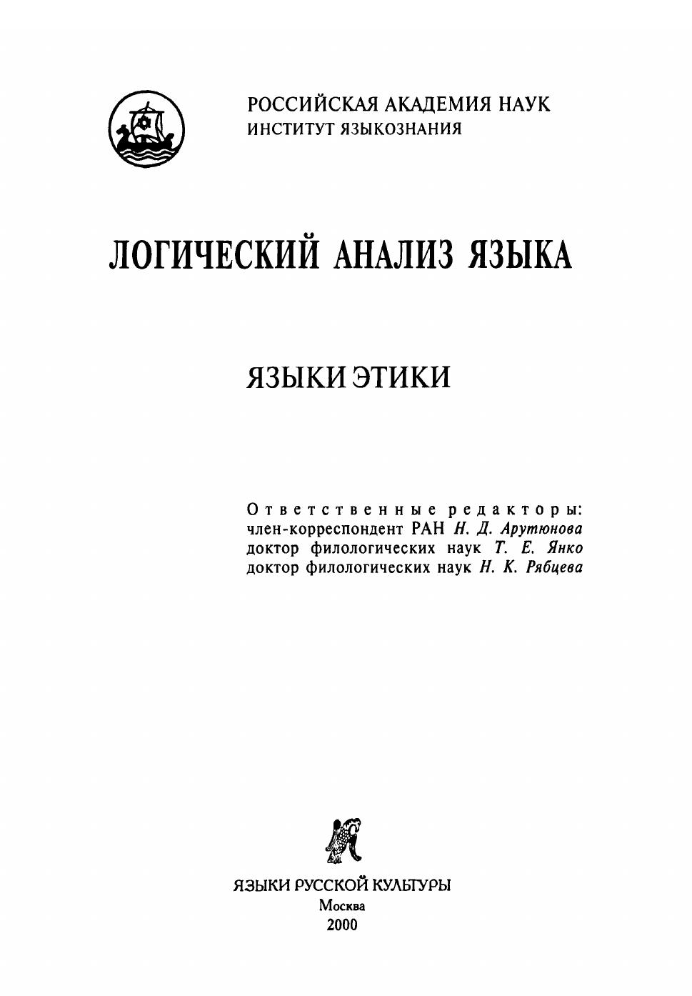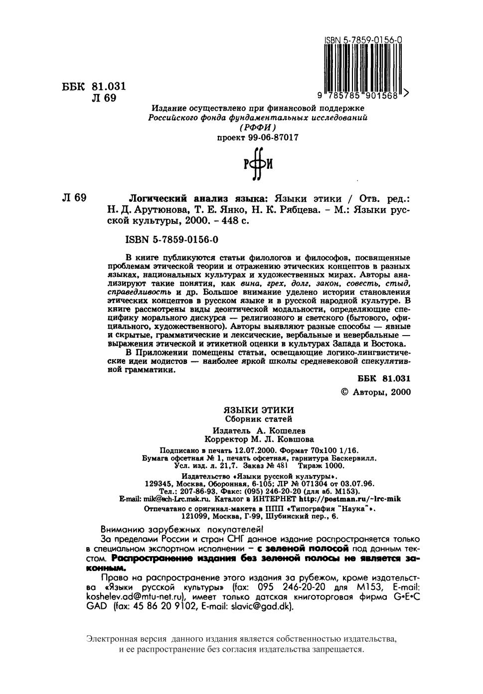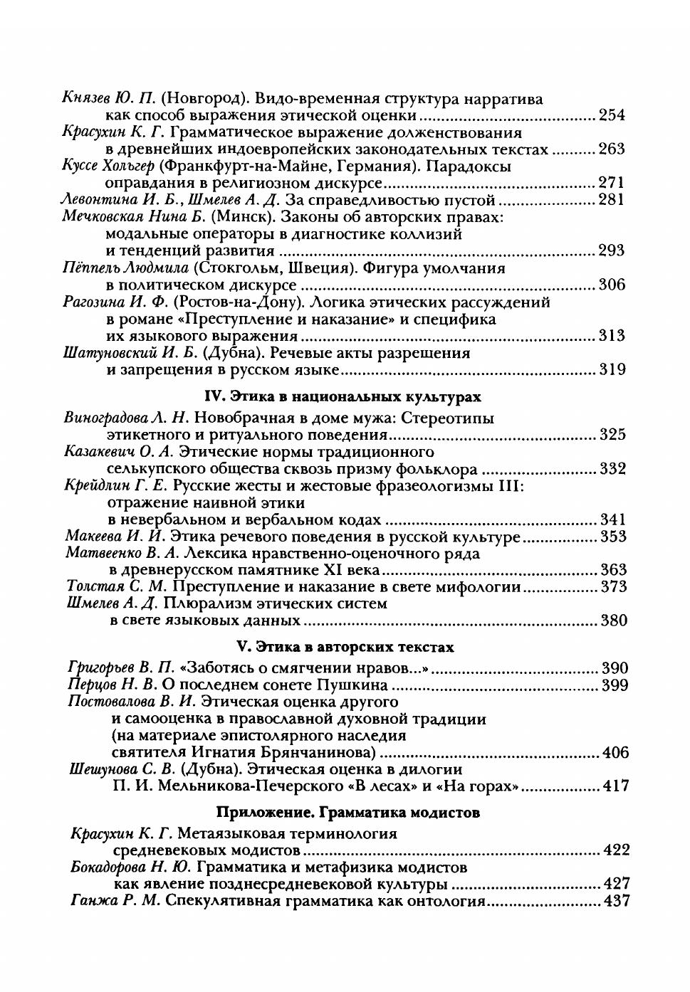 В книге публикуются статьи филологов и философов, посвященные проблемам этической теории и отражению этических концептов в разных языках, национальных культурах и художественных мирах. Авторы анализируют такие понятия, как вина, грех, долг, закон, совесть, стыд, справедливость и др. Большое внимание уделено истории становления этических концептов в русском языке и в русской народной культуре. В книге рассмотрены виды деонтической модальности, определяющие специфику морального дискурса - религиозного и светского (бытового, официального, художественного). Авторы выявляют разные способы - явные и скрытые, грамматические и лексические, вербальные и невербальные - выражения этической и этикетной оценки в культурах Запада и Востока. В Приложении помещены статьи, освещающие логико-лингвистические идеи модистов - наиболее яркой школы средневековой спекулятивной грамматики.