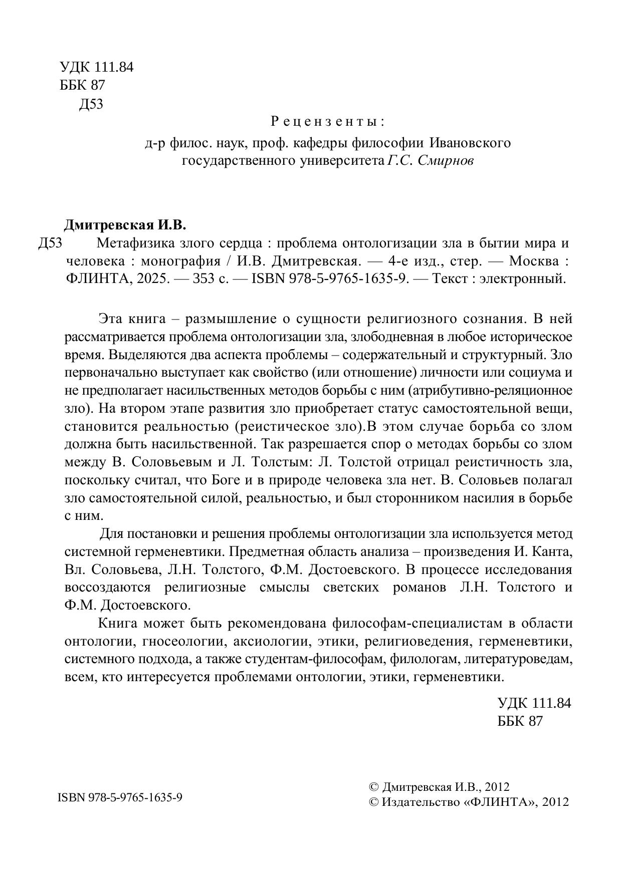 Эта книга – размышление о сущности религиозного сознания. В ней рассматривается проблема онтологизации зла, злободневная в любое историческое время. Выделяются два аспекта проблемы – содержательный и структурный. Зло первоначально выступает как свойство (или отношение) личности или социума и не предполагает насильственных методов борьбы с ним (атрибутивно-реляционное зло). На втором этапе развития зло приобретает статус самостоятельной вещи, становится реальностью (реистическое зло).В этом случае борьба со злом должна быть насильственной. Так разрешается спор о методах борьбы со злом между В. Соловьевым и Л. Толстым: Л. Толстой отрицал реистичность зла, поскольку считал, что Боге и в природе человека зла нет. В. Соловьев полагал зло самостоятельной силой, реальностью, и был сторонником насилия в борьбе с ним. Для постановки и решения проблемы онтологизации зла используется метод системной герменевтики. Предметная область анализа – произведения И. Канта, Вл. Соловьева, Л.Н. Толстого, Ф.М. Достоевского. В процессе исследования воссоздаются религиозные смыслы светских романов Л.Н. Толстого и Ф.М. Достоевского.