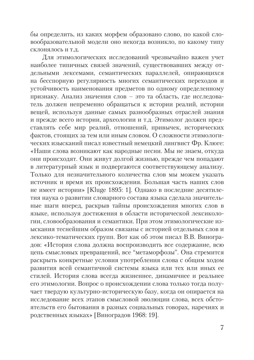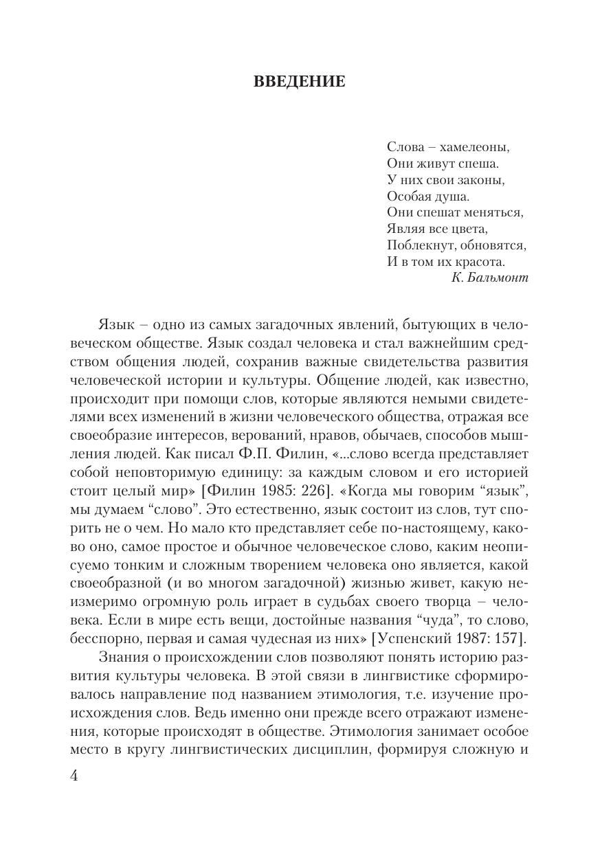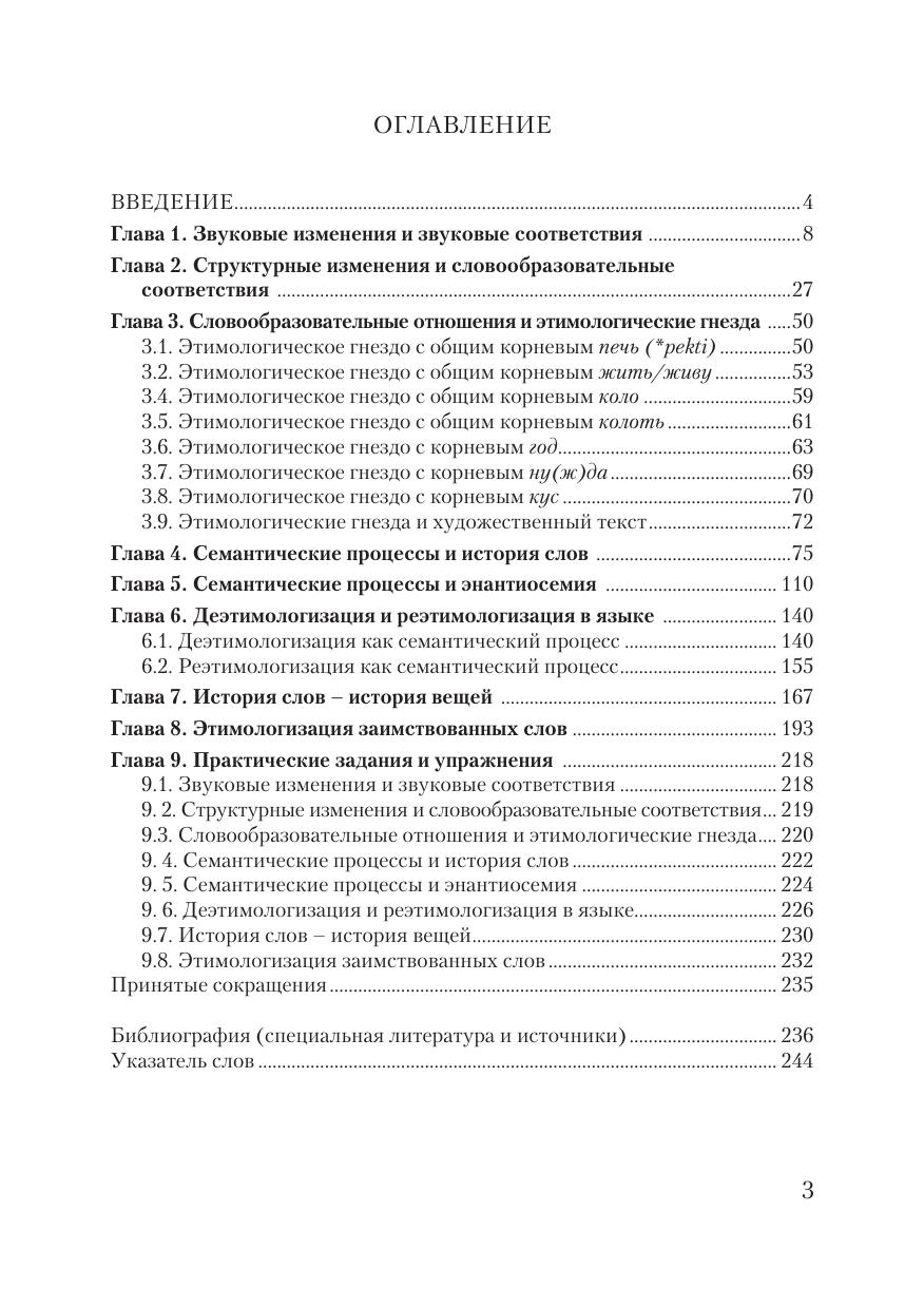 В книге подробно описывается история многих русских слов, объяс- няется их происхождение, изменения в фонетическом облике и семантике, связанные с действием языковых законов. Даются описания этимологий некоторых слов с привлечением материала других языков: балтийских, германских и романских. Особое внимание уделяется такому явлению в семантическом развитии слова, как энантиосемия. Пособие предназначе-но для изучения в вузовской аудитории разделов по этимологии в курсах: «Лексикология русского языка», «Введение в языкознание», «Историческая грамматика», а также спецкурсов: «Основные принципы этимологического анализа», «Метаморфы общественного сознания и их отражениие в слове», «История слов».