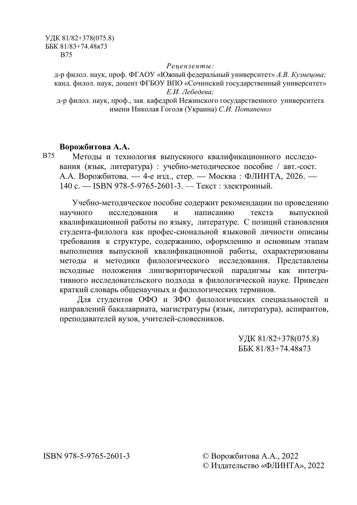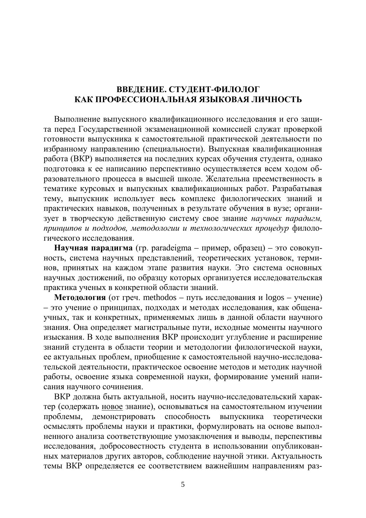 Учебно-методическое пособие содержит рекомендации по проведению научного исследования и написанию текста выпускной квалификационной работы по языку, литературе. С позиций становления студентафилолога как профессиональной языковой личности описаны требования к структуре, содержанию, оформлению и основным этапам выполнения выпускной квалификационной работы, охарактеризованы методы и методики филологического исследования. Представлены исходные положения лингвориторической парадигмы как интегративного исследовательского подхода в филологической науке. Приведен краткий словарь общенаучных и филологических терминов. Для студентов ОФО и ЗФО филологических специальностей и направлений бакалавриата, магистратуры (язык, литература), аспирантов, преподавателей вузов, учителейсловесников. ©