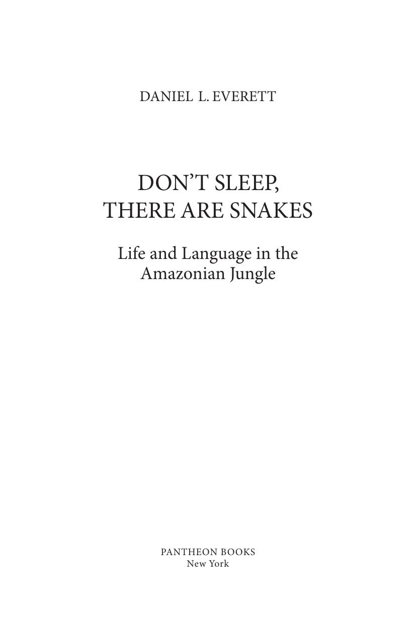 «Не спи – кругом змеи! Быт и язык индейцев амазонских джунглей» (2008) - рассказ Дэниела Эверетта о его жизни среди индейцев народности пираха в джунглях Амазонии. Молодой лингвист и миссионер отправился в Бразилию со всей семьей, чтобы перевести на язык пираха Библию и обратить индейцев в христианство. Пираха не отмечают смену дня и ночи и не знают частной собственности, в их языке нет числительных, устоявшихся цветообозначений, понятий «право» и «лево» и сложных предложений. Общение с пираха, интерес к их образу жизни, культуре и языку - полностью изменили представления Эверетта о науке и религии. В результате он, желавший привести индейцев к вере, утратил веру сам и посвятил жизнь лингвистическим исследованиям. Как языковед, он часто подвергает сомнению признанные и распространенные теории о языковой компетенции и языке как инстинкте, и его труды - включая и этот - постоянно вызывают жаркие споры. Эта книга, которую можно отнести одновременно и к мемуарам, и к лингвистическим работам, представляет собой интересный взгляд на природу языка, его связь с мышлением и культурой.