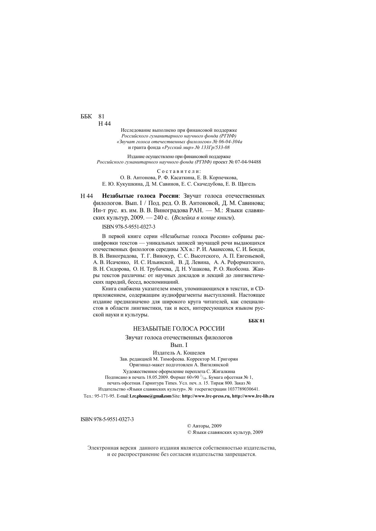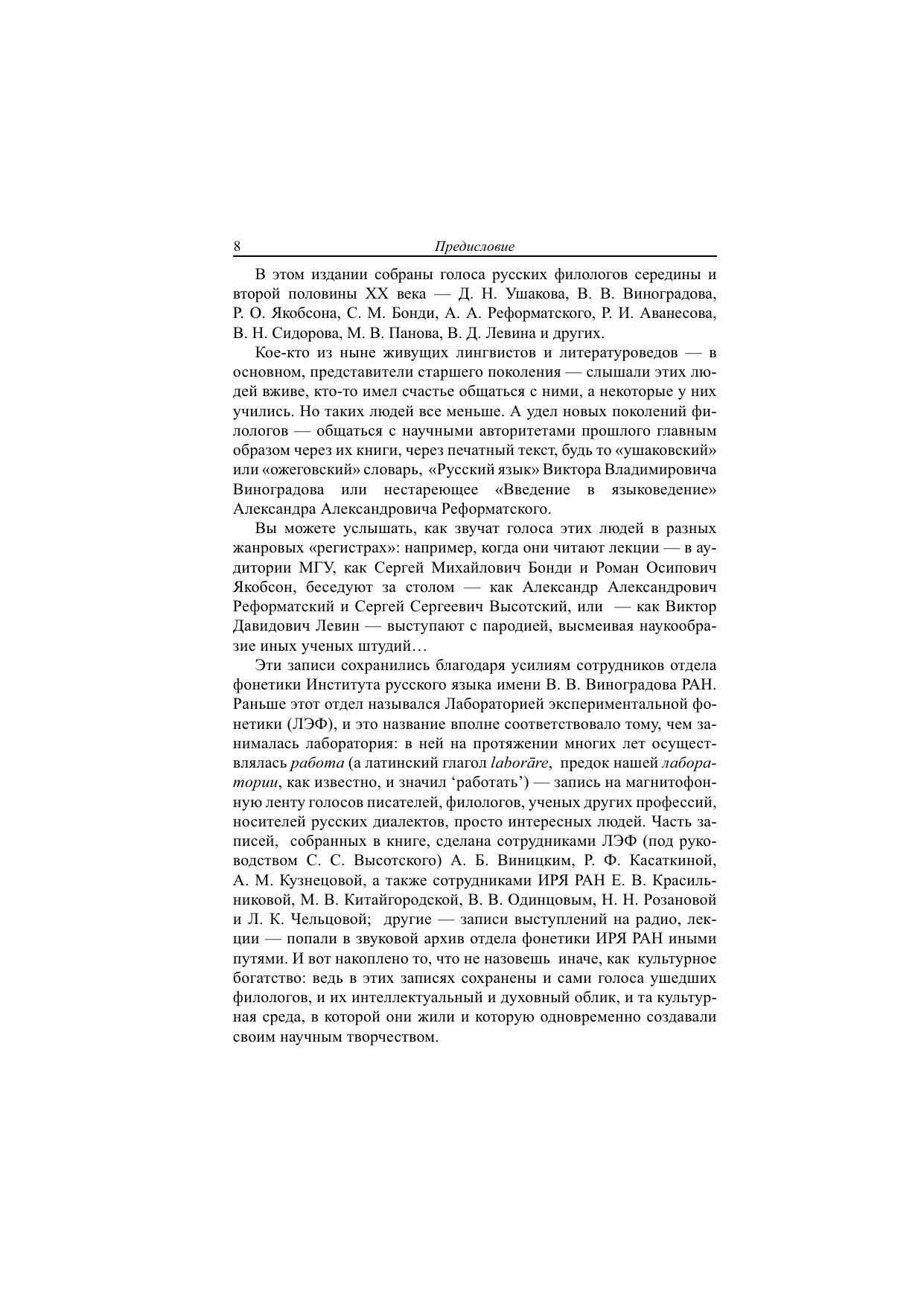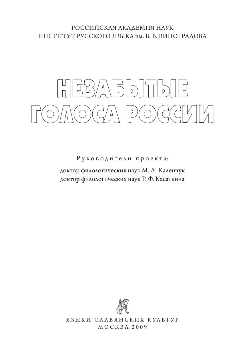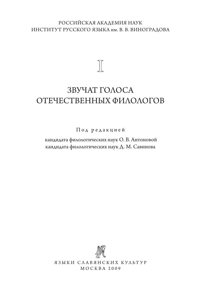 В первой книге серии «Незабытые голоса России» собраны расшифровки текстов — уникальных записей звучащей речи выдающихся отечественных филологов середины XX в.: Р. И. Аванесова, С. И. Бонда, В. В. Виноградова, Т. Г. Винокур, С. С. Высотского, А. П. Евгеньевой, A. В. Исаченко, И. С. Ильинской, В. Д. Левина, А. А. Реформатского, B. И. Сидорова, О. И. Трубачева, Д. И. Ушакова, Р. О. Якобсона. Жанры текстов различны: от научных докладов и лекций до лингвистических пародий, бесед, воспоминаний. Книга снабжена указателем имен, упоминающихся в текстах, и CD-приложением, содержащим аудиофрагменты выступлений. Настоящее издание предназначено для широкого круга читателей, как специалистов в области лингвистики, так и всех, интересующихся языком русской науки и культуры.