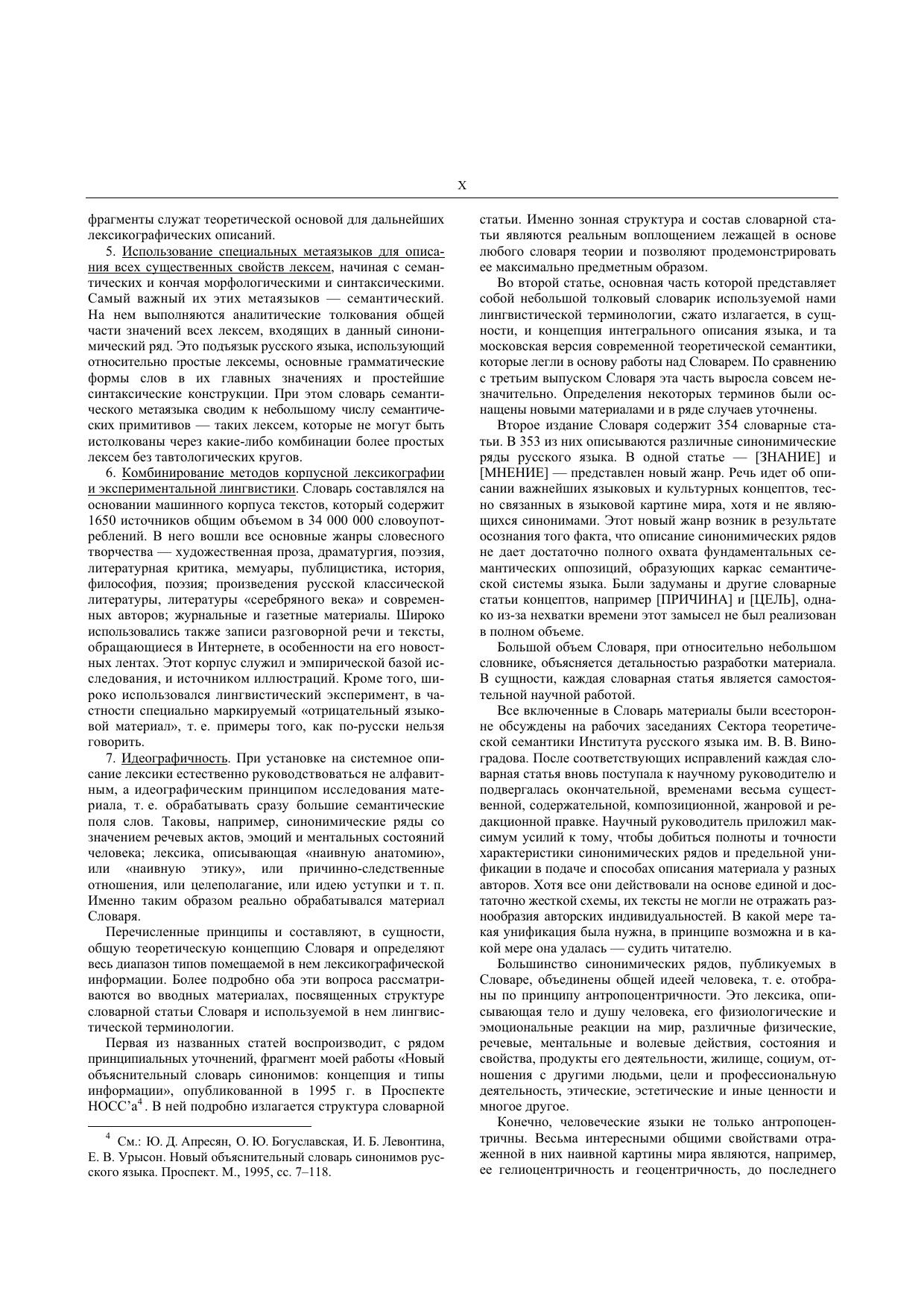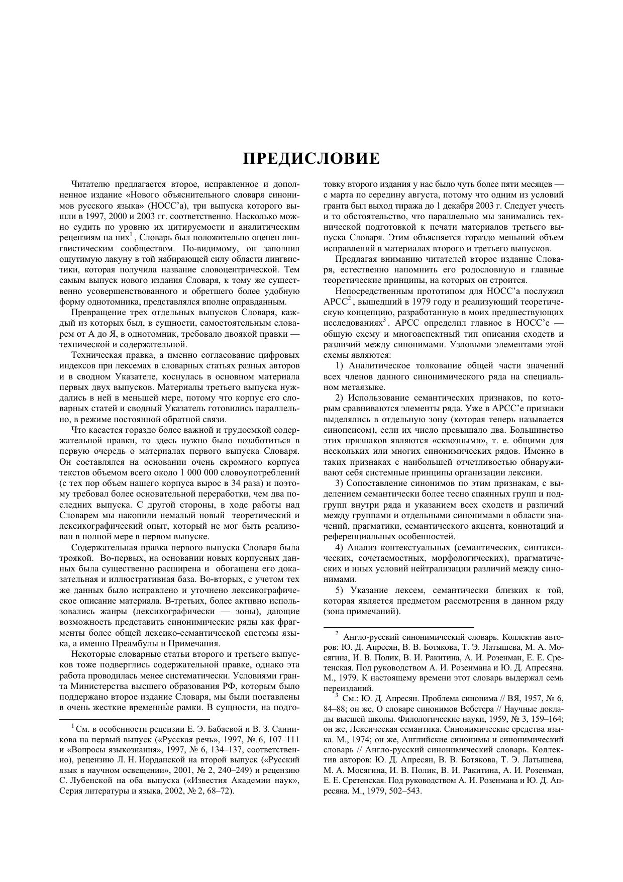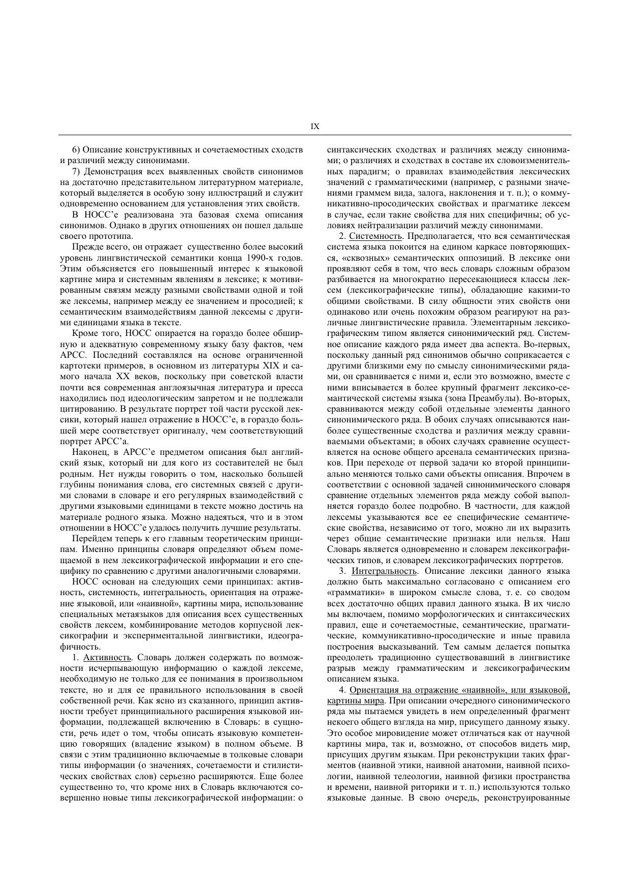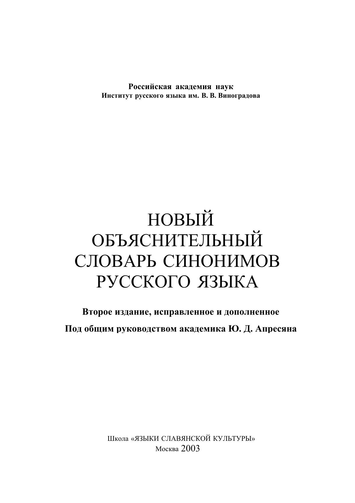 В предлагаемом Словаре публикуются 354 синонимических ряда, представляющих основные разряды антропоцентрической лексики русского языка и – эпизодически – некоторые другие пласты лексики. Новый объяснительный словарь синонимов – это словарь активного типа, согласованный с определенным грамматическим описанием русского языка, реализующий принципы системной лексикографии и ориентированный на отражение языковой, или «наивной», картины мира. Установка на детальное лингвистическое портретирование сочетается в нем с установкой на единообразное описание лексем, относящихся к одному лексикографическому типу. В Словаре последовательно отражаются семантические, референциальные, прагматические, коннотативные, коммуникативные, синтаксические, сочетаемостные, морфологические и просодические сходства и различия между синонимами, а также условия нейтрализации различий. Все словарные статьи содержат обширные справочные зоны, в которых перечисляются фразеологические синонимы, аналоги, точные и неточные конверсивы, конверсивы к аналогам, точные и неточные антонимы и дериваты (включая семантические) к элементам данного синонимического ряда. В некоторых случаях указываются специальные лингвистические работы, посвященные одной или нескольким лексемам, входящим в данный ряд. Книга обращена к широкому кругу филологов, интересующихся лексикологией, лексикографией и теоретической семантикой, к преподавателям русского языка как родного, неродного или иностранного, а также к писателям, журналистам, редакторам и представителям других профессий, имеющих дело с русским языком как объектом изучения или орудием их работы.