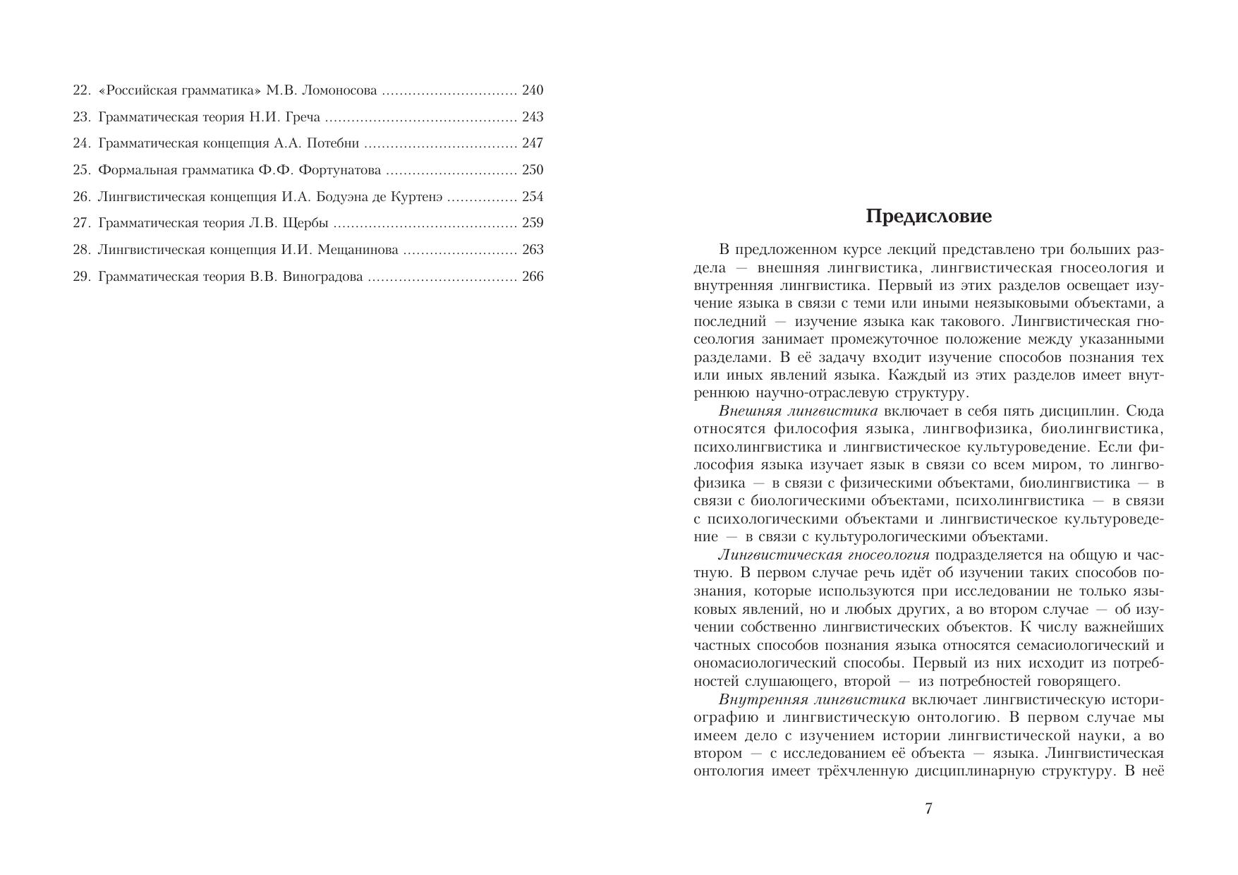 Курс лекций состоит из двух частей - общего языкознания и истории языкознания. Первая из них посвящена рассмотрению вопросов, связанных с тремя разделами языкознания: внешней лингвистикой, лингвистической гносеологией и внутренней лингвистикой. Во внешней лингвистике язык рассматривается в связи с четырьмя видами объектов: физическими, биологическими, психологическими и культурологическими. Во внутренней лингвистике, напротив, он рассматривается независимо от экстралингвистической действительности. Лингвистическая гносеология направлена на изучение вопросов, связанных с описанием общенаучных и собственно лингвистических подходов к исследованию языковых явлений. Во второй части курса анализируются концепции наиболее выдающихся представителей лингвистической науки.